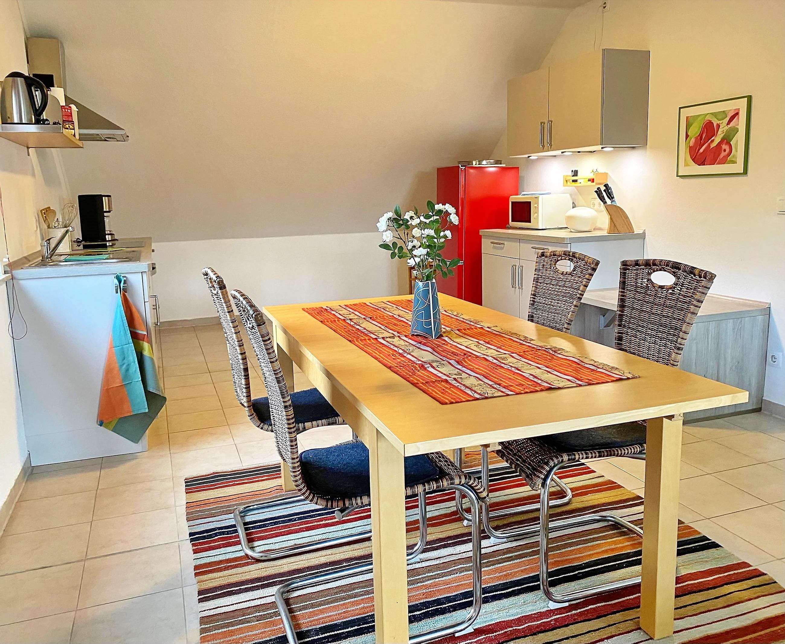 - Küche: vollausgestattet, Kühlschrank mit Gefrieraufsatz, Herd mit Ceranfeld, Backofen, Mikrowelle und Geschirrspüler