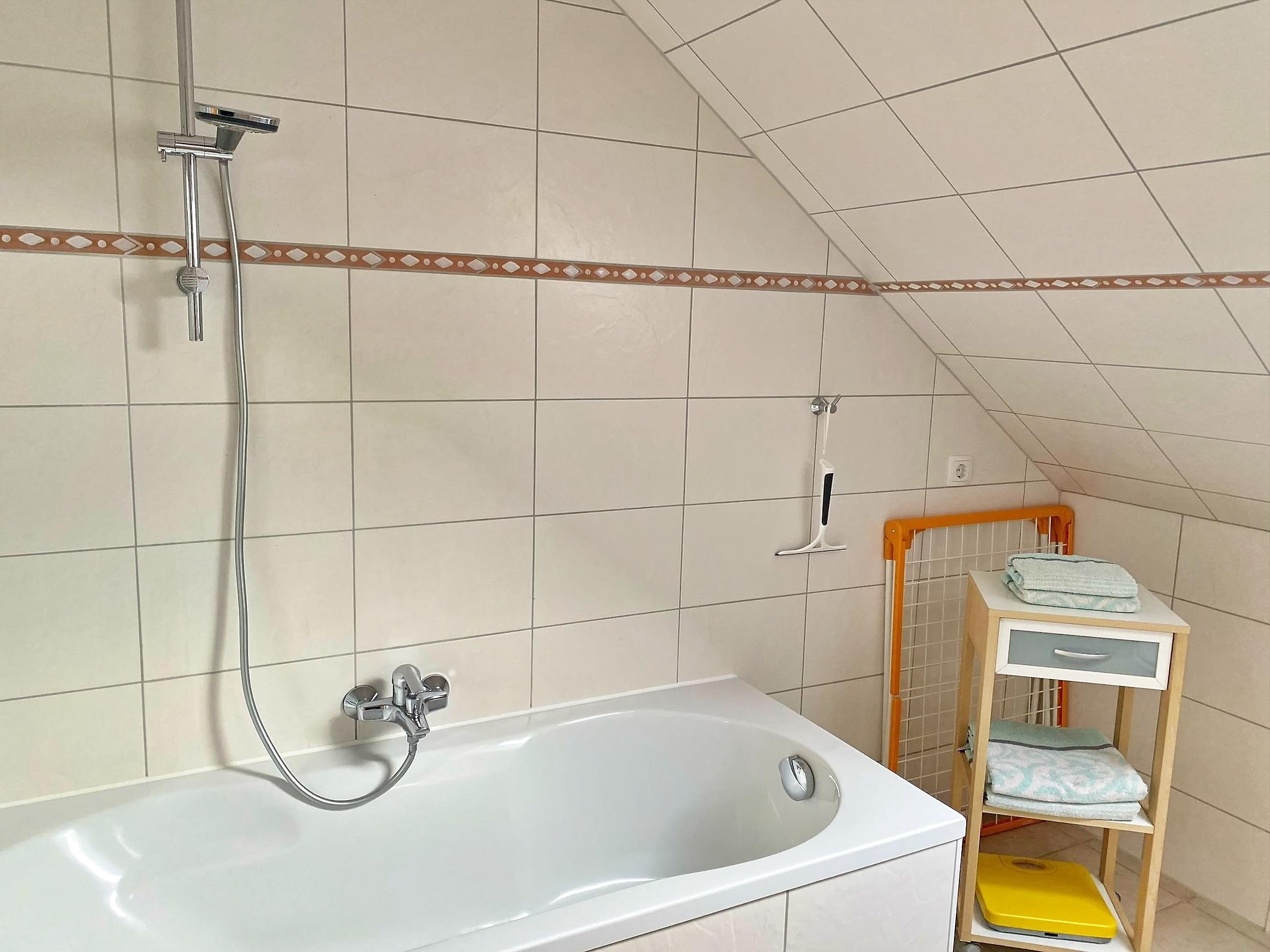 - Badezimmer: Badewanne mit Duschfunktion, WC, Spiegel, Wäscheständer, Fön