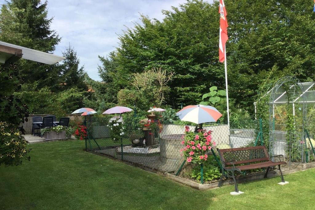 Stueetage: (Stue(, bibliotek, enkeltsovesofa, Fjernsyn, radio), Køkken(, , , , tekøkken, spisebord, kakkelovn, kogeplade, elkedel, brødrister, brødrister, kaffemaskine, ovn, mikrobølgeovn, køleskab, fryser, Foodprocessor), soveværelse(, , , , dobbeltseng), soveværelse(, , , , dobbeltseng), badeværelse(, toilet, bruser, håndvask, føntørrer)) , , veranda(havemøbler, solstole), carport, Internetadgang, varme, terrasse(havemøbler), have(, Grill center, Bordtennis, Græsplæne, grill, havemøbler, trampolin, dam, rutsjebane, Haveskur, Gyngestativ), parkering, strygebræt, strygejern, tørreskab