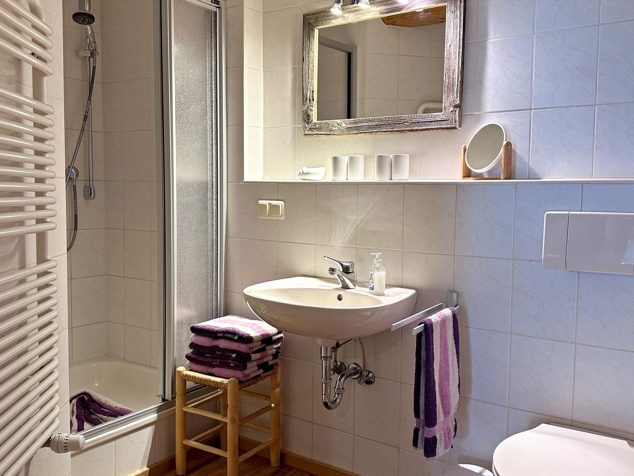Das ansprechende Bad mit Echtholzbalken bietet neben einem Waschbecken und einem Handtuchwärmer auch eine Dusche/WC und einen Fön, damit Sie sich rundum wohlfühlen können.