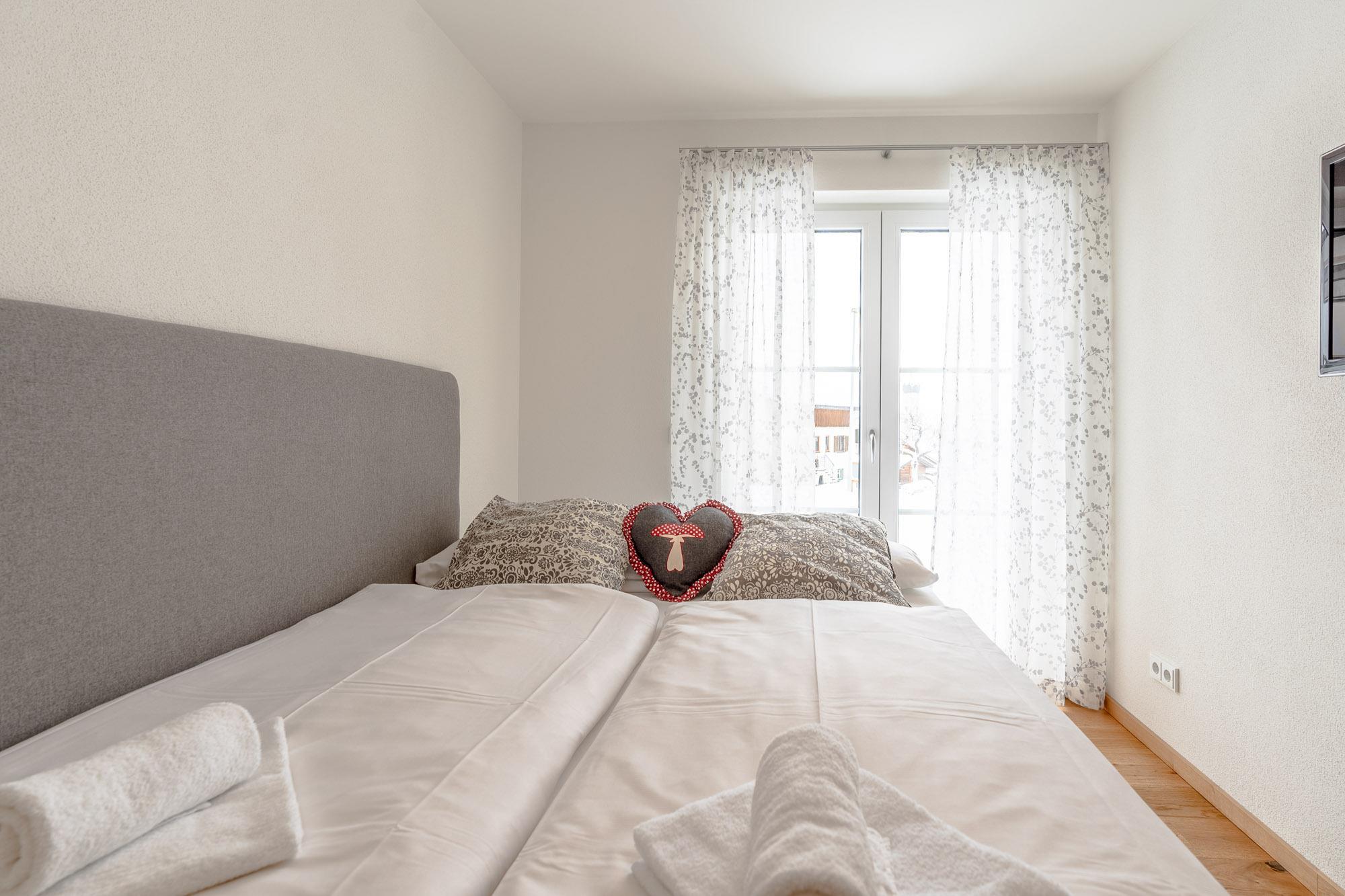 Die große Terrasse mit Süd-West Ausrichtung erreichen Sie vom Wohnbereich aus, der wunderschöne Blick in die Allgäuer Bergwelt wird Sie begeistern. Von hier aus können Sie einen erlebnisreichen Urlaubstag in Ruhe ausklingen lassen und sich erholen. Des weiteren verfügt die Ferienwohnung über zwei sehr schöne Schlafzimmer. Das Hauptschlafzimmer ist mit einem aus Zirbenholz gefertigten Doppelbett sowie einem großen aus Zirbenholz angefertigten Kleiderschrank ausgestattet. Das weitere Schlafzimmer besitzt ein bequemes Boxspringbett und ebenfalls ein aus Zirbenholz hergestellten Kleiderschrank.