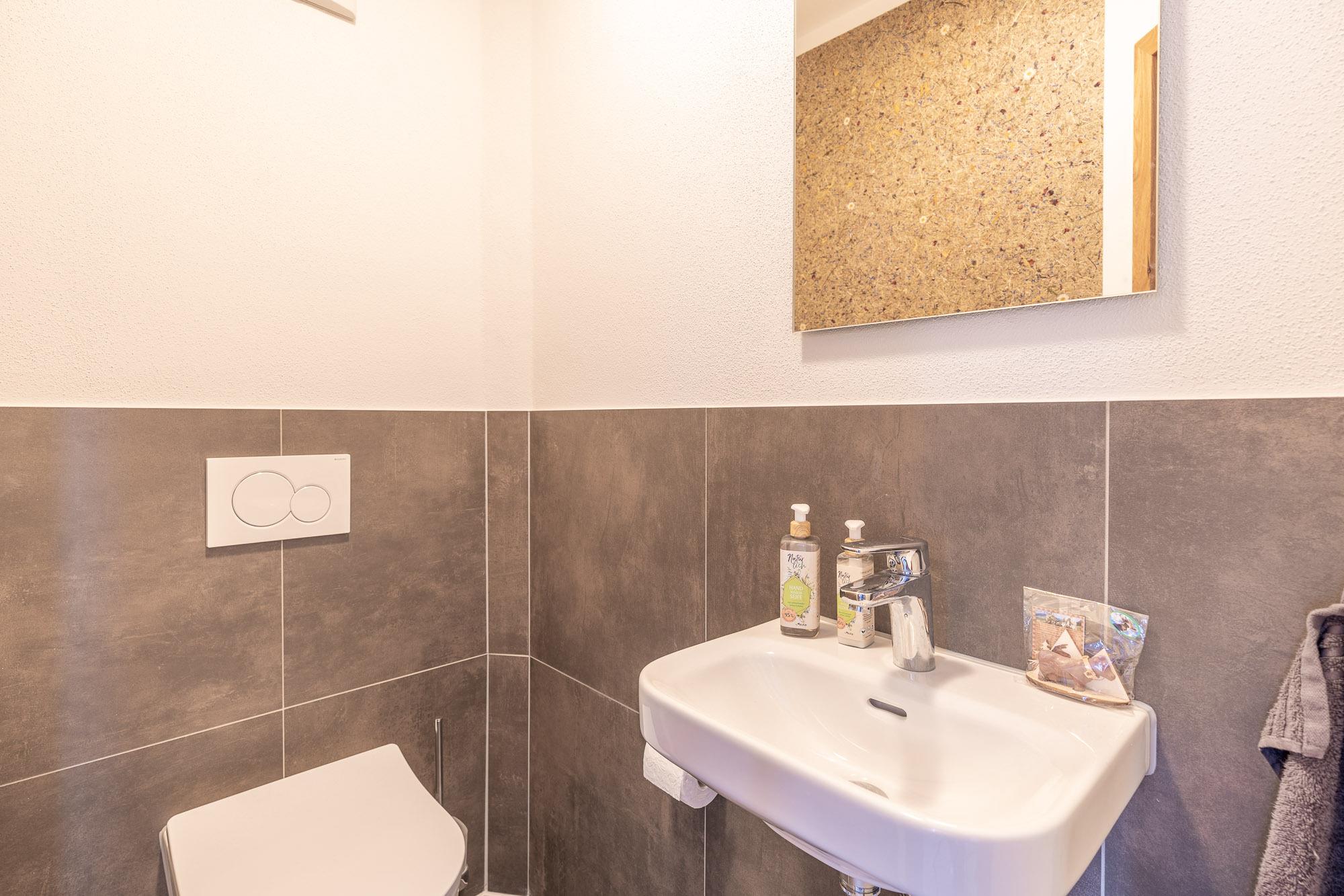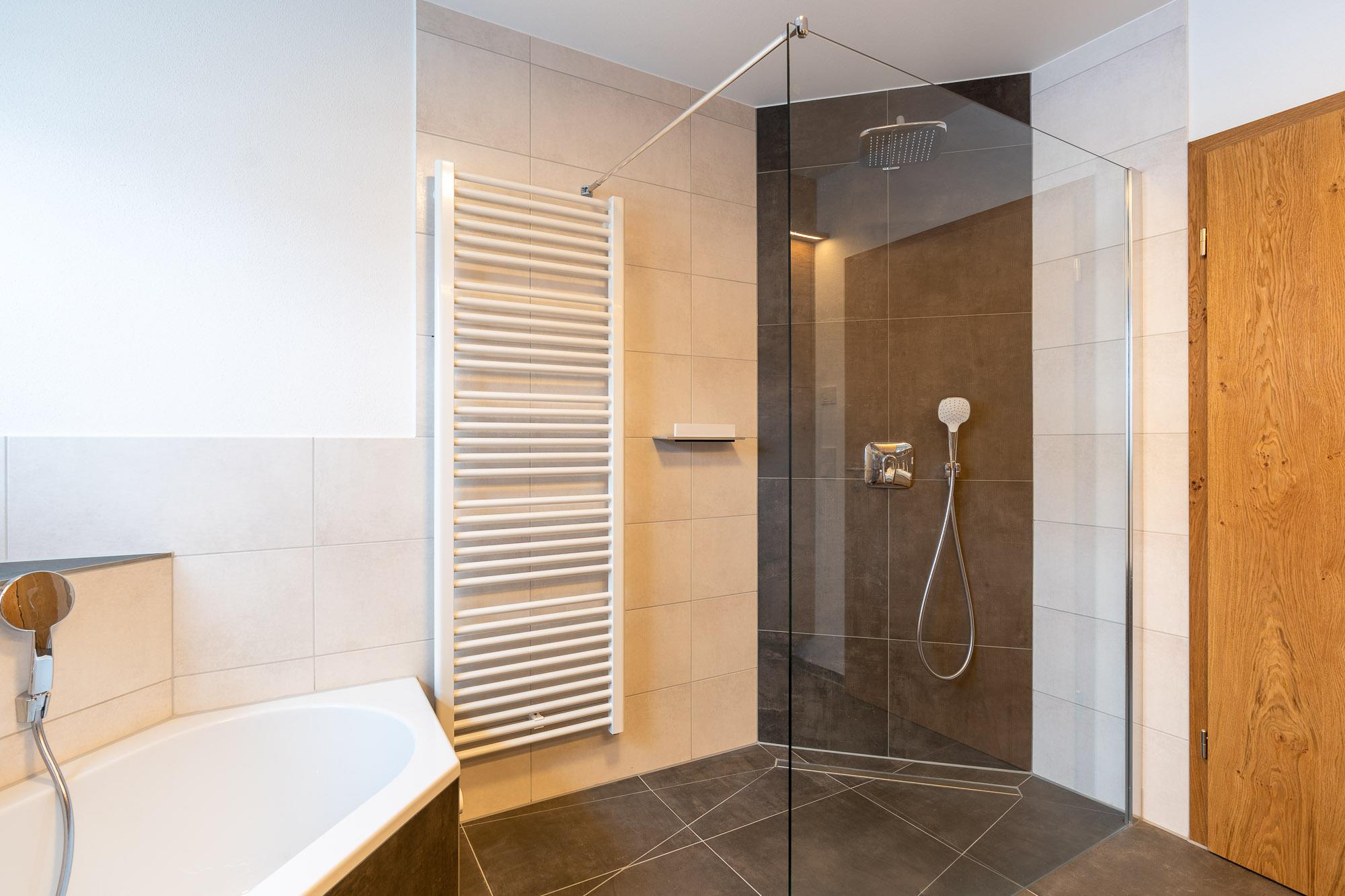 Im Badezimmer erwartet Sie eine große ebenerdige Regendusche, eine Badewanne, Waschtisch und Toilette. Zusätzlich bietet die Wohnung ein extra WC mit hochwertiger Heuwies'n Tapete, die dem Raum eine ganz besondere duftende Note verleiht.