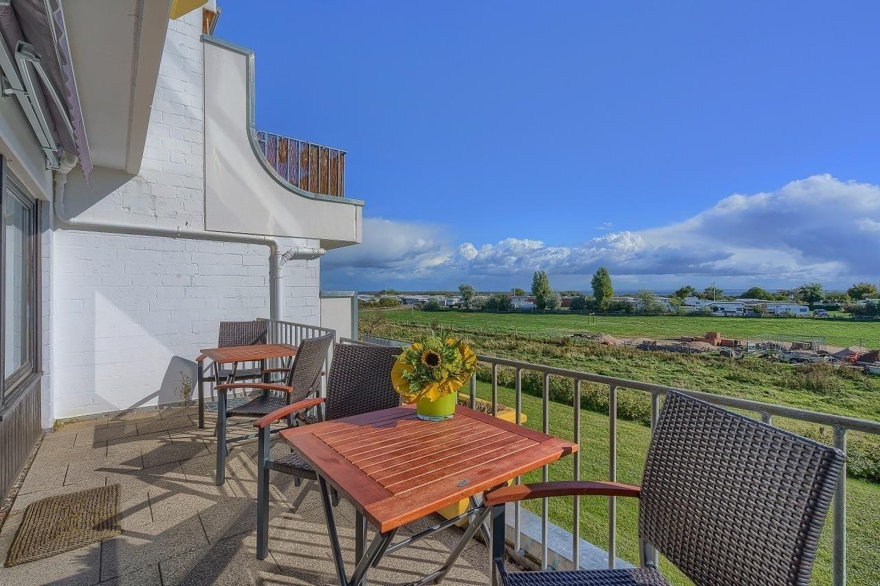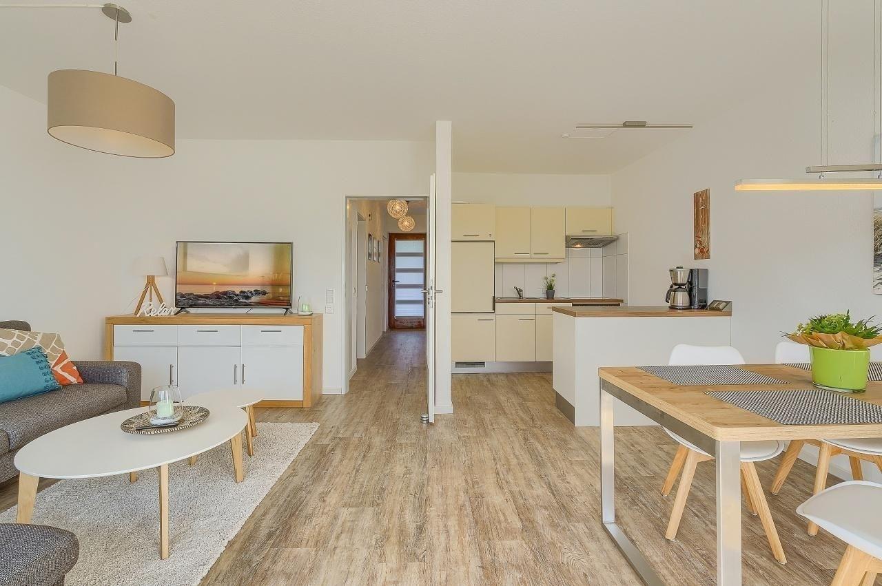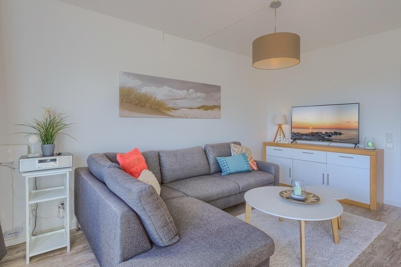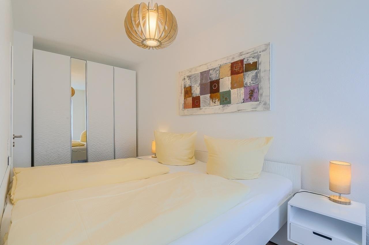 Der großzügige Wohn-Essraum ist mit einer bequemen Sofalandschaft und TV ausgestattet. Die darin integrierte Küche mit angrenzendem Essplatz bietet mit Ceranherd, Backofen, Spülmaschine, Toaster, sowie einem Wasserkocher eine gute Grundlage für gesellige Mahlzeiten während Ihres Urlaubs. Absolutes Highlight der Wohnung ist die große Fensterfront im Wohnzimmer. Von hier aus gelangt man auf den großzügig angelegten Balkon und genießt neben der wohligen Sommersonne einen tollen Blick aufs Meer. Beide Schlafzimmer sind über den Flur erreichbar. Der große Schlafraum verfügt über ein komfortables Doppelbett (180x200cm/ getrennte Matratzen) und einen geräumigen Kleiderschrank für Ihre Urlaubsgarderobe. Der zweite Schlafbereich ist mit einem 140x200cm (durchgehende Matratze) großen Bett ausgestattet. Beide Schlafräume können durch Außenrollos problemlos abgedunkelt werden. Das Badezimmer ist modern und hell gefliest und verfügt über Dusche und WC. Ein kostenfreier W-LAN-Zugang steht zur Verfügung.