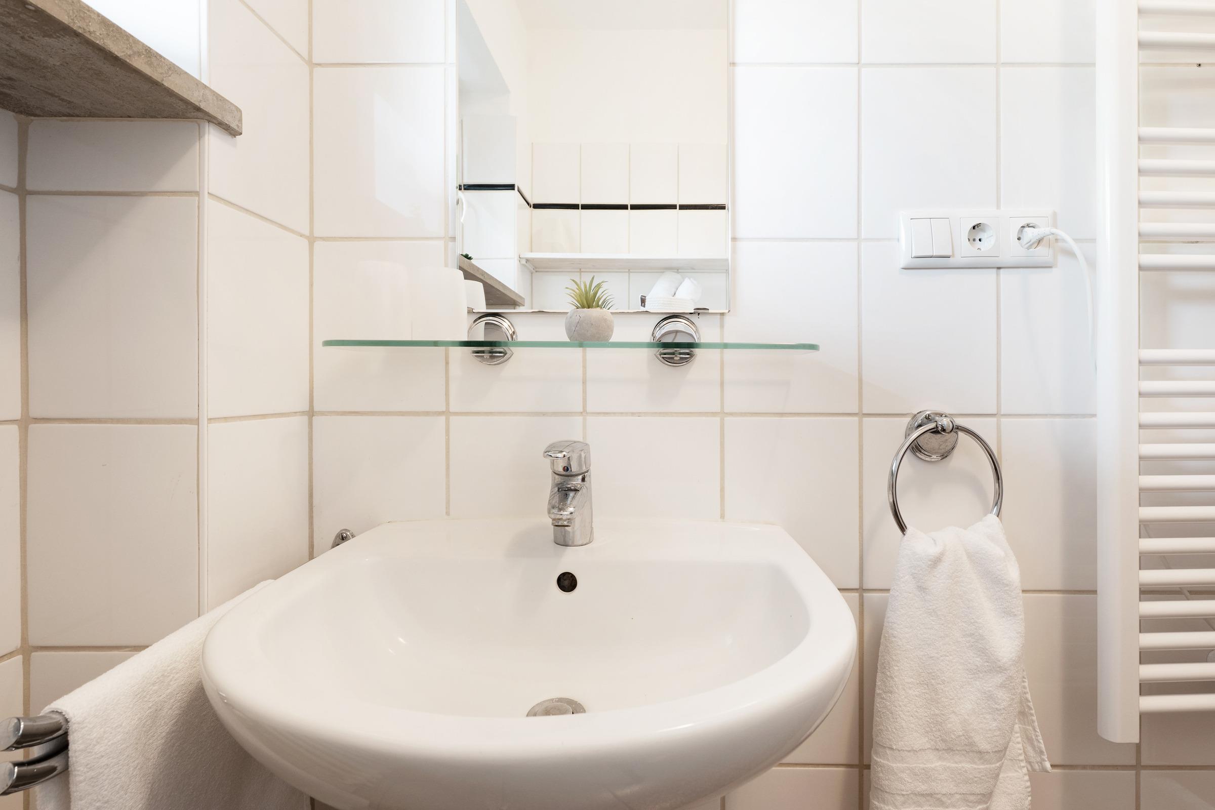 Das Tageslicht-Badezimmer verfügt über eine Dusche (Einstiegshöhe 24 cm), WC, Kosmetikspiegel, Haartrockner und einen beheizbaren Handtuchhalter.