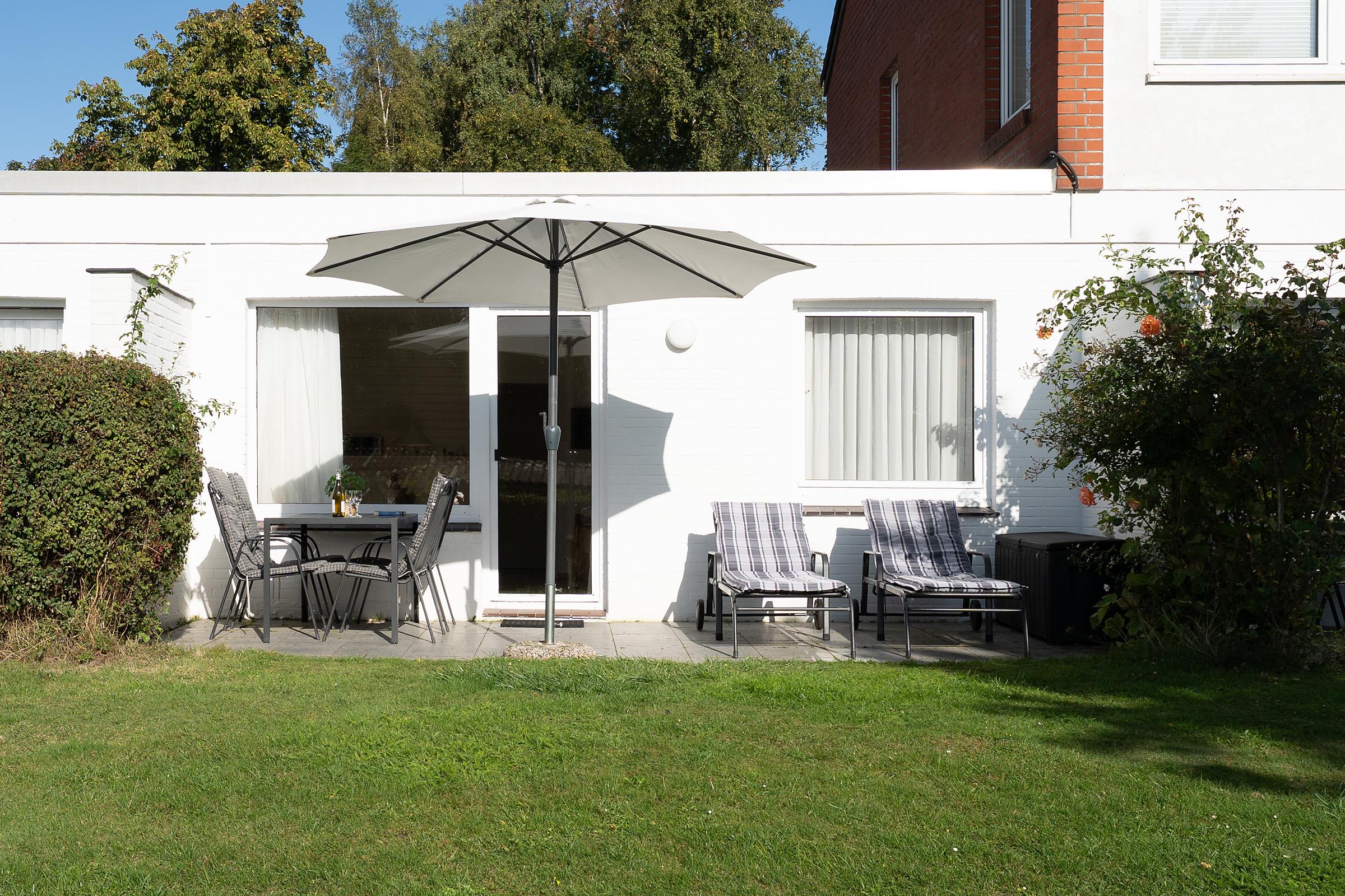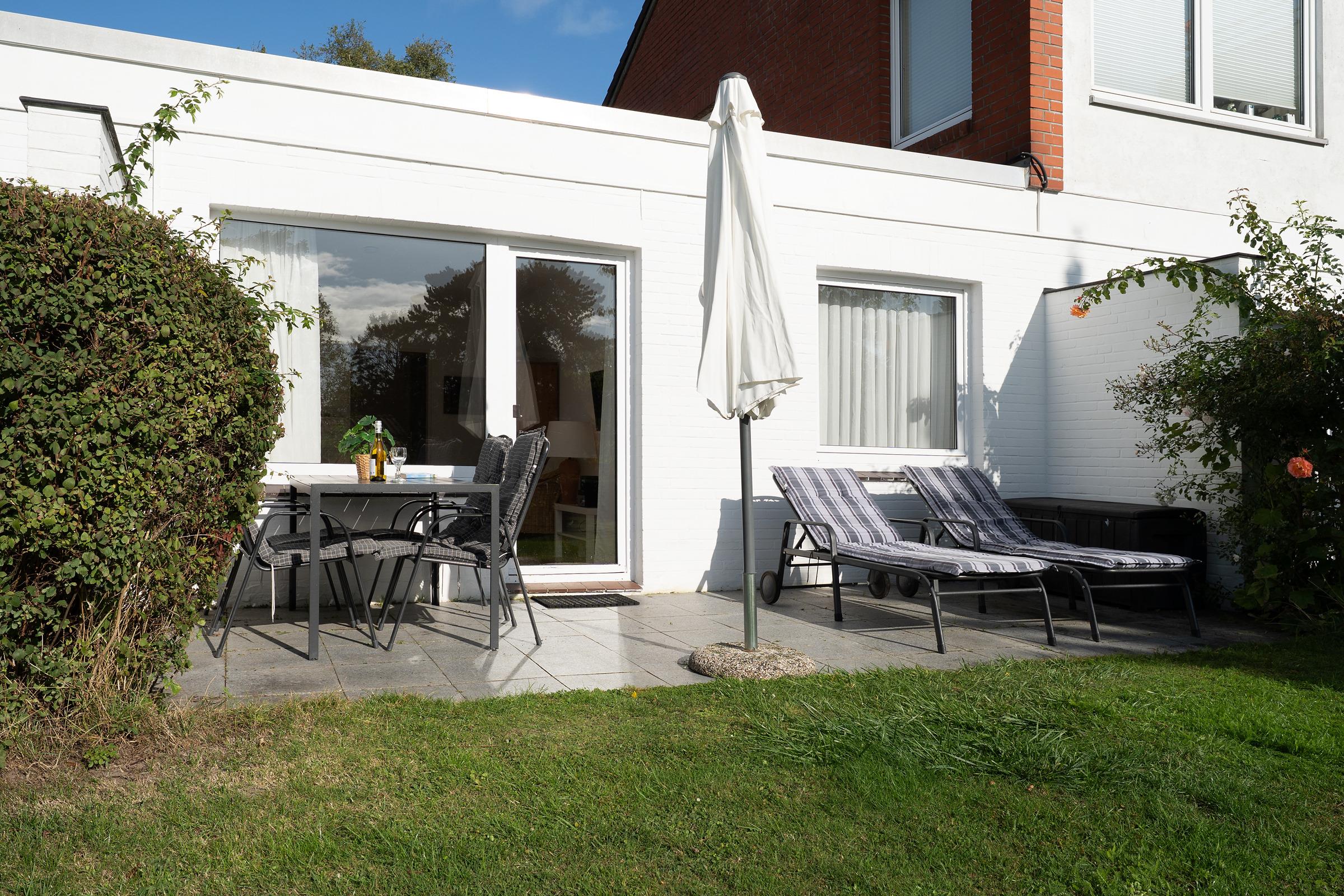 Der lichtdurchflutete Wohnbereich empfängt Sie mit einer gemütlichen Sitzecke, TV und Radio – ideal für entspannte Stunden nach einem Strandtag. Von hier aus gelangen Sie direkt auf die ca. 12 m² große Terrasse, die nach Süd-West ausgerichtet ist. Genießen Sie die Sonne bis in den Abend hinein und nutzen Sie den vorhandenen Holzkohlegrill für gesellige Stunden im Freien.