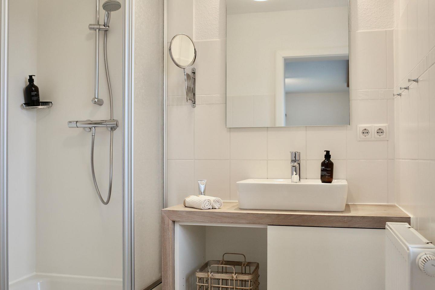 ° Badezimmer mit Dusche, Waschbecken, Föhn und Kosmetikspiegel