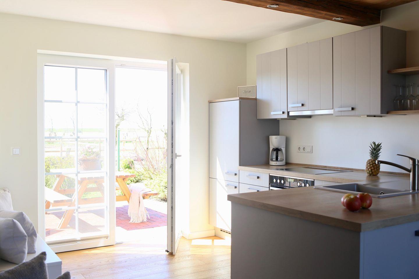 Die großen Terrassen nach Osten und Westen sind mit einer Sitzgarnitur, Liegestuhl und einem gemütlichen Strandkorb ausgestattet. Lassen Sie von hier Ihre Gedanken mit Blick auf die Ponyweide und auf den Nordsee-Deich schweifen und schalten Sie ab vom Alltag.