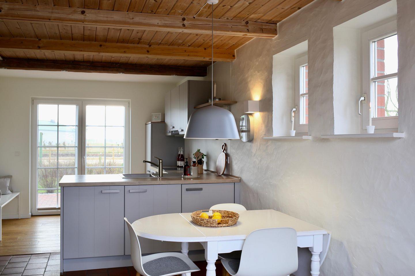 Die 4 -Sterne-Ferienwohnung "Habel" ist außergewöhnlich. Sie schafft ein erstklassiges Wohnerlebnis und vereint das urige Landerlebnis mit himmlischem Blick zum Nordsee-Deich. Die rustikalen Wände und die Holzdecke verbinden sich gekonnt mit den modernen Lichtelementen. Entspannen Sie in der hyggeligen Sofaecke und in der Essecke mit Ausblick nach Ost und West.