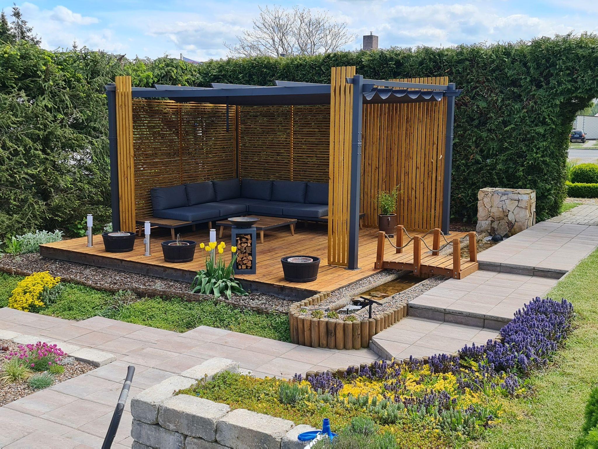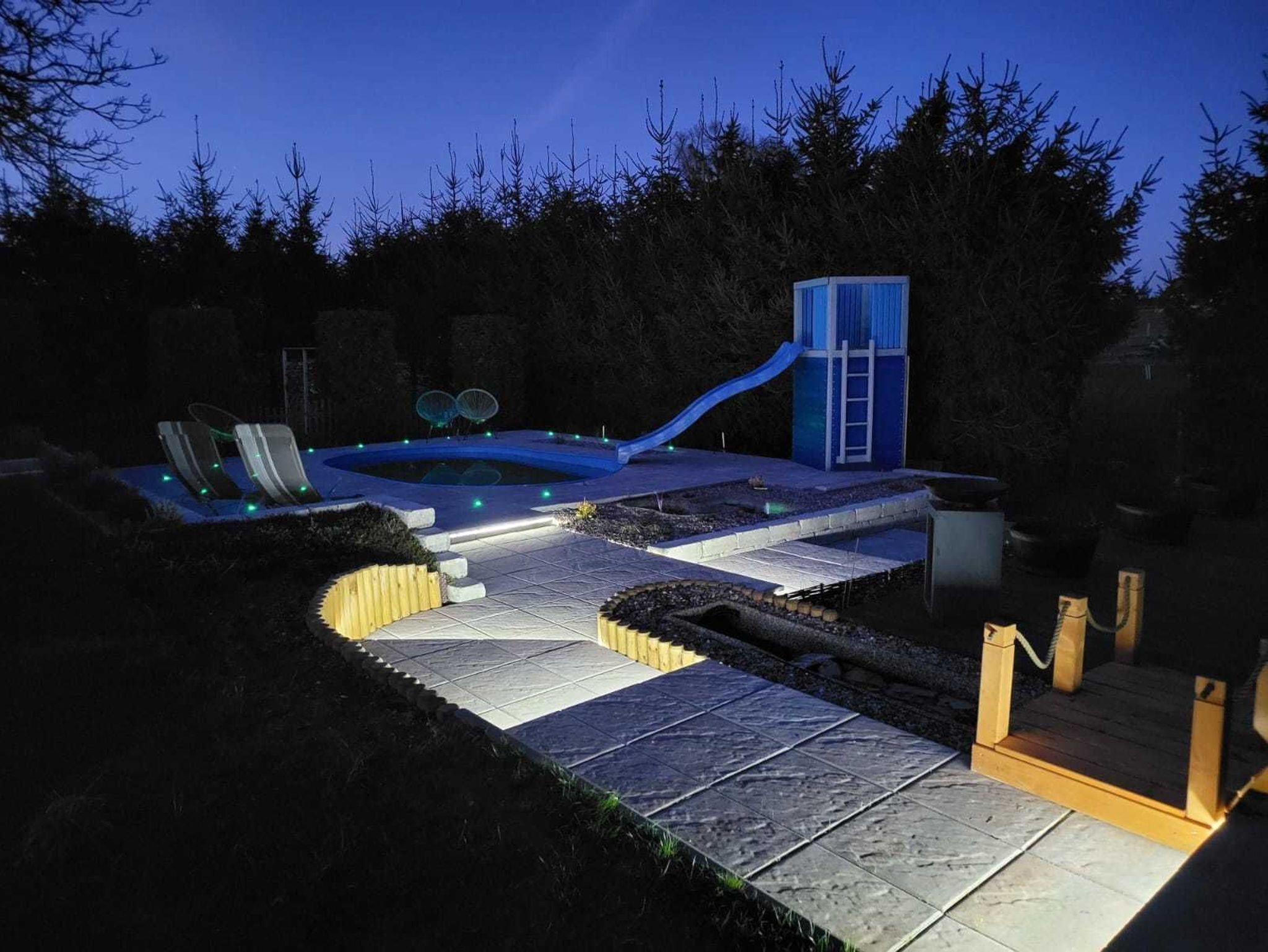 Zum Ferienhaus gehört ein großes Grundstück mit Garten. Hier befindet sich ein Pool und Terrasse mit Gartenmöbeln für entspannte Stunden im Grünen.