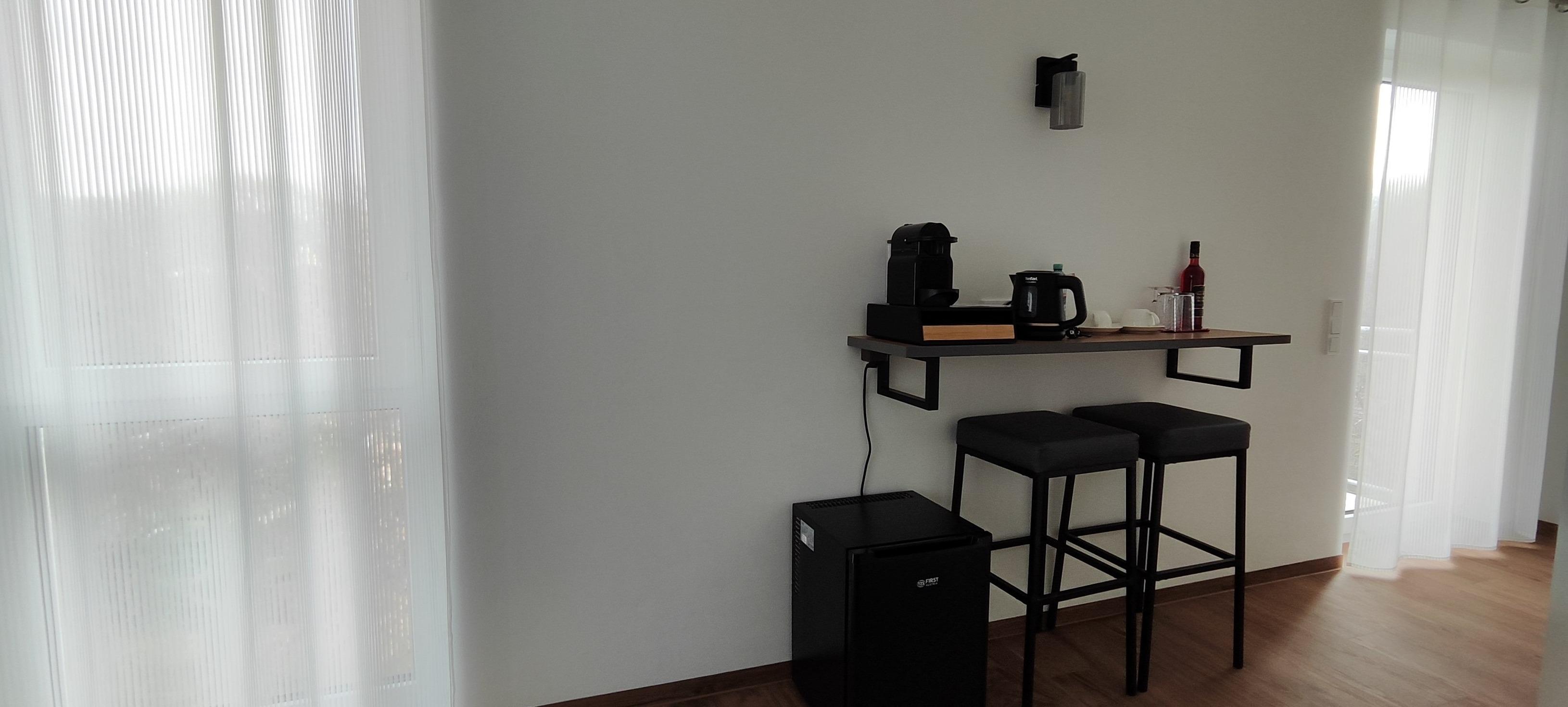 Kleine Annehmlichkeiten: Ein Mini-Kühlschrank bietet Platz für Getränke und Snacks, während ein Teekocher und eine Kaffeemaschine für Ihre heißen Getränke bereitstehen.