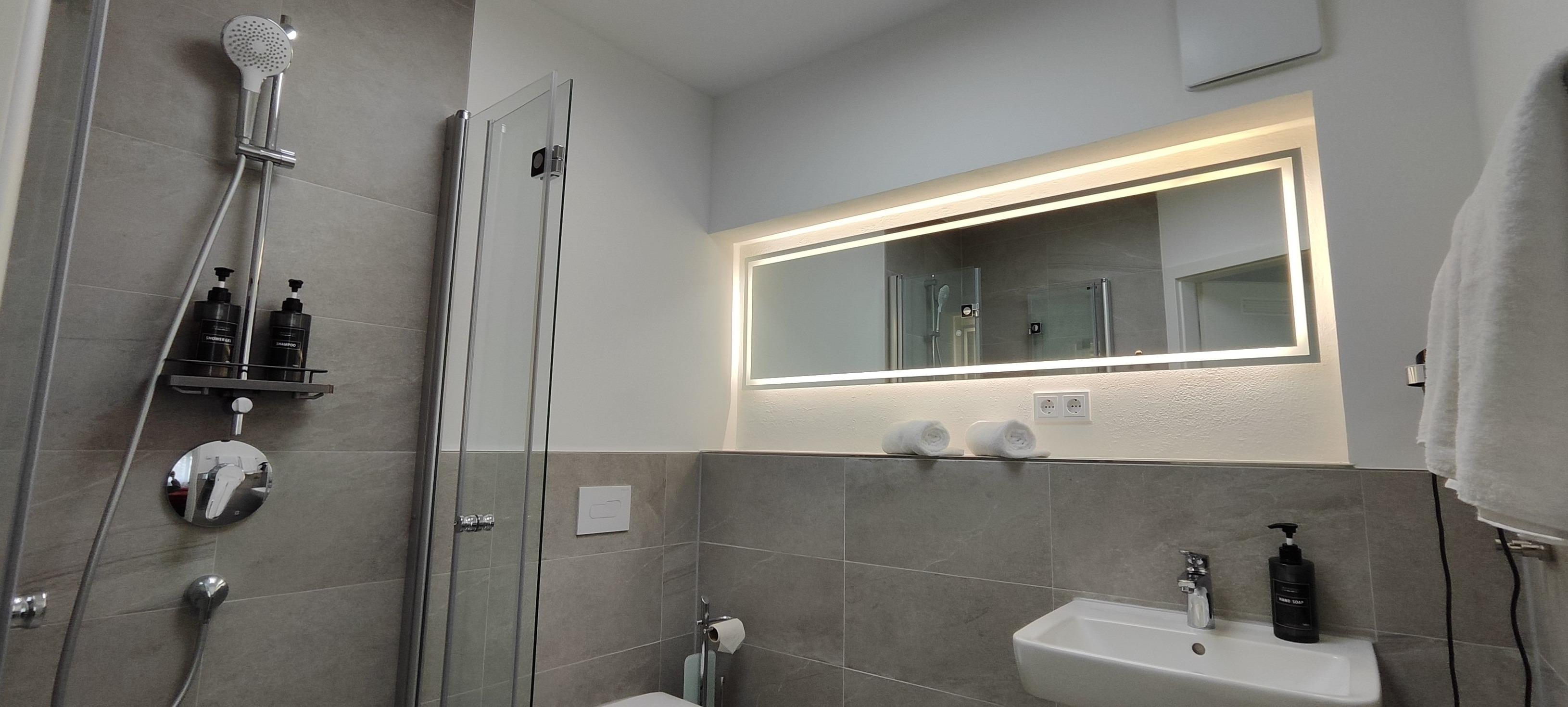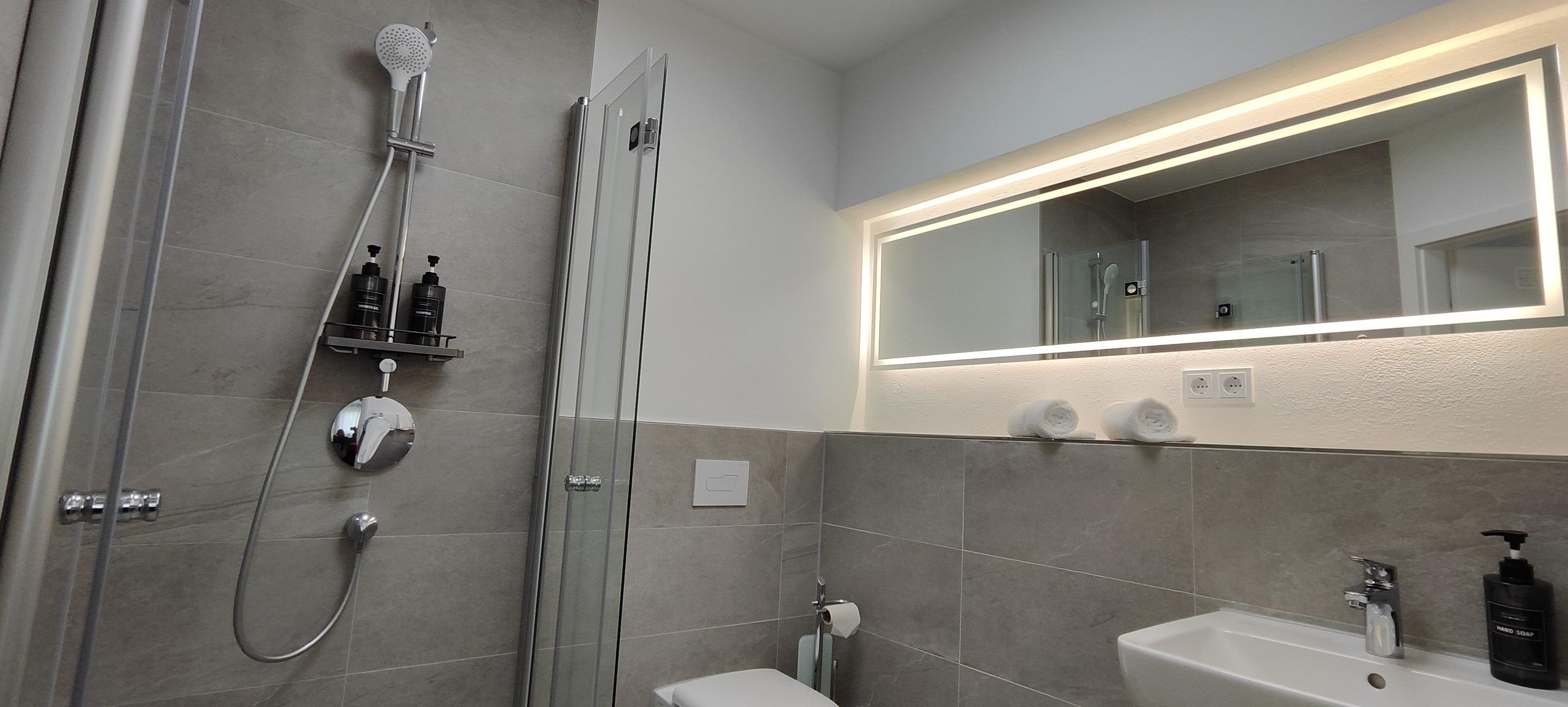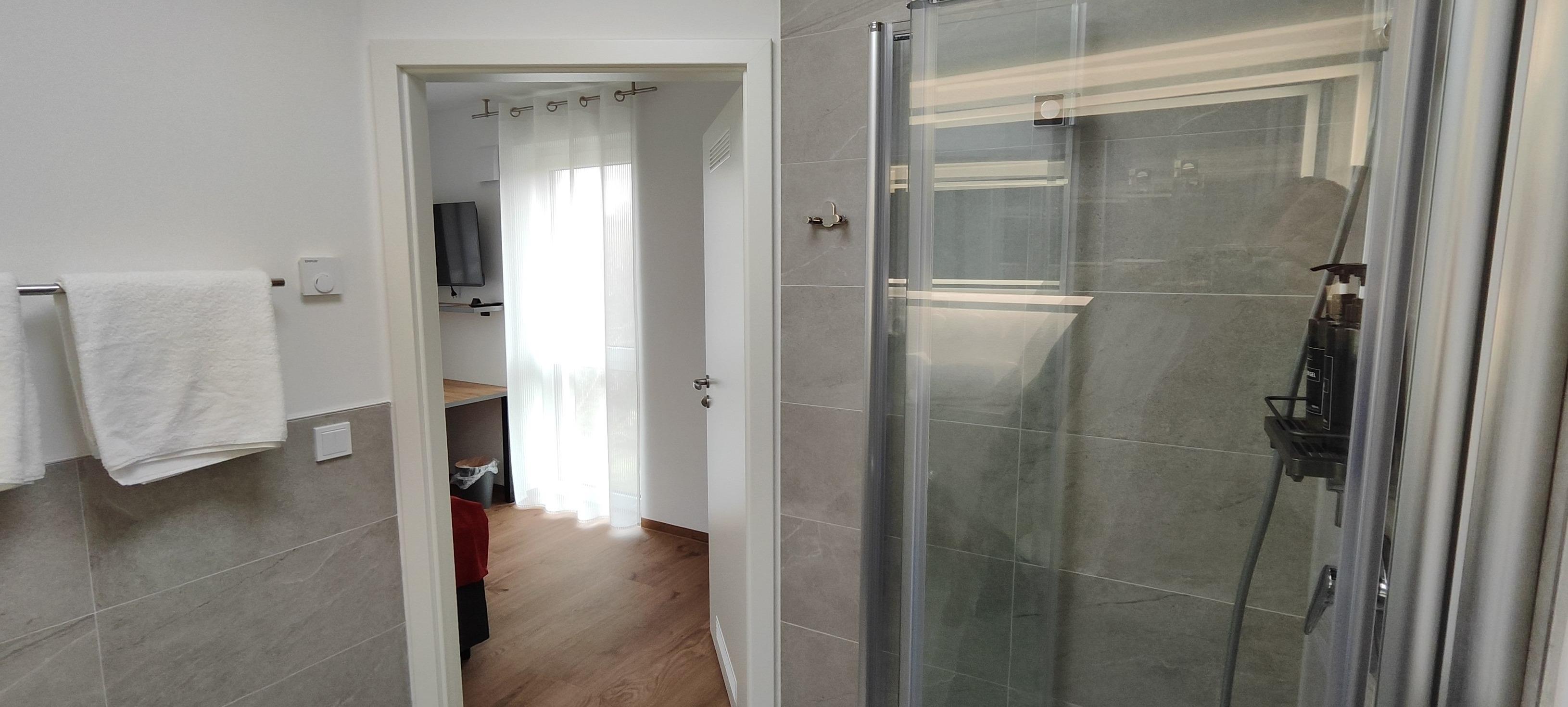 Privatbad: Das moderne Badezimmer ist mit einer Dusche, WC und einem Föhn ausgestattet, Handtücher sind inklusive.