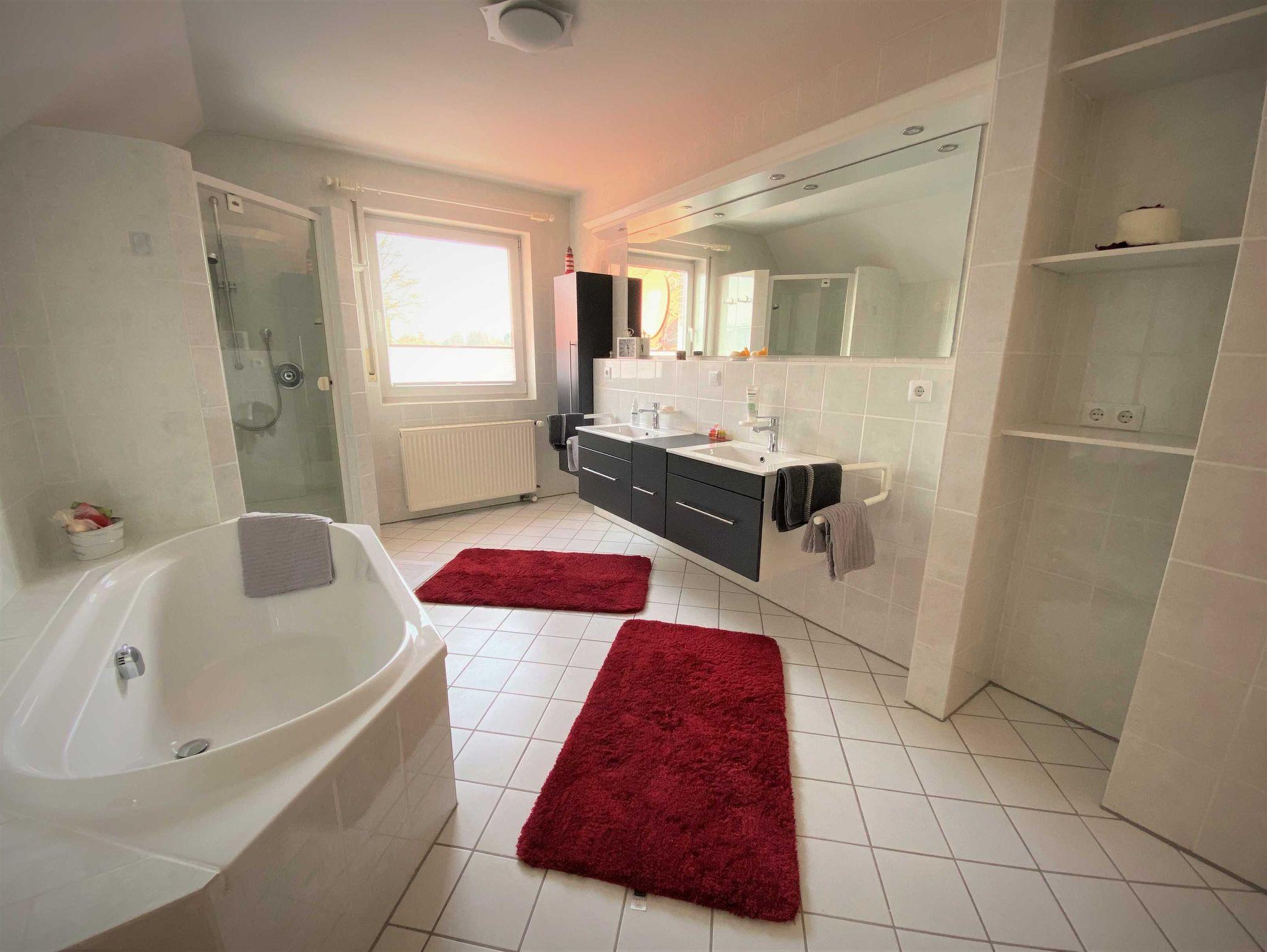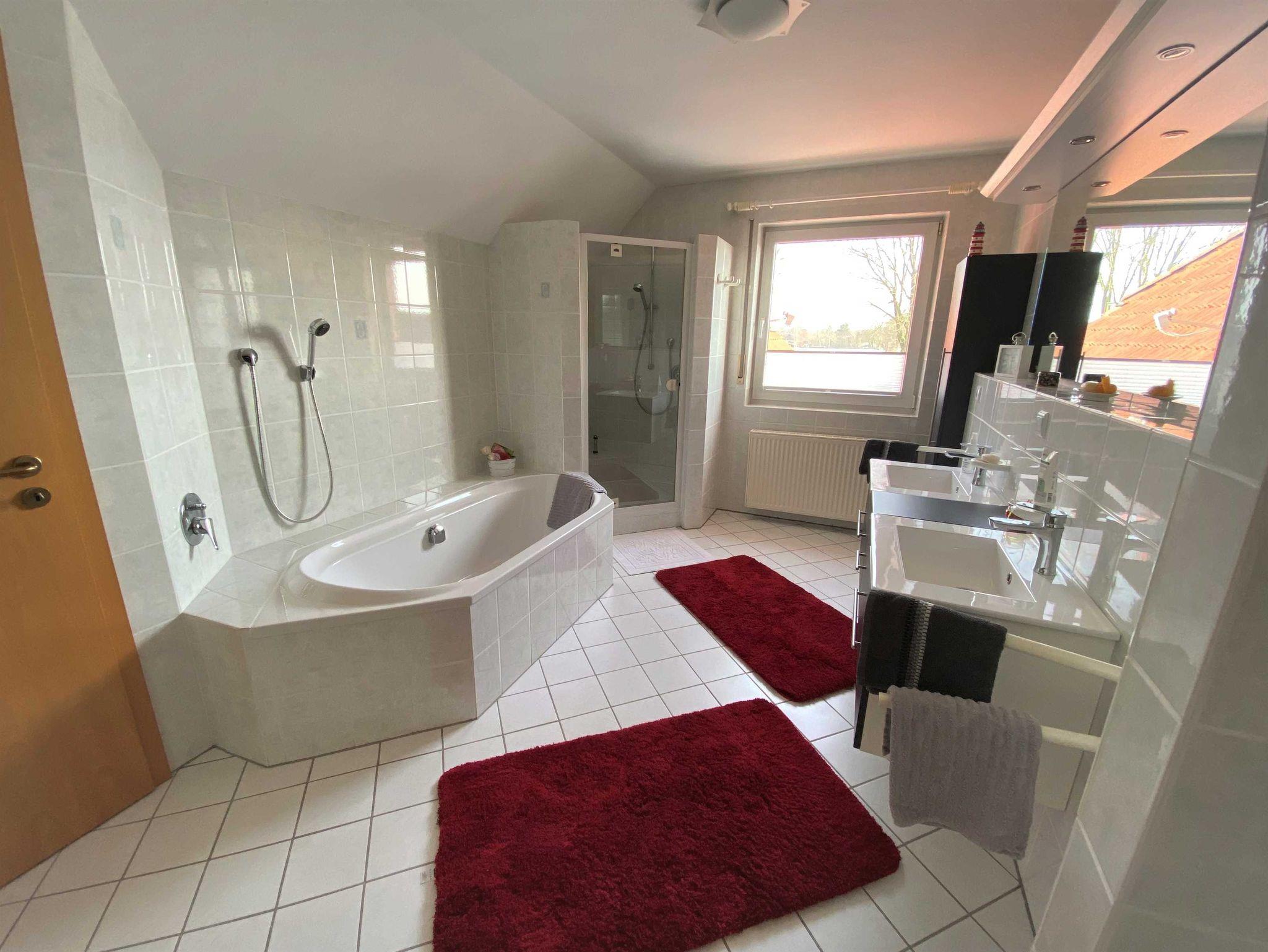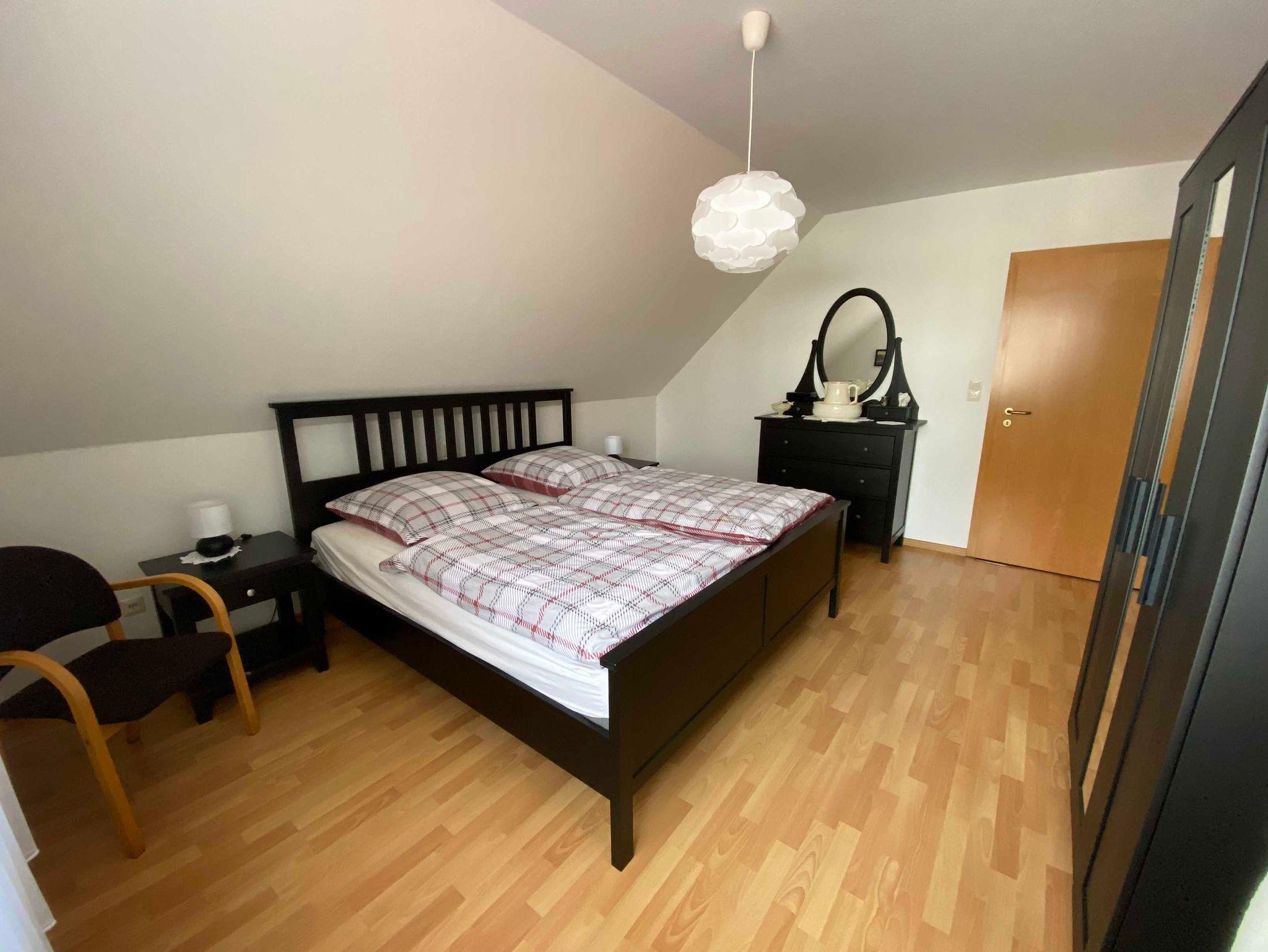 In der Oberwohnung befindet sich ein großer Schlafraum mit Doppelbett. Hier kann zusätzlich ein Babybett dazu gestellt werden. Der Küchenbereich ist separat. Im großzügigen Badbereich befindet sich eine Dusche und eine Badewanne. Waschmaschine vorhanden. Der Wohnbereich ist hell und groß und bietet genug Platz zum Entspannen.