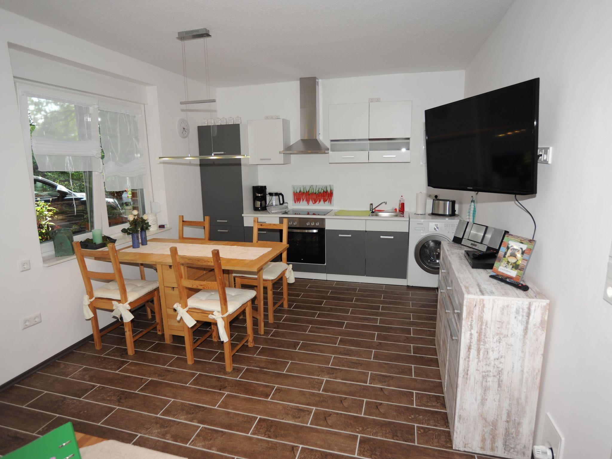 Die Wohnung verfügt über ein Schlafzimmer mit Doppelbett, Nachtschränke und Kleiderschrank, eine Wohnküche mit Essbereich. Hier befinden sich ein Küchenblock mit Spülmaschine, Kühlschrank und Herd, ein Sofa, Flachbildschirm-TV und ein Tisch mit 4 Stühlen.
