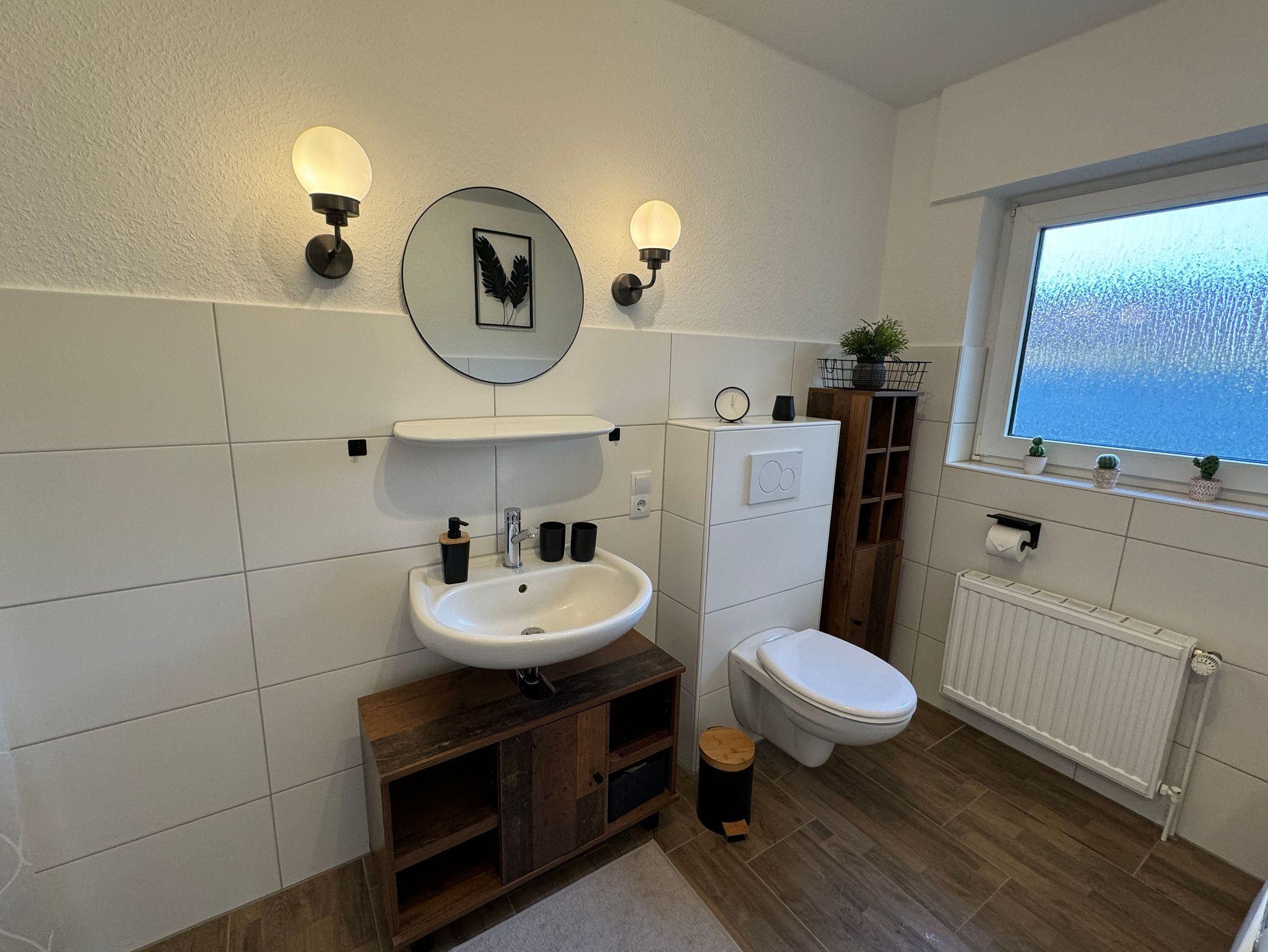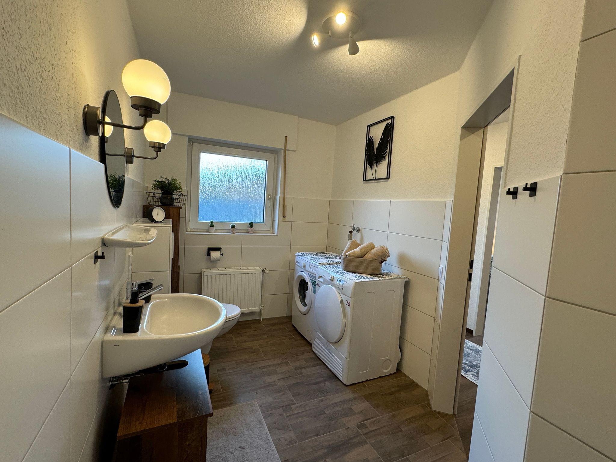 Das Bad ist ausgestattet mit einer ebenerdige Dusche, Fön, Waschmaschine und Trockner.