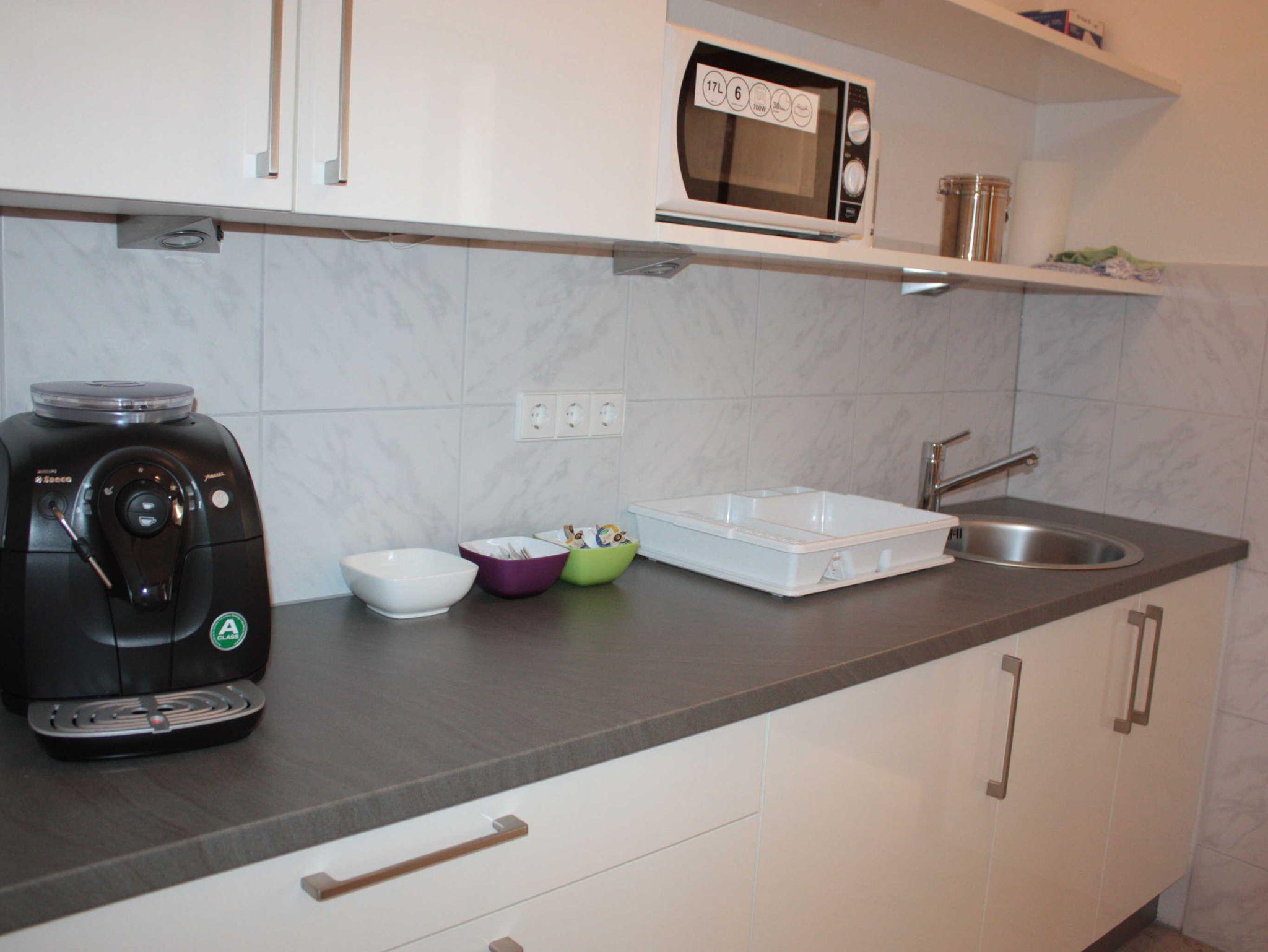 • Küche: Küchentisch; Kochfelder; Kaffeemaschine; Kühlschrank; Mikrowelle; Wasserkocher; Toaster; Spülbecken; Handtücher; Geschirr und Besteck