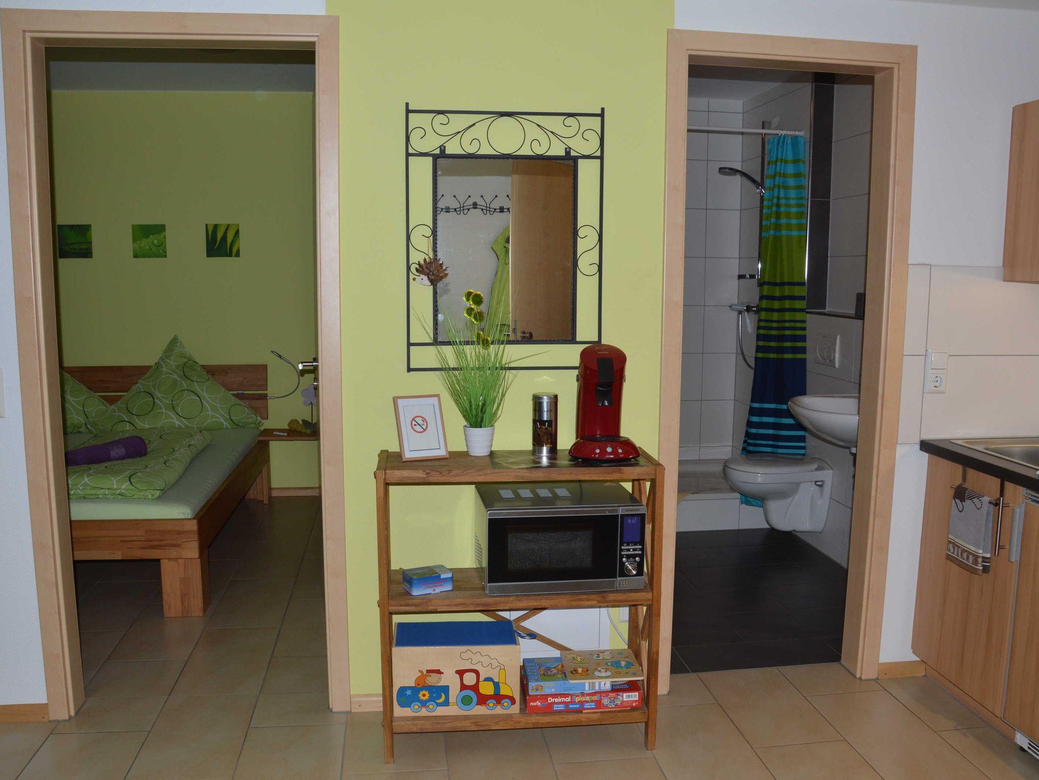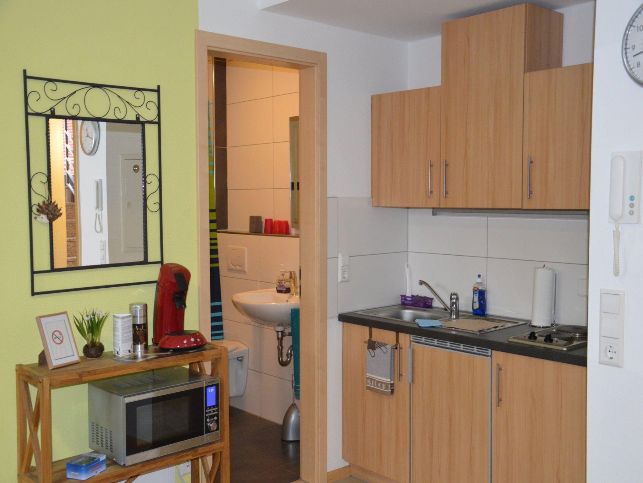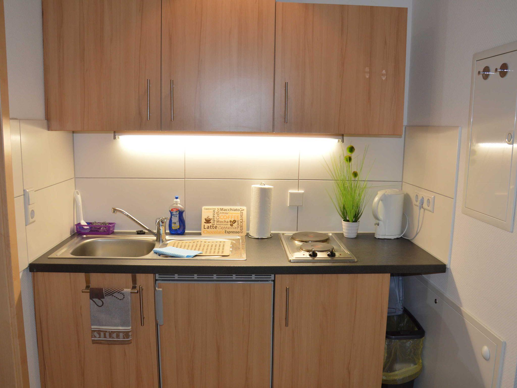 Die kleine Küchenzeile ist im Wohnbereich integriert und mit zwei Herdplatten, Kühlschrank mit Gefrierfach, Kaffeepadmaschine, Toaster, Eierkocher, Wasserkocher, Mikrowelle und dem notwendigen Geschirr ausgestattet.