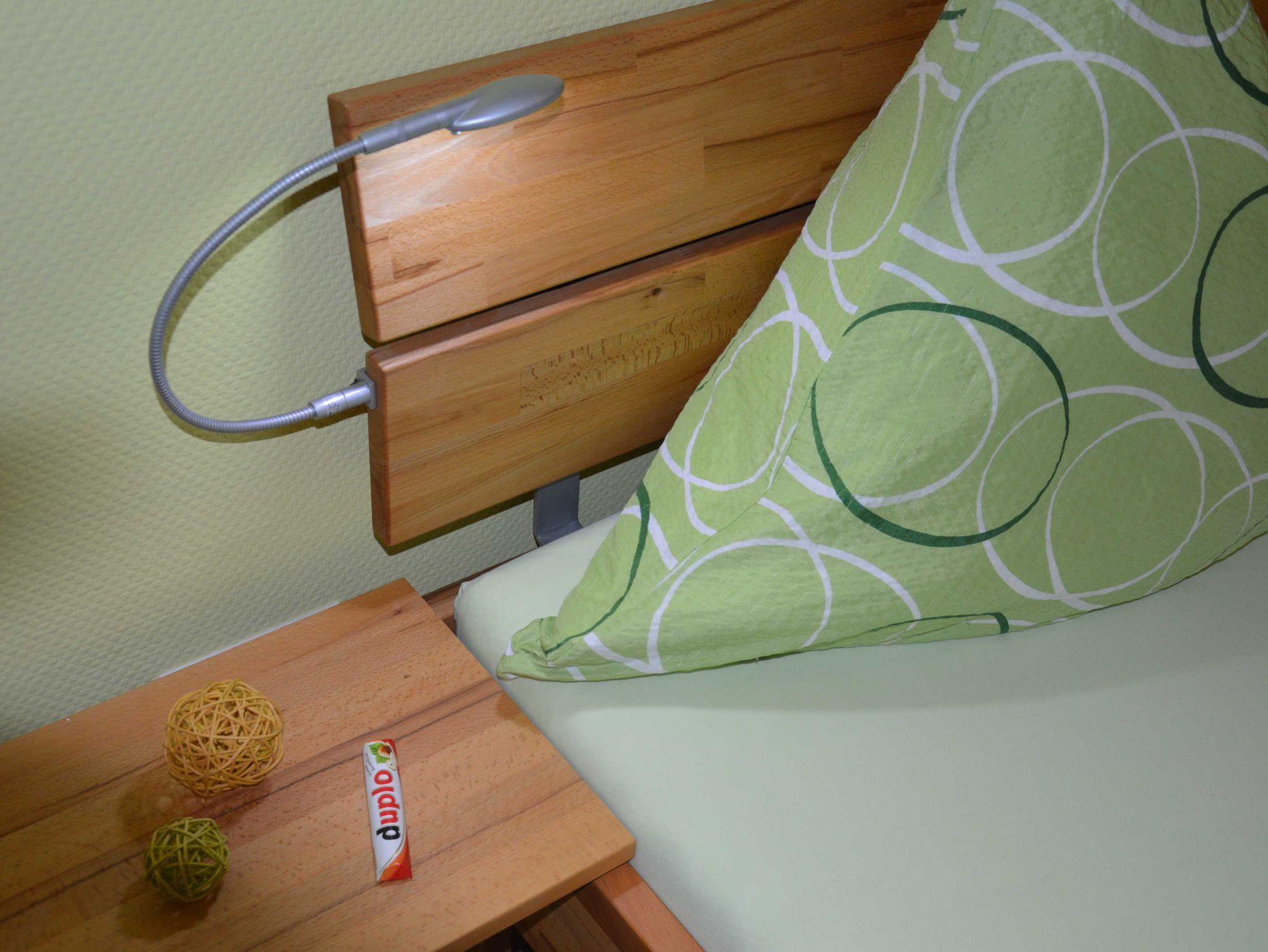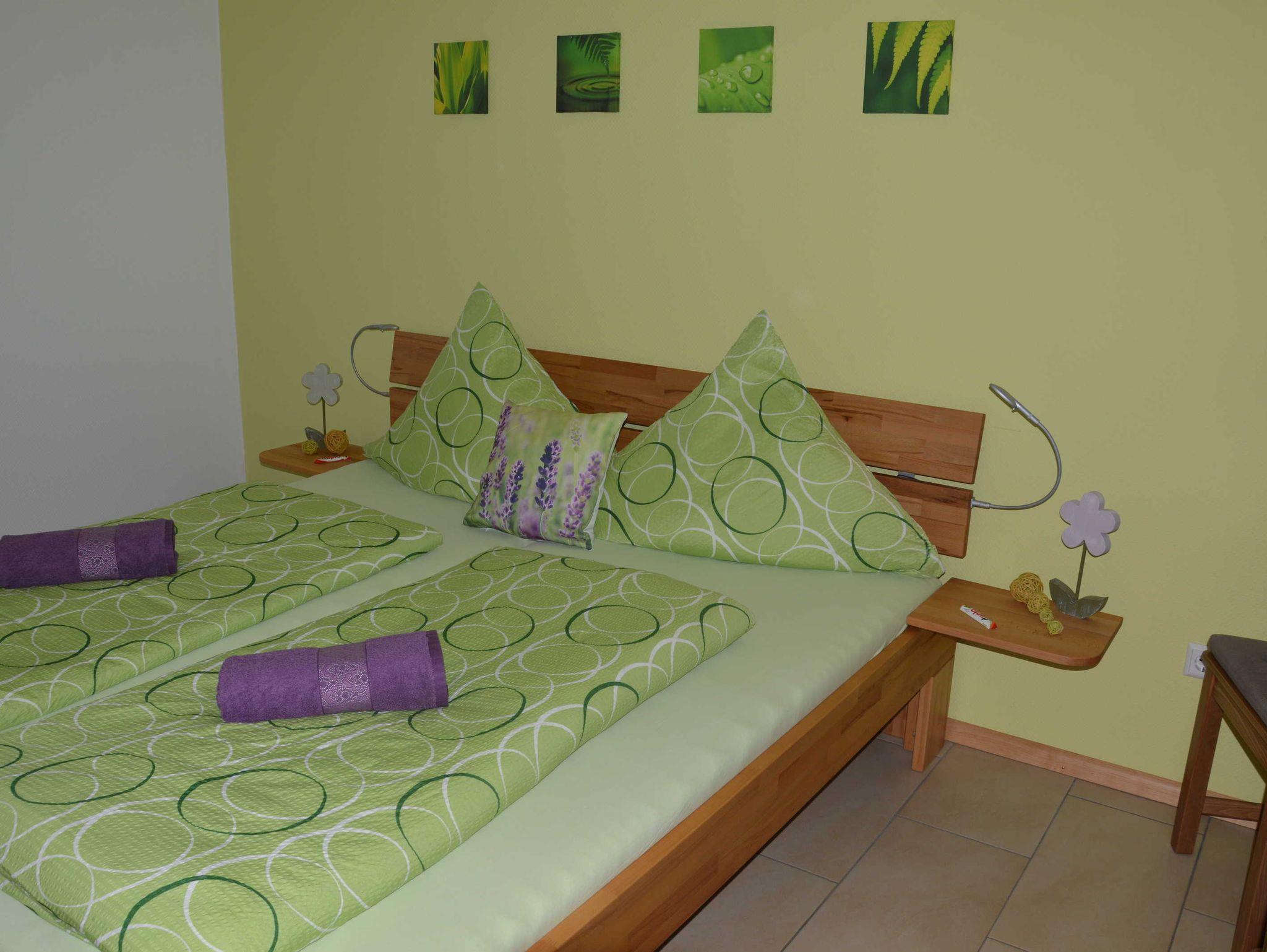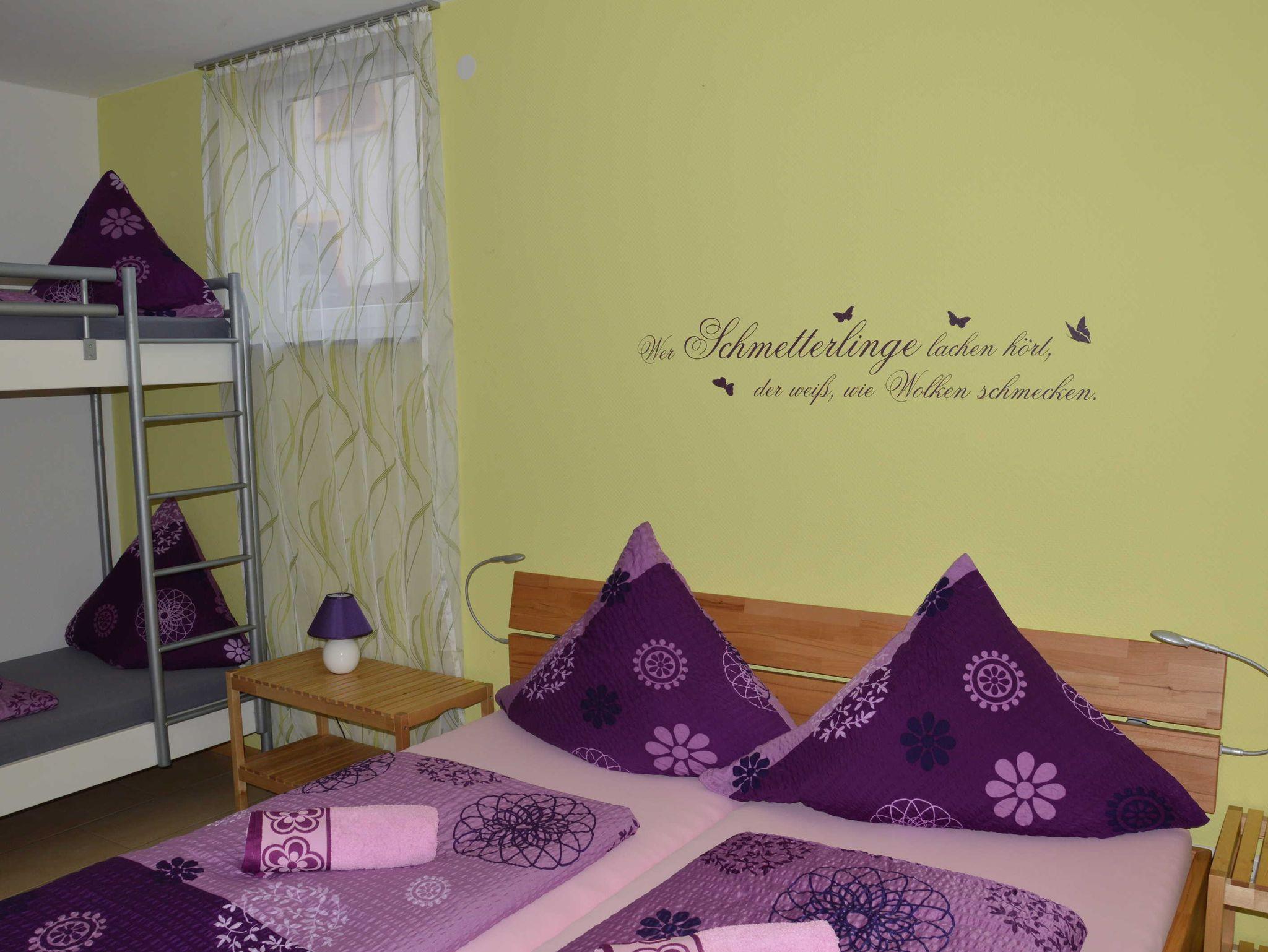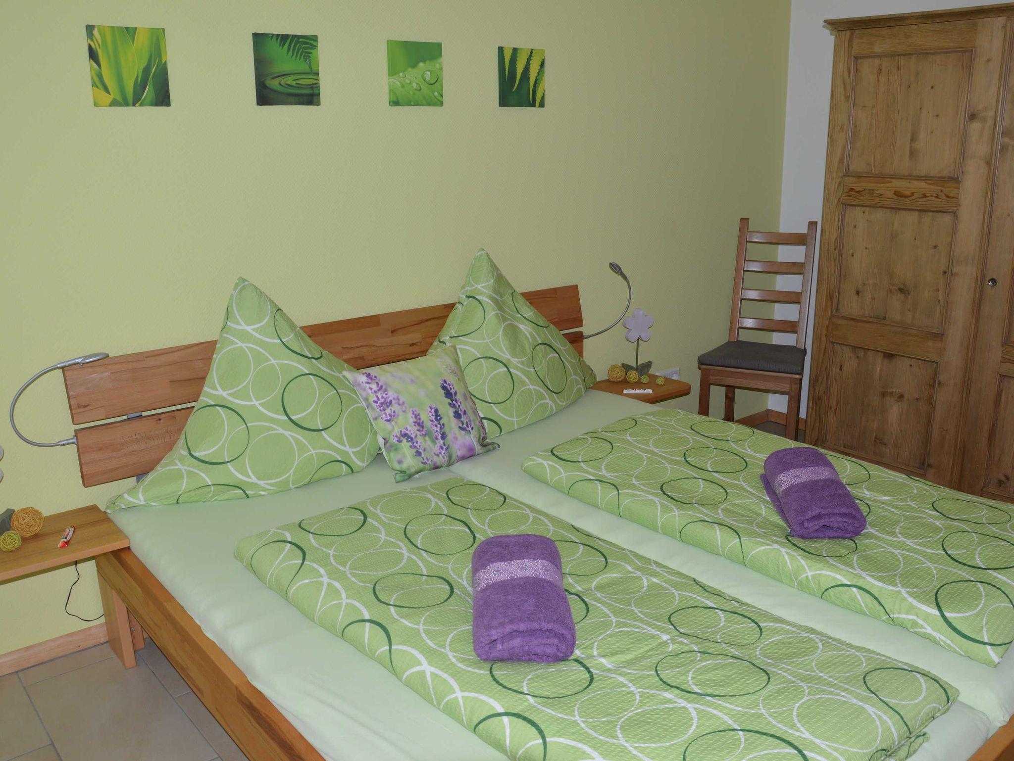 Unsere modern eingerichete Ferienwohnung Nr. 1 verfügt über zwei separate Schlafzimmer mit jeweils einem 1,80 x 2,0 m großen Doppelbett. Ein Schlafzimmer verfügt außerdem über ein zusätzliches Etagenbett, welches auch für Erwachsene geeingnet ist.