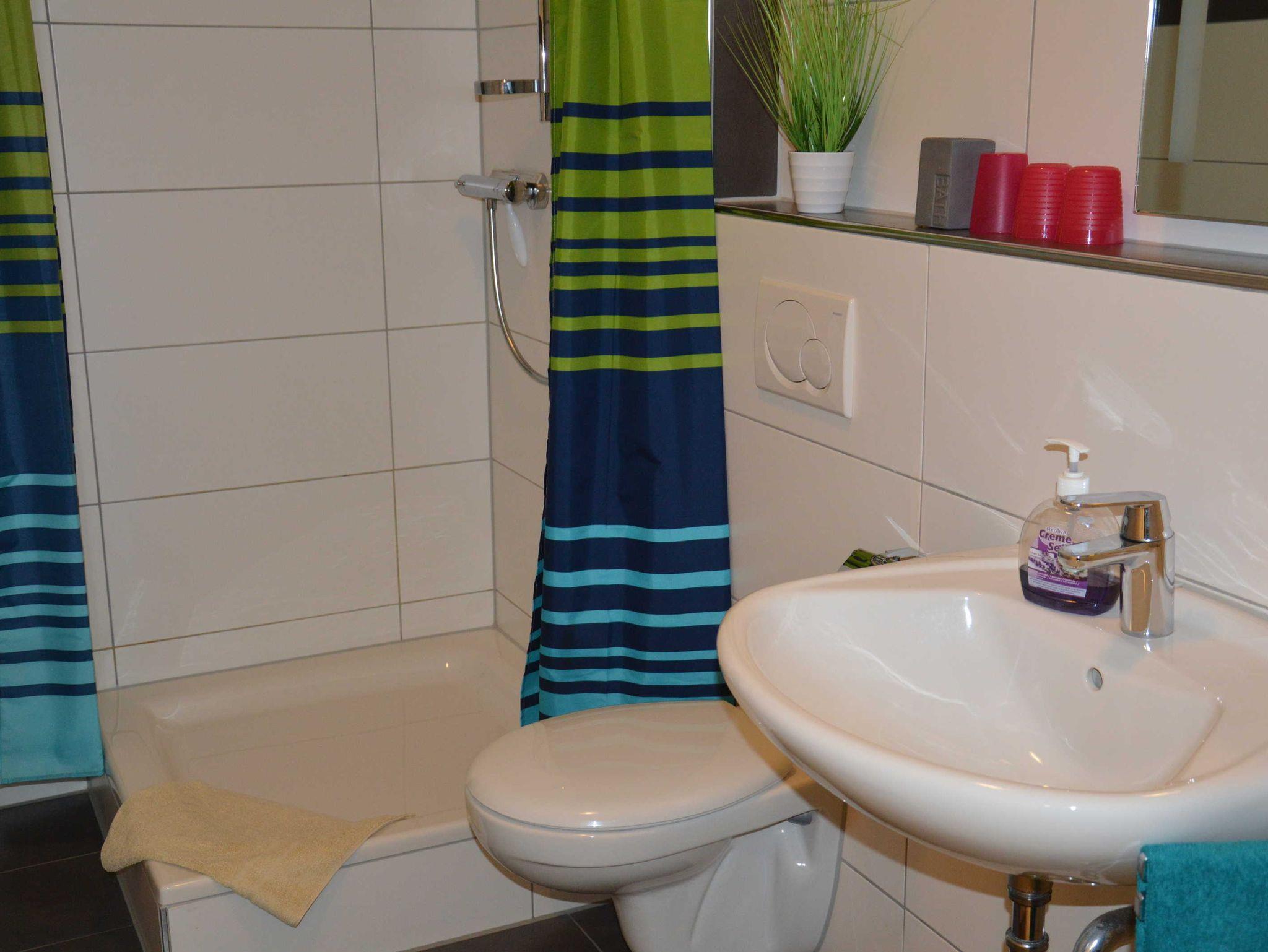 Das Bad mit Dusche, WC und Fön. Duschtücher und Bettwäsche werden kostenlos zur Verfügung gestellt.