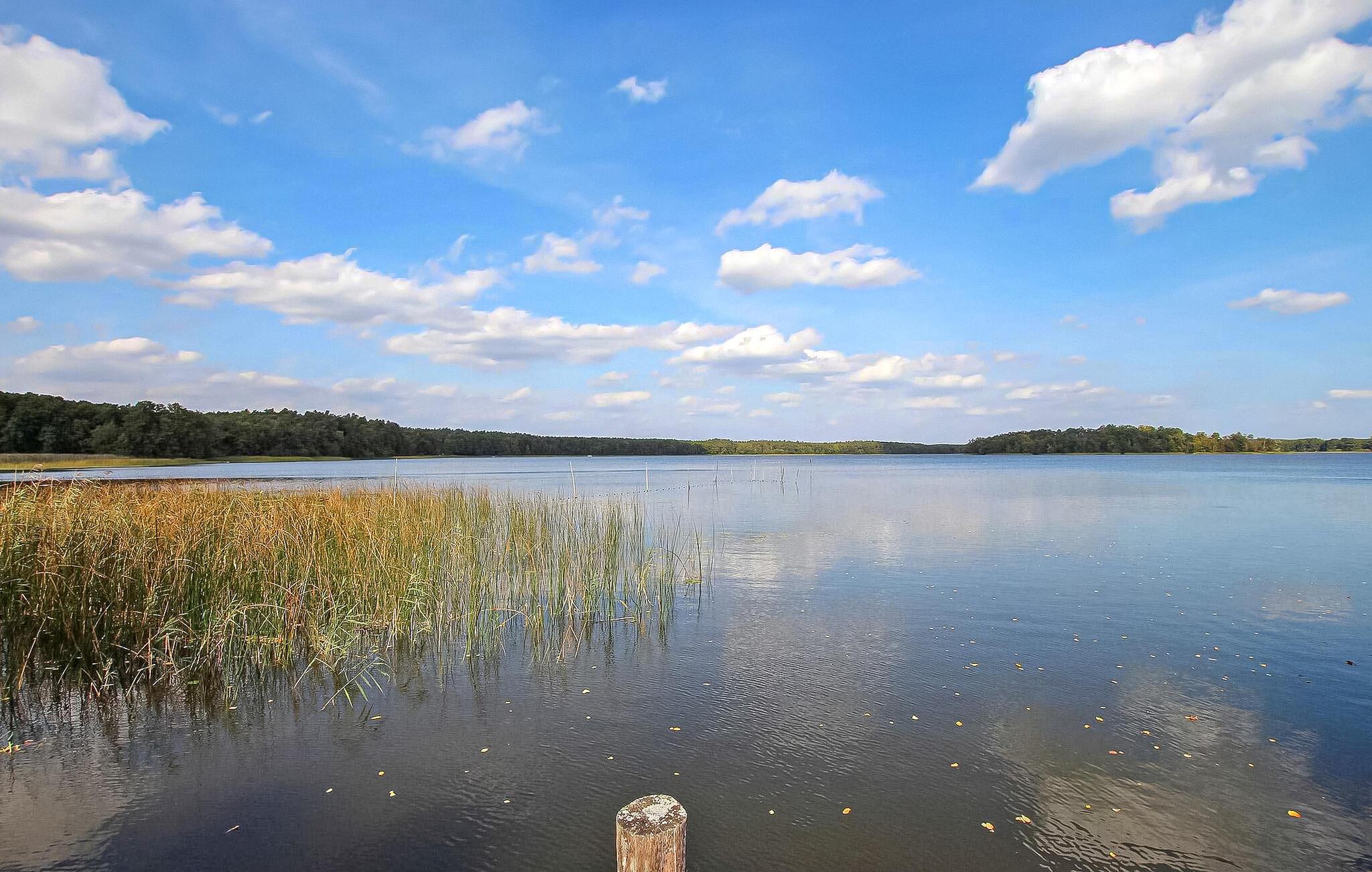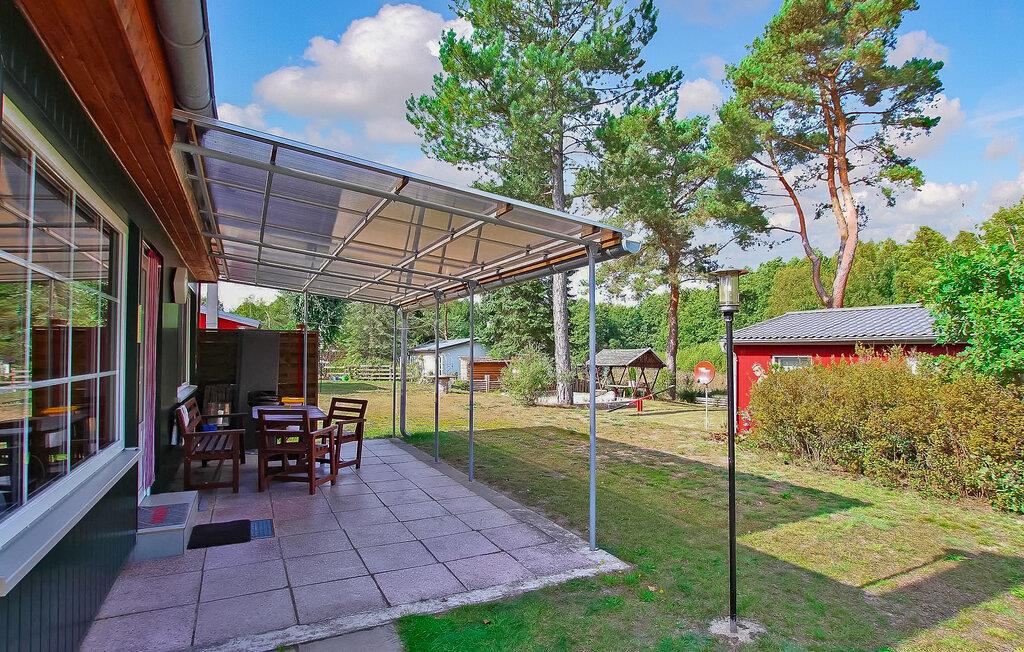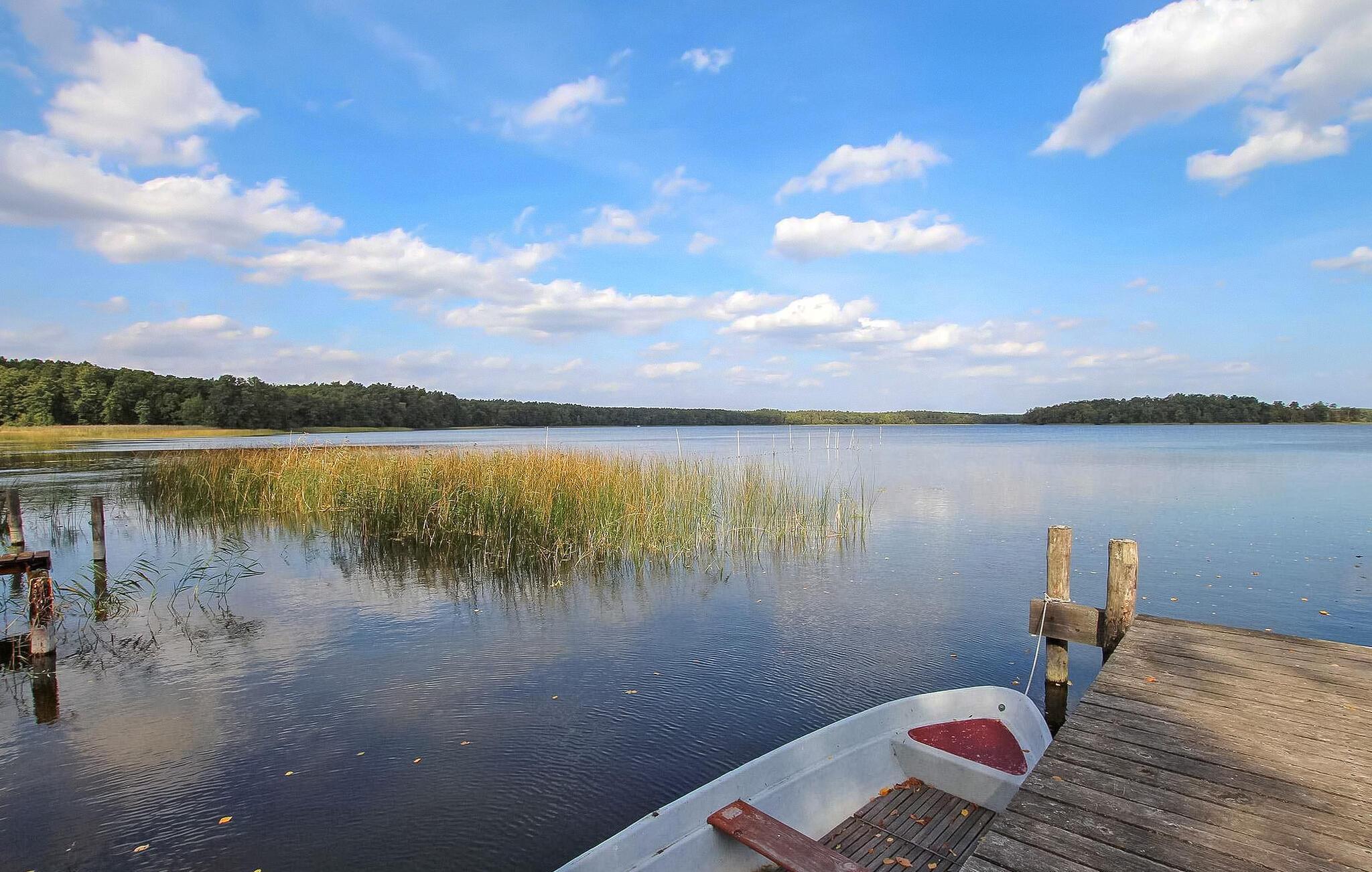 Dette af tre feriehuse er beliggende på en separat, 3000 kvadratmeter stor fritidsejendom i en rolig by- og skovbryns beliggenhed i Warenthin. Kun en uberørt vådområdebiotop adskiller ejendommen fra Rheinsbergsøen. Privat badebro med robåd pr. sommerhus (5 EUR/dag), lille badeområde og restauranter inden for 500 m. Feriehuset er udstyret med: stue (polstrede møbler med sovefunktion, tv, radio, pejs), 1 soveværelse ( dobbeltseng 140x200), 1 lille børneværelse (sovesofa), åbent tekøkken (el-komfur, køleskab med fryser, diverse køkkenmaskiner), bad/WC, el-varme evt. Til rådighed: overdækket terrasse med opholdsområde, grill, 2 simple cykler hver (børnecykel til rådighed). (anmodning), lille legeplads, bålplads, brænde mod betaling, parkeringsplads og cykelparkering. Ejendommen er indhegnet. Slutrengøring og vand er inkluderet i den samlede pris. Betales på stedet: Energi efter forbrug, turistskat, brænde hvis nødvendigt, sengelinned og håndklæder kan medbringes eller lejes. Der er højst tilladt 2 hunde på op til 40 cm i denne ejendom. Kæledyr er ikke tilladt i juli og august eller på helligdage. Warenthin er et lille feriested i et skovområde direkte ved Rheinsberg-søen. I byen, der har restaurant, båd-, kano- og cykeludlejning samt minibutik, er der langt flere ferieboliger end beboelseshuse takket være et stort sommerhuskompleks og en campingplads. De bedste betingelser for vandreture, cykling, fiskeri, vandvandring, svampeplukning og for naturrejsende, der søger fred og ro. Den tidligere boligby Rheinsberg med et seværdigt slot, en kammeropera og talrige seværdigheder ligger cirka 4 km væk.