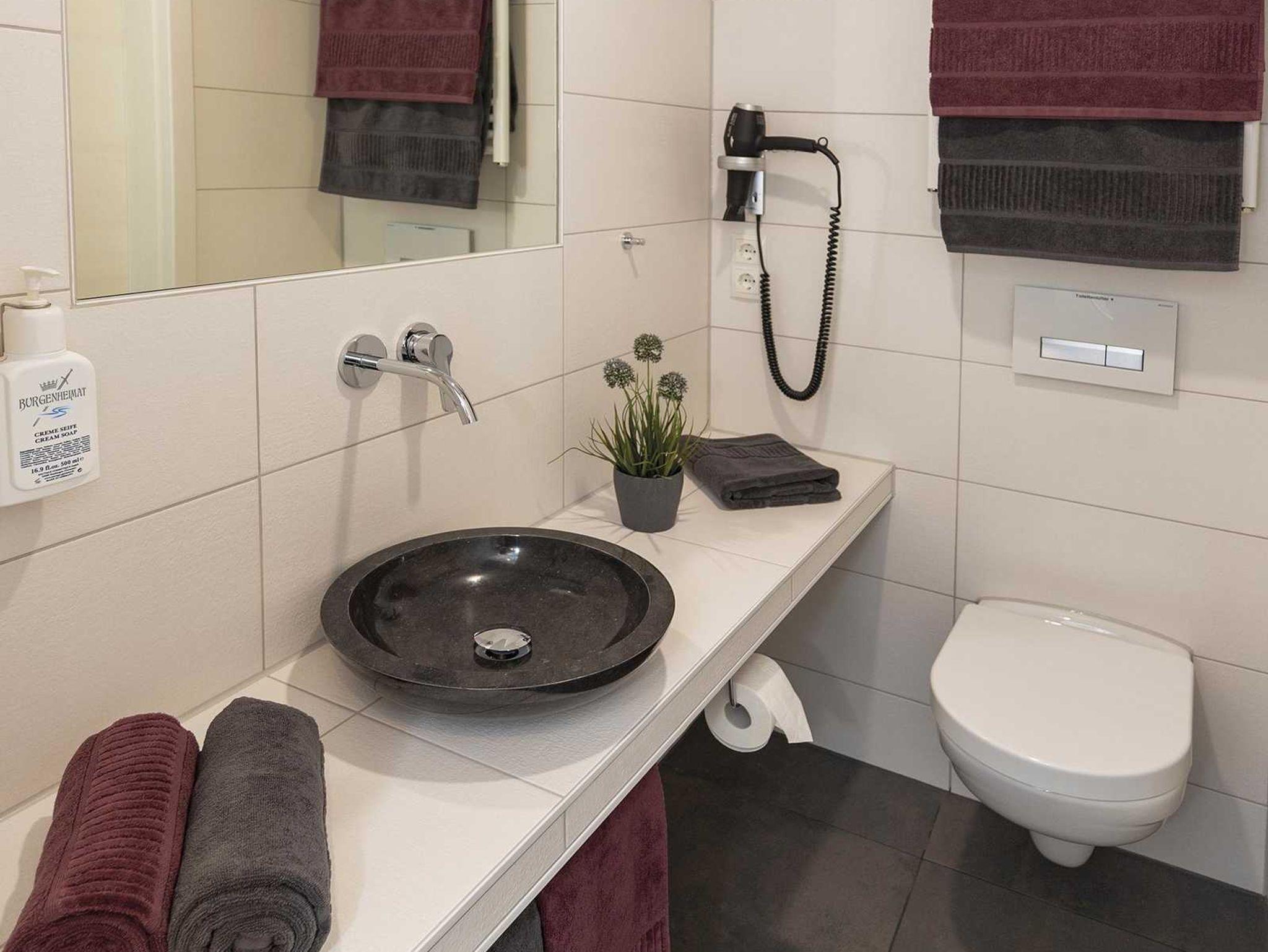 Im Haus Burgenheimat befinden sich 8 Apartments: 2 Princesize-Apartments (20 - 30 m²), 1 Queensize-Studioapartment (25 m²), 2 Queensize-Apartments (30 - 40 m²) und 3 Kingsize-Apartments (40 - 50 m²). Schlafen Sie wie ein König in den komfortablen überlangen Boxspringbetten (2,20 m) der Premium-Marke Royal Bedding®. Die Bettbreite beträgt in den Princesize-Apartments 1,00 m, in den Queensize-Apartments 1,60 m und in den Kingsize-Apartments 2,00 m. Alle Betten haben eine durchgängige extrahohe Matratze für besonderen Schlafkomfort. Im ?Thronsaal?, dem modernen Badezimmer, erwartet Sie ein WC mit integrierter Lüftung, ein stilvolles Waschbecken und eine bodengleiche Dusche mit Regenbrause und Handbrause. Die Küche ist mit allem, was man braucht, ausgestattet. Bereiten Sie sich z.B. ein leckeres Frühstück mit dem Tefal Toast'n'Egg und brühen sich Ihren Kaffee mit der Senseo Switch entweder mit Filter oder mit Kaffeepad. Auf dem 4-Platten-Cerankochfeld lassen sich auch komplette Menüs zubereiten. Eine Mikrowelle mit Grillfunktion sorgt für Essen in Minutenschnelle. Und damit der Abwasch nicht lästig wird, steht eine kompakte Geschirrspülmaschine bereit. Durchdachte Annehmlichkeiten erwarten Sie in jedem Raum der Apartments: ein digitaler Türspion, USB-Anschlüsse an den Leuchten am Bett sowie am Schreibtisch, eine integrierte Toilettenlüftung, eine bodengleiche Dusche mit Regenbrause, ein Laptop-Safe, überlange Betten, extrahohe Matratzen, große UHD-Smart-TVs, vollausgestattete Küche inkl. kompaktem Geschirrspüler. Neben der Selbstverpflegung besteht die Möglichkeit am Frühstücksbuffet des Hotels teilzunehmen. Als Gast erhalten Sie außerdem für die Dauer Ihres Aufenthalts ein kostenfreies Gästeticket für die Nutzung des ÖPNV im Gebiet des VRM.