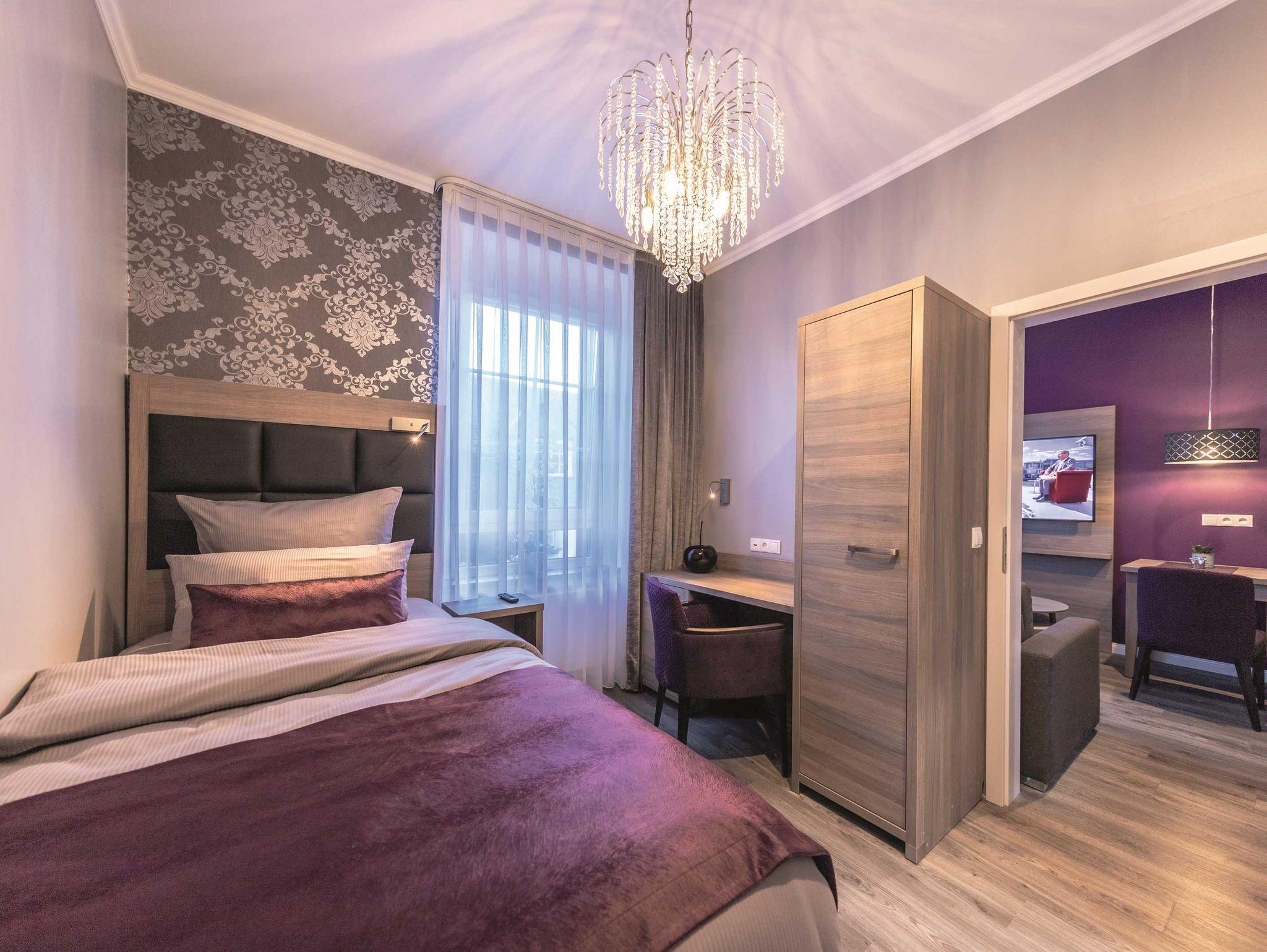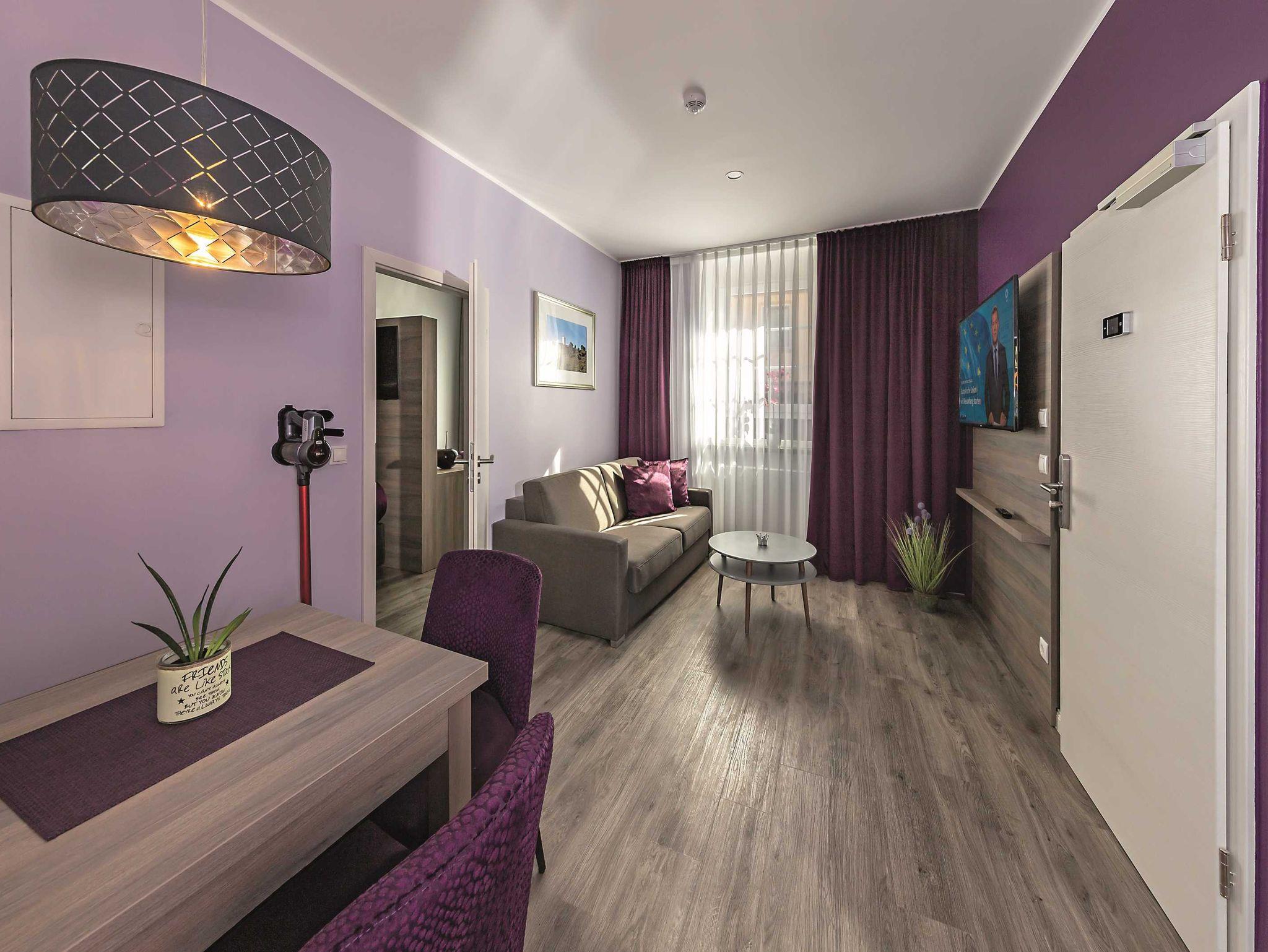 Im Haus Burgenheimat befinden sich 8 Apartments: 2 Princesize-Apartments (20 - 30 m²), 1 Queensize-Studioapartment (25 m²), 2 Queensize-Apartments (30 - 40 m²) und 3 Kingsize-Apartments (40 - 50 m²). Schlafen Sie wie ein König in den komfortablen überlangen Boxspringbetten (2,20 m) der Premium-Marke Royal Bedding®. Die Bettbreite beträgt in den Princesize-Apartments 1,00 m, in den Queensize-Apartments 1,60 m und in den Kingsize-Apartments 2,00 m. Alle Betten haben eine durchgängige extrahohe Matratze für besonderen Schlafkomfort. Im ?Thronsaal?, dem modernen Badezimmer, erwartet Sie ein WC mit integrierter Lüftung, ein stilvolles Waschbecken und eine bodengleiche Dusche mit Regenbrause und Handbrause. Die Küche ist mit allem, was man braucht, ausgestattet. Bereiten Sie sich z.B. ein leckeres Frühstück mit dem Tefal Toast'n'Egg und brühen sich Ihren Kaffee mit der Senseo Switch entweder mit Filter oder mit Kaffeepad. Auf dem 4-Platten-Cerankochfeld lassen sich auch komplette Menüs zubereiten. Eine Mikrowelle mit Grillfunktion sorgt für Essen in Minutenschnelle. Und damit der Abwasch nicht lästig wird, steht eine kompakte Geschirrspülmaschine bereit. Durchdachte Annehmlichkeiten erwarten Sie in jedem Raum der Apartments: ein digitaler Türspion, USB-Anschlüsse an den Leuchten am Bett sowie am Schreibtisch, eine integrierte Toilettenlüftung, eine bodengleiche Dusche mit Regenbrause, ein Laptop-Safe, überlange Betten, extrahohe Matratzen, große UHD-Smart-TVs, vollausgestattete Küche inkl. kompaktem Geschirrspüler. Neben der Selbstverpflegung besteht die Möglichkeit am Frühstücksbuffet des Hotels teilzunehmen. Als Gast erhalten Sie außerdem für die Dauer Ihres Aufenthalts ein kostenfreies Gästeticket für die Nutzung des ÖPNV im Gebiet des VRM.