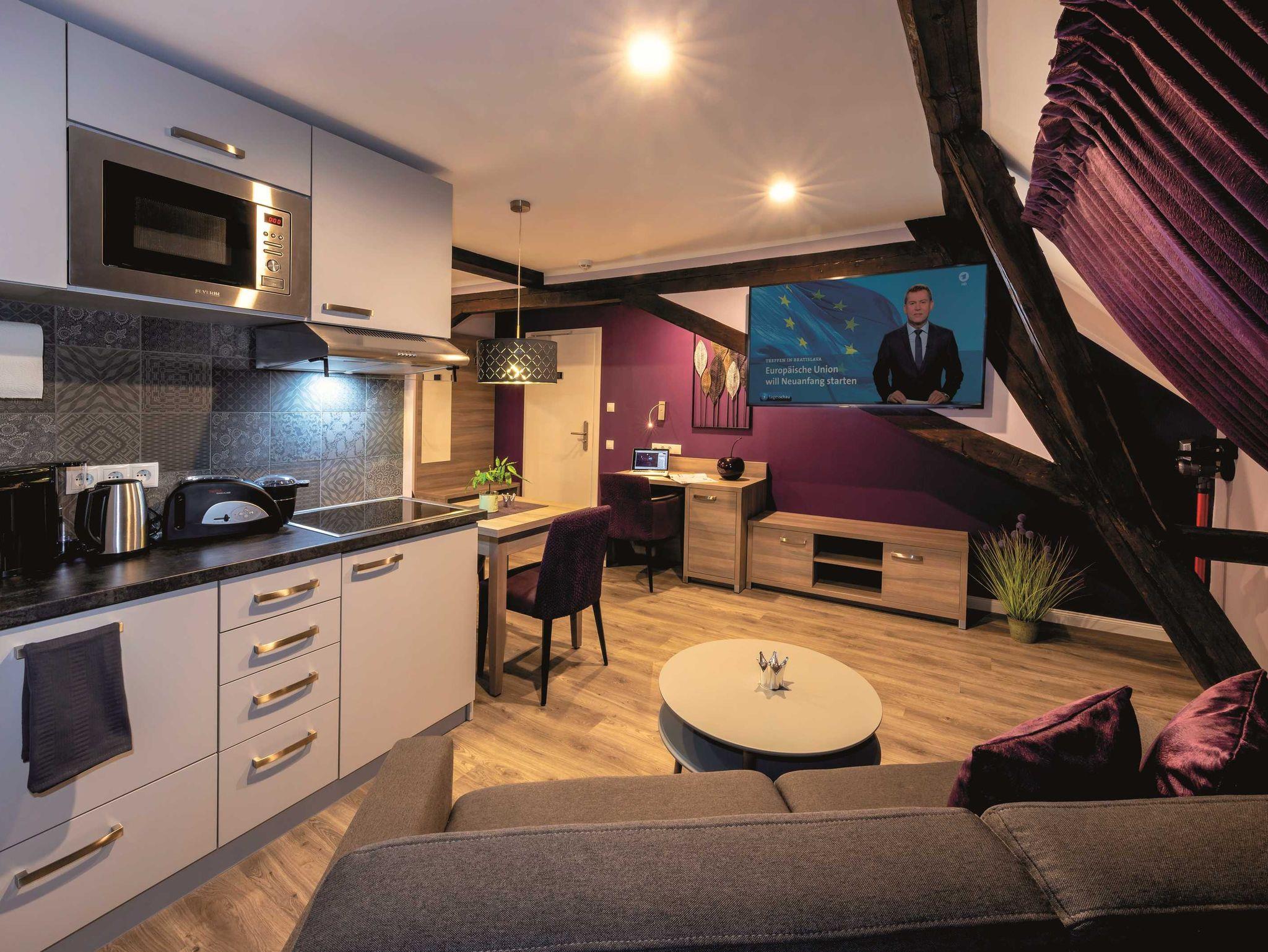 Im Haus Burgenheimat befinden sich 8 Apartments: 2 Princesize-Apartments (20 - 30 m²), 1 Queensize-Studioapartment (25 m²), 2 Queensize-Apartments (30 - 40 m²) und 3 Kingsize-Apartments (40 - 50 m²). Schlafen Sie wie ein König in den komfortablen überlangen Boxspringbetten (2,20 m) der Premium-Marke Royal Bedding®. Die Bettbreite beträgt in den Princesize-Apartments 1,00 m, in den Queensize-Apartments 1,60 m und in den Kingsize-Apartments 2,00 m. Alle Betten haben eine durchgängige extrahohe Matratze für besonderen Schlafkomfort. Im ?Thronsaal?, dem modernen Badezimmer, erwartet Sie ein WC mit integrierter Lüftung, ein stilvolles Waschbecken und eine bodengleiche Dusche mit Regenbrause und Handbrause. Die Küche ist mit allem, was man braucht, ausgestattet. Bereiten Sie sich z.B. ein leckeres Frühstück mit dem Tefal Toast'n'Egg und brühen sich Ihren Kaffee mit der Senseo Switch entweder mit Filter oder mit Kaffeepad. Auf dem 4-Platten-Cerankochfeld lassen sich auch komplette Menüs zubereiten. Eine Mikrowelle mit Grillfunktion sorgt für Essen in Minutenschnelle. Und damit der Abwasch nicht lästig wird, steht eine kompakte Geschirrspülmaschine bereit. Durchdachte Annehmlichkeiten erwarten Sie in jedem Raum der Apartments: ein digitaler Türspion, USB-Anschlüsse an den Leuchten am Bett sowie am Schreibtisch, eine integrierte Toilettenlüftung, eine bodengleiche Dusche mit Regenbrause, ein Laptop-Safe, überlange Betten, extrahohe Matratzen, große UHD-Smart-TVs, vollausgestattete Küche inkl. kompaktem Geschirrspüler. Neben der Selbstverpflegung besteht die Möglichkeit am Frühstücksbuffet des Hotels teilzunehmen. Als Gast erhalten Sie außerdem für die Dauer Ihres Aufenthalts ein kostenfreies Gästeticket für die Nutzung des ÖPNV im Gebiet des VRM.
