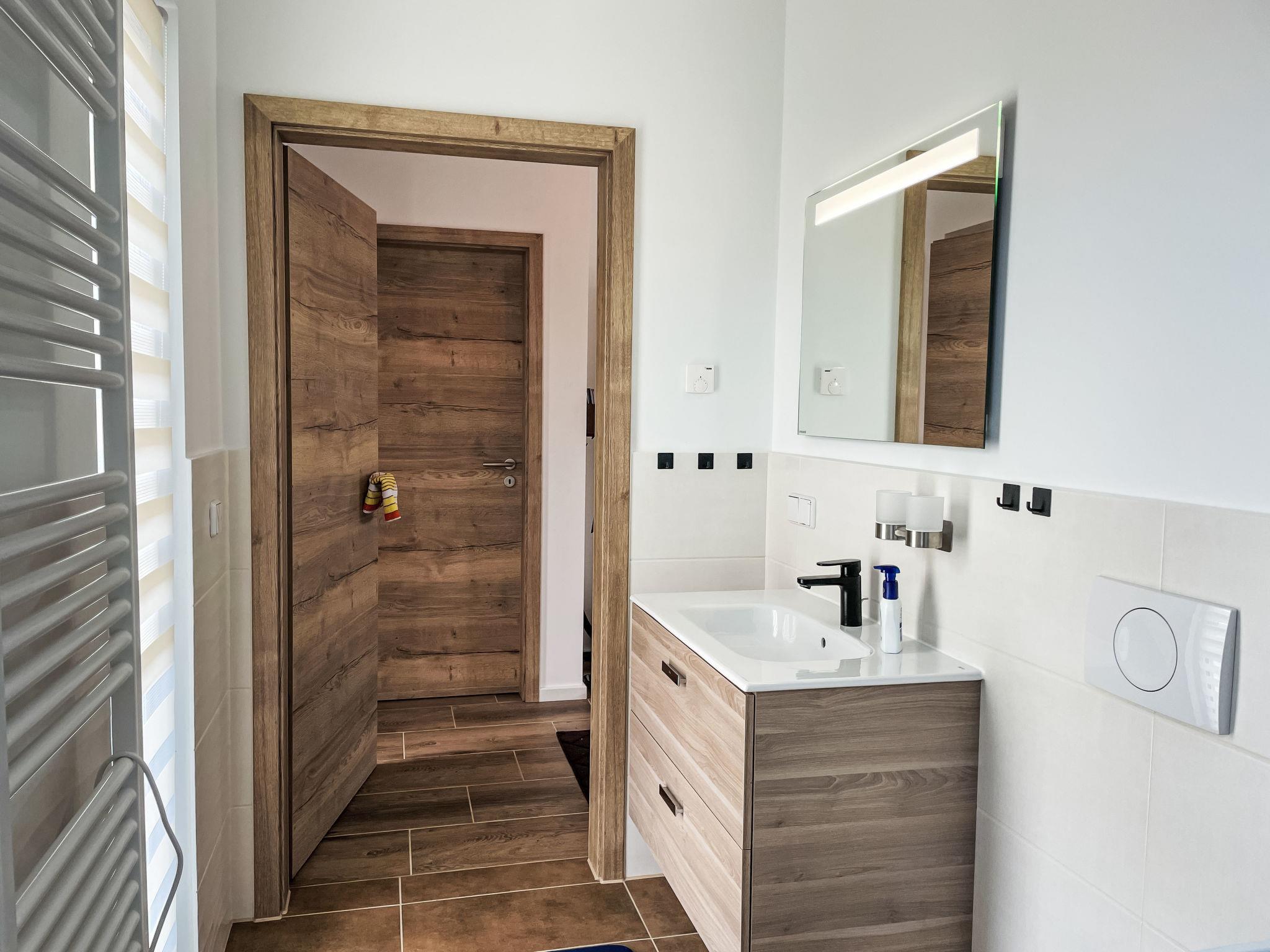 4-room house 108 m2, on the ground floor. Modern and cosy furnishings: living/dining room with Scandinavian wood stove, dining table and satellite TV (flat screen). Exit to the terrace. 1 room with 1 french bed (140 cm, length 200 cm). 1 room with 1 double bed (160 cm, length 200 cm). 1 room with 1 french bed (140 cm, length 200 cm), shower/WC. Open kitchen (oven, dishwasher, 4 ceramic glass hob hotplates, toaster, kettle, electric coffee machine). Bath/shower/WC. Heating. Terrace. Terrace furniture, barbecue (portable), deck chairs. Facilities: washing machine, iron, children's high chair, baby cot. Internet (WiFi, free). Parking (2 cars) at the house. Please note: suitable for families. Non-smoking house. Smoke alarm, fire extinguisher.