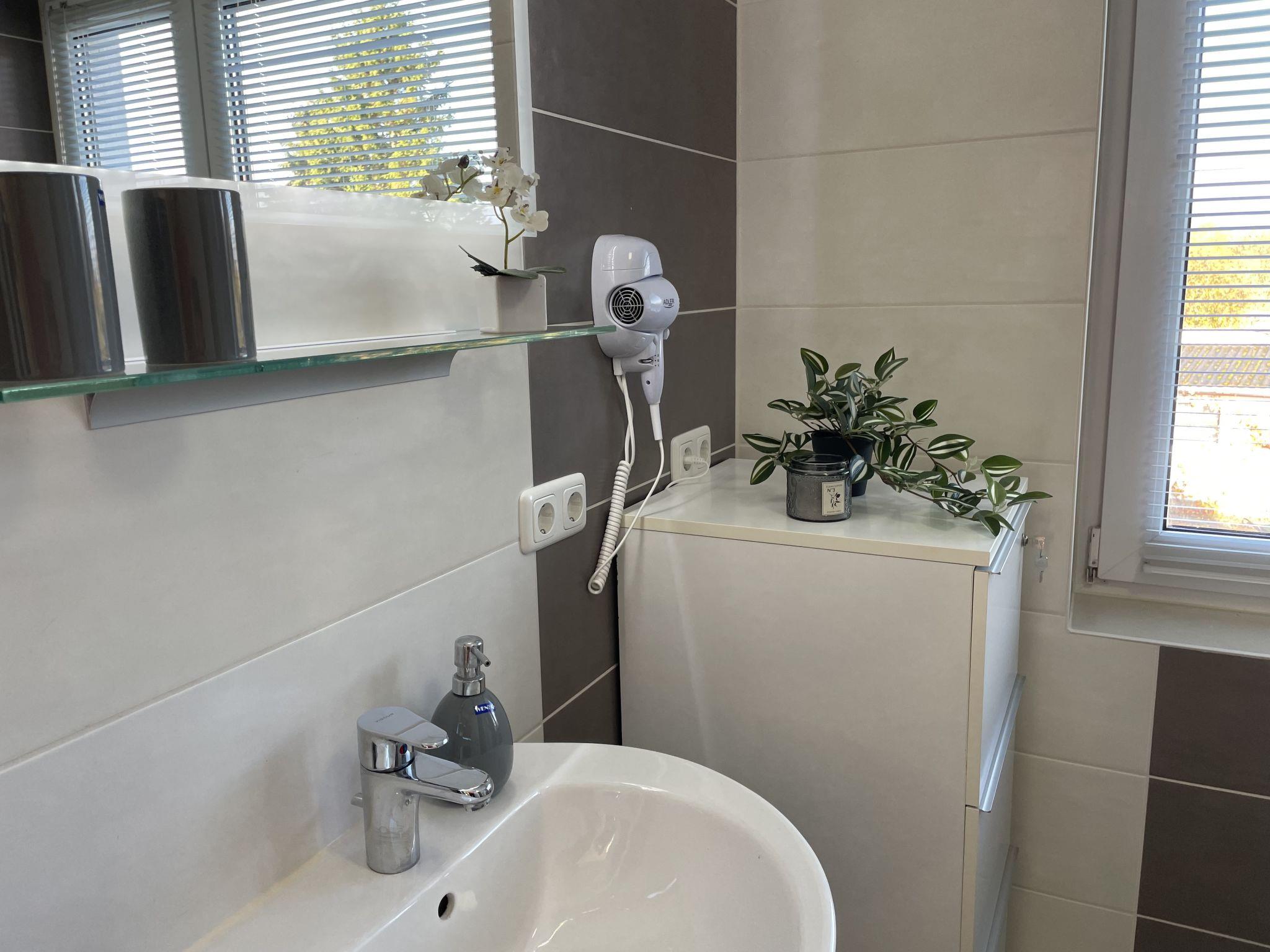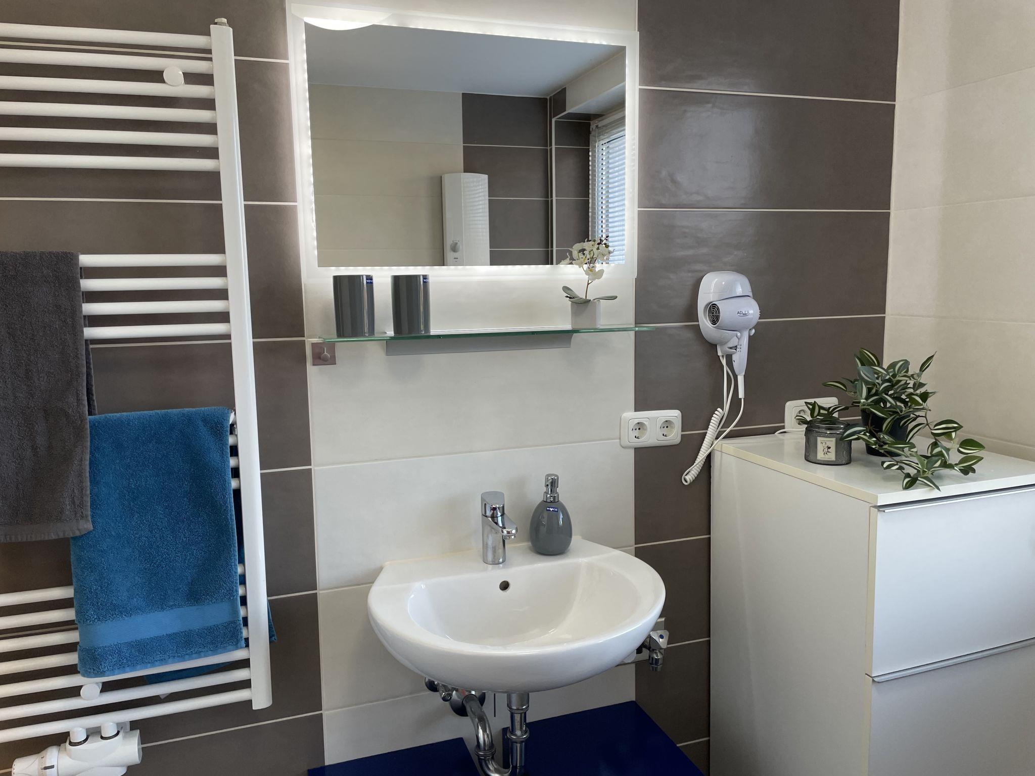 2-room apartment 60 m2 on 1st floor. Spacious and bright, renovated in 2020, beautiful and modern furnishings: 17 m2, 1 room with 1 double bed (180 cm, length 200 cm). Living room with 1 sofabed (140 cm, length 200 cm), satellite TV, flat screen and electric heating. Open kitchen (dishwasher, 2 ceramic glass hob hotplates, microwave, grill, electric coffee machine) with dining table, radio. Shower/WC. Natural stone floors. Small terrace 12 m2. Terrace furniture, barbecue. Facilities: safe, baby cot, hair dryer, baby changing unit. Internet (WiFi, free). Please note: suitable for families. Non-smokers only. Private entrance, smoke alarm, fire extinguisher.