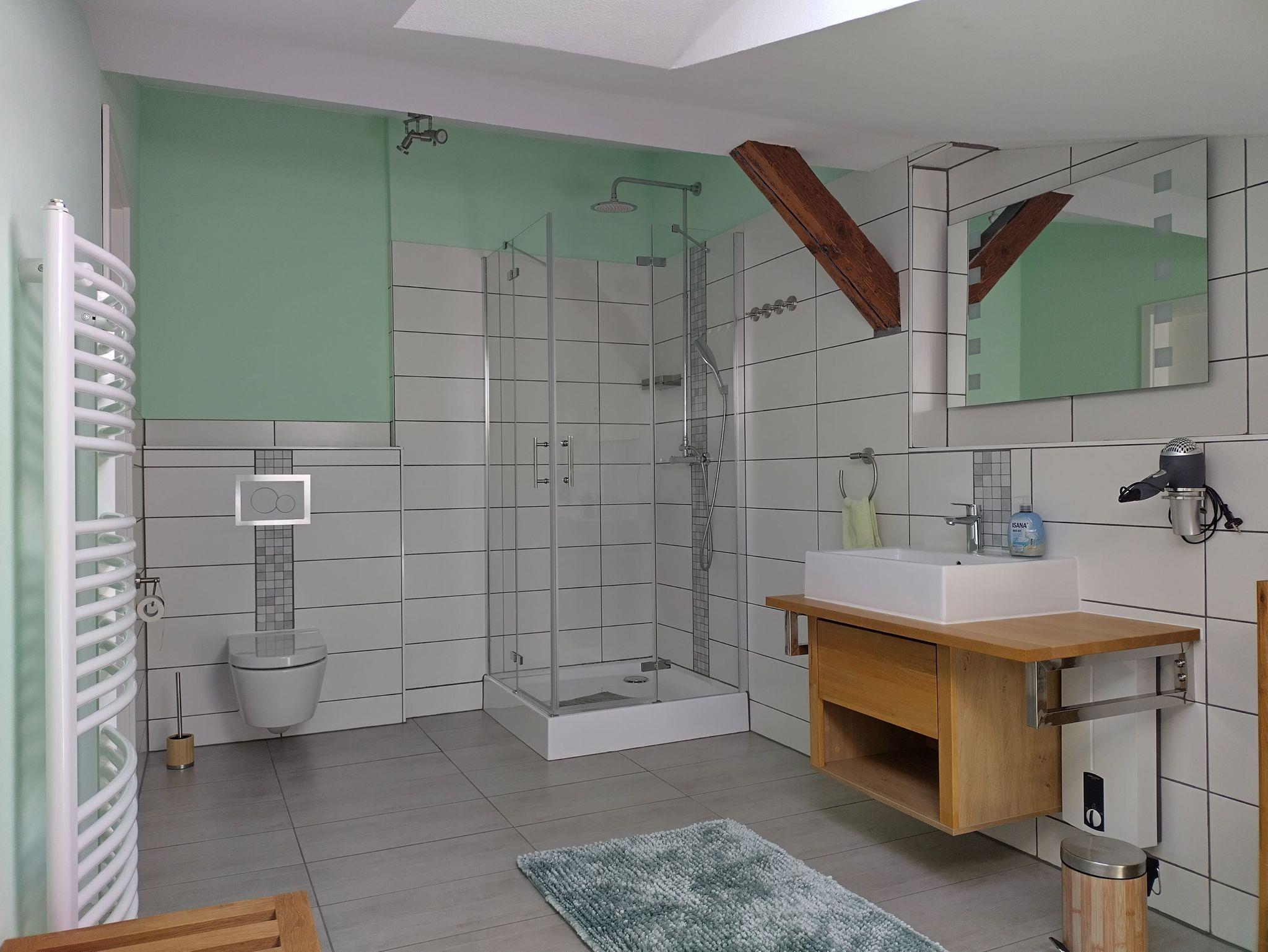 Die 70 qm große Ferienwohnung besteht aus 2 Schlafzimmern, einem großen Wohnzimmer mit offener Küche, einem großzügigen Badezimmer mit WC und Dusche, einem Essbereich mit großem Tisch und 4 Stühlen und einer Garderobe mit Spiegel. Die Küche besteht aus einer vollwertigen Küchenzeile mit Backofen/Cerankochfeld, Kühlschrank mit Gefrierfach und diversen Küchengeräten wie Mikrowelle, Toaster, Kaffeemaschine, Wasserkocher.
