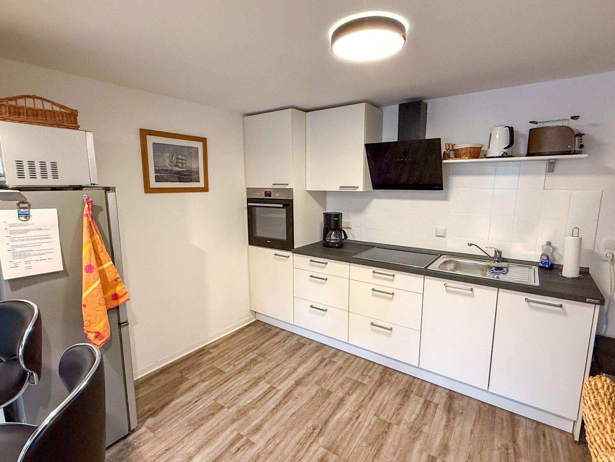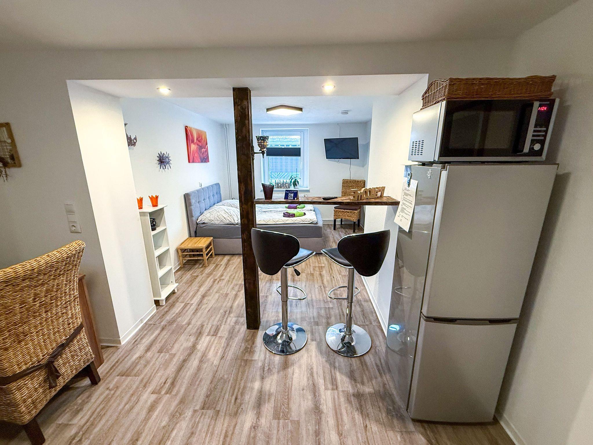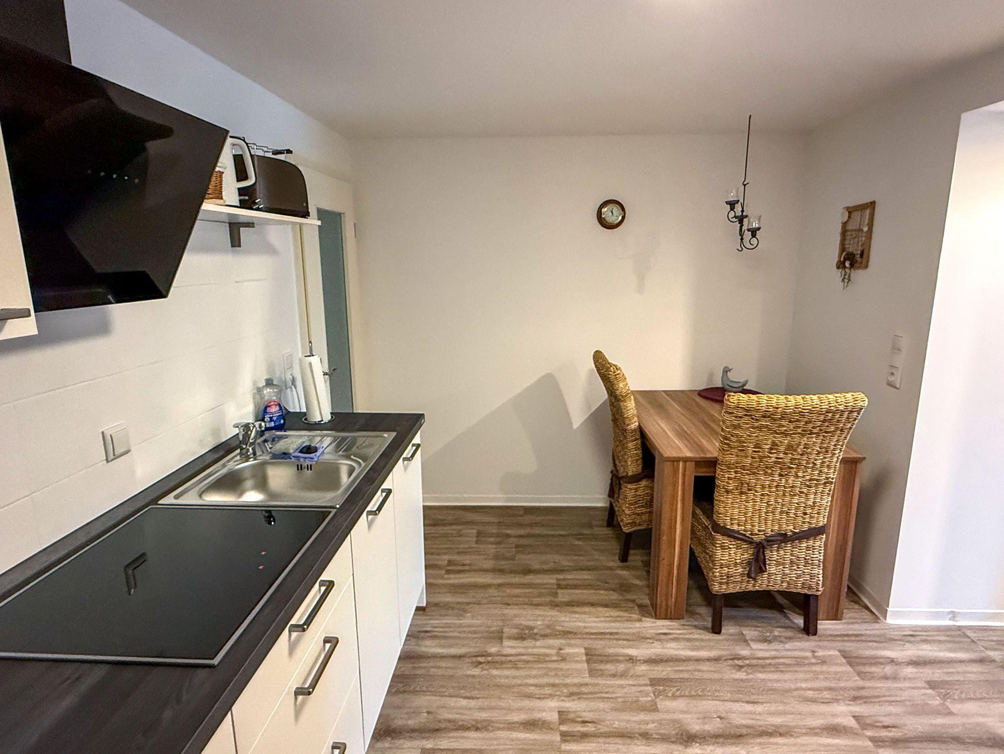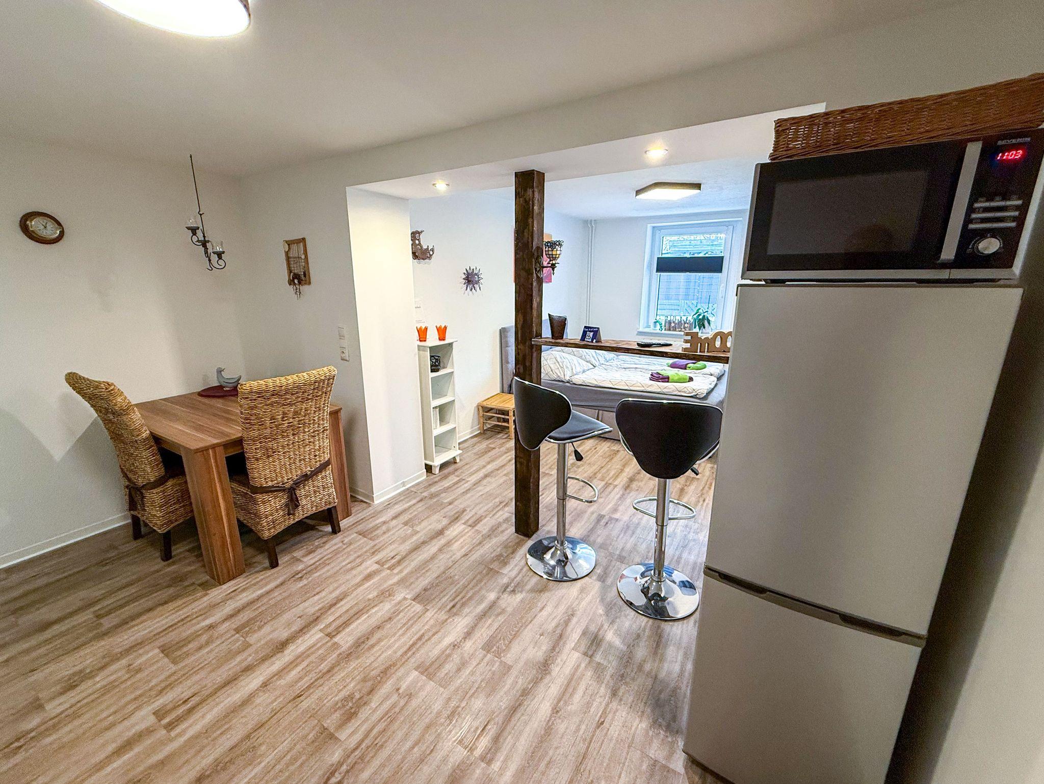 Die Ferienwohnung am Golfplatz ist ideal für Paare oder Alleinreisende und bietet auf 30 m² alles, was du für einen entspannten Aufenthalt brauchst. Sie liegt im Erdgeschoss und hat einen eigenen Eingang ? so kannst du deinen Urlaub in Ruhe genießen. Im kombinierten Wohn- und Schlafbereich sorgt ein bequemes Doppelbett (140x200) für erholsame Nächte - hier kannst du den Tag entspannt vor dem TV ausklingen lassen. Optisch wird der Schlafbereich von einem Balken mit Hochtisch und zwei Barstühlen von der Küche getrennt, was eine lockere Atmosphäre schafft. Die offene Küche mit Esstisch ist bestens ausgestattet: Backofen, Herd, Spülmaschine, Kühlschrank mit Gefrierfach, Mikrowelle, Kaffeemaschine, Wasserkocher und sogar ein Radio sorgen dafür, dass es dir beim Kochen an nichts fehlt. Das Tageslichtbad punktet mit einer Badewanne, die zum Entspannen nach einem erlebnisreichen Tag einlädt. Im Flur findest du eine Garderobe und einen Kleiderschrank ? hier kannst du deine Sachen ordentlich verstauen. Für gemütliche Stunden im Freien, wartet im Garten eine Sitzecke auf dich. Hier steht dir auch ein Grill für gemeinsame BBQ-Abende zur Verfügung.