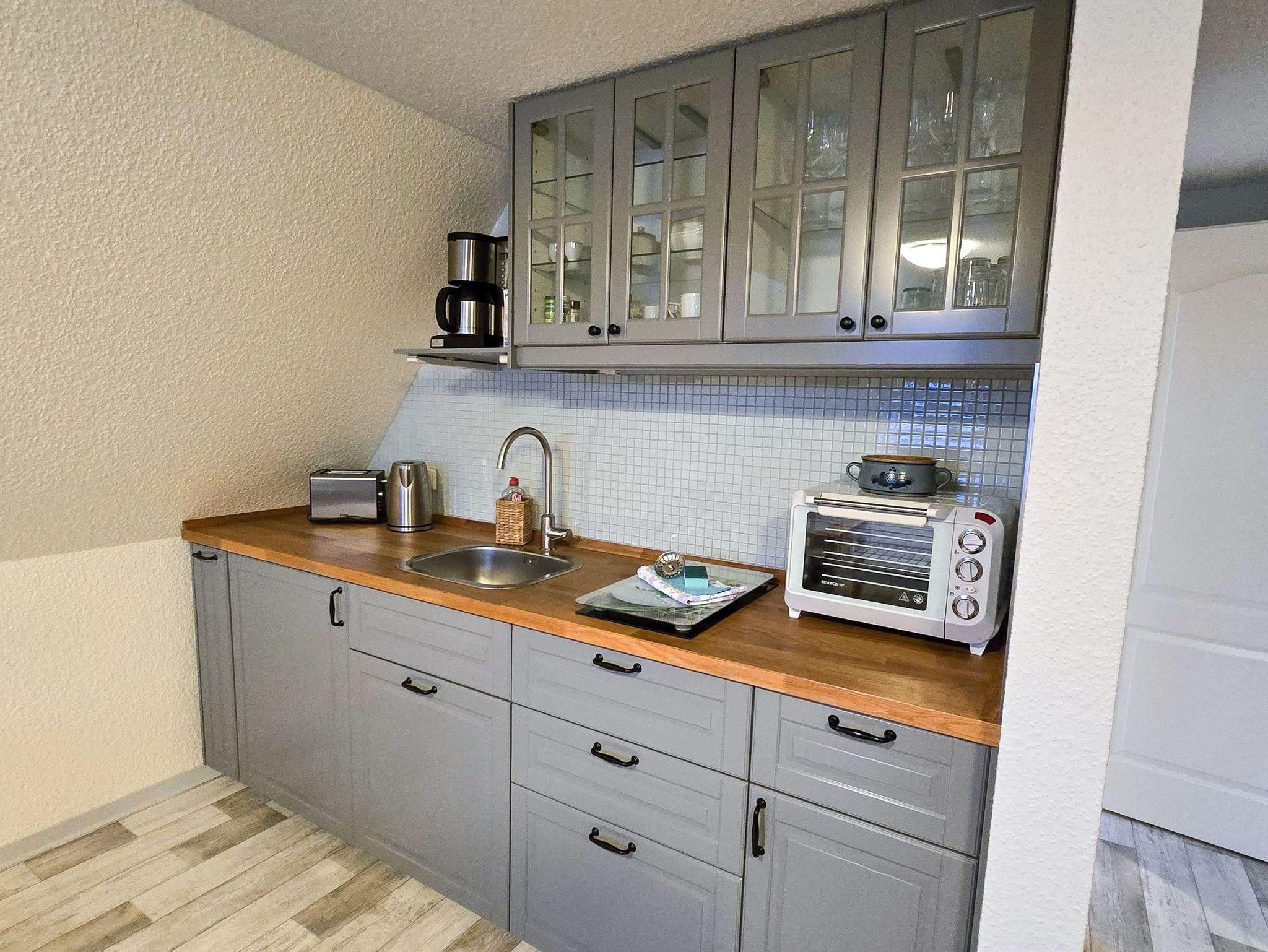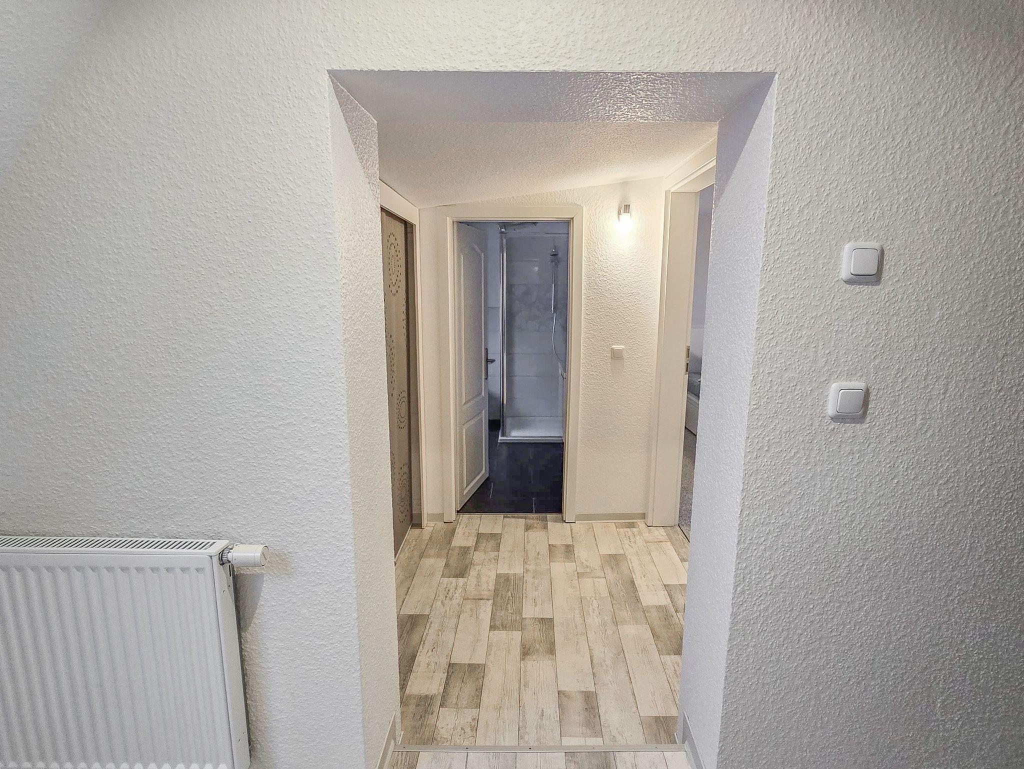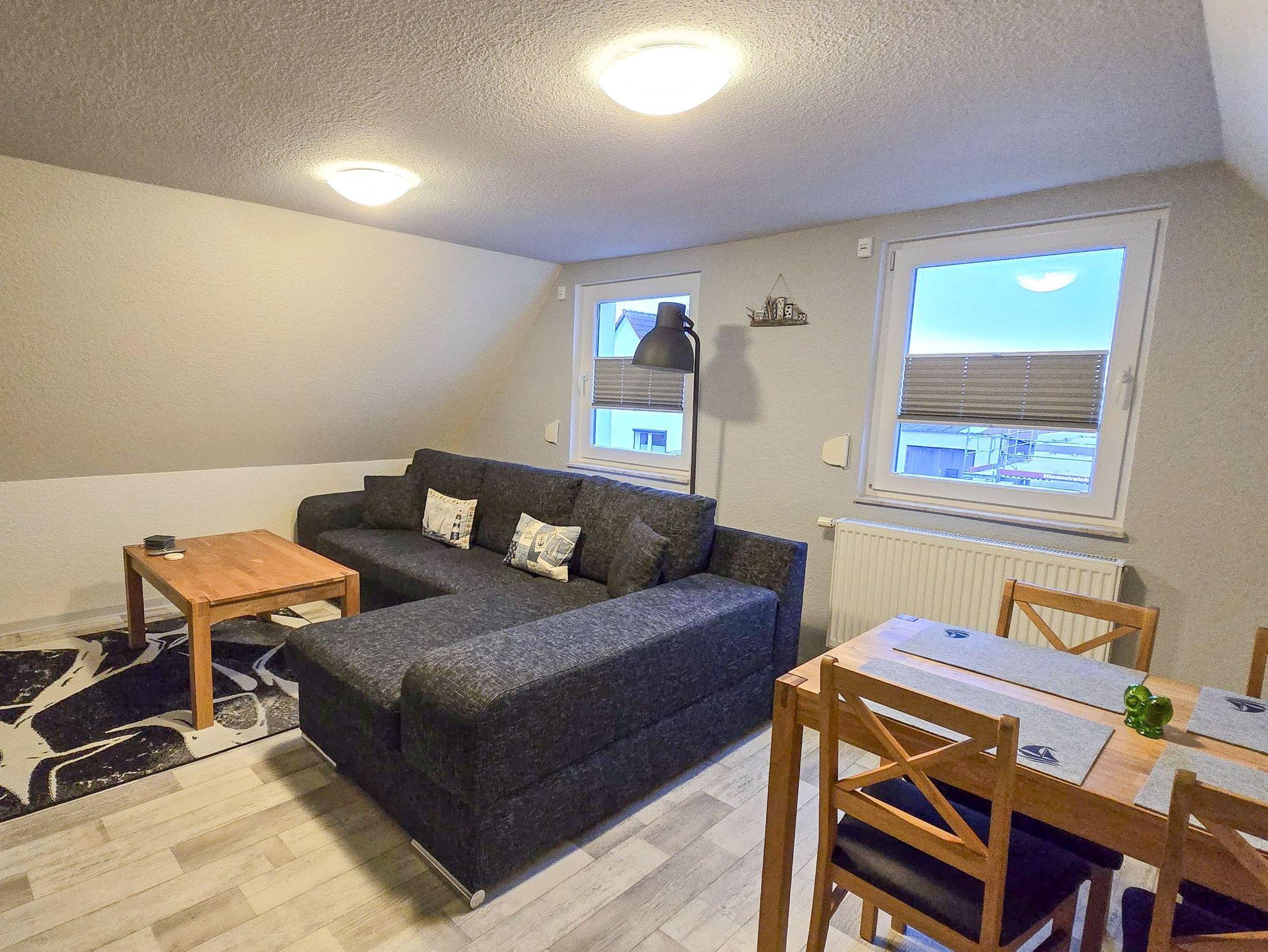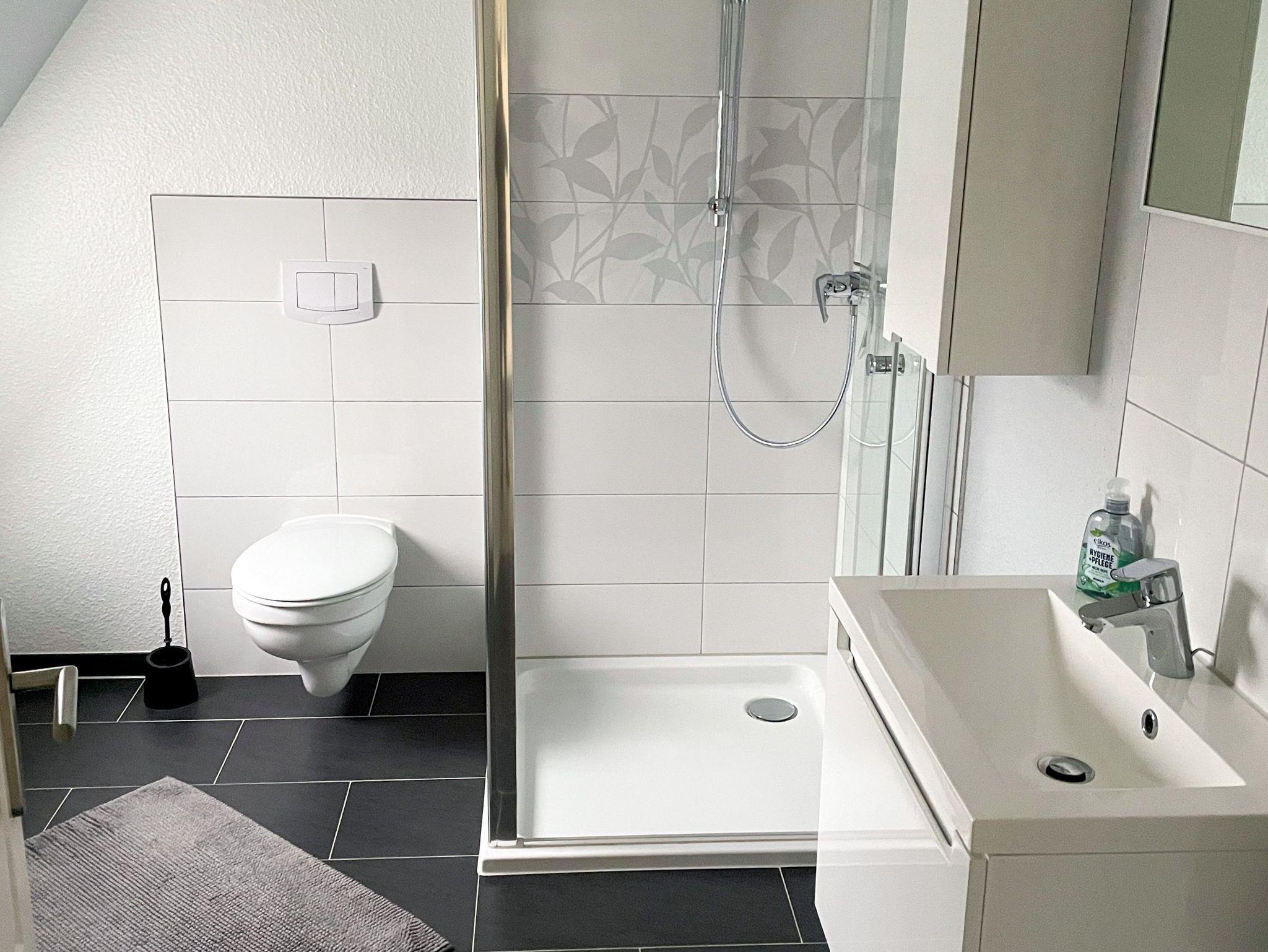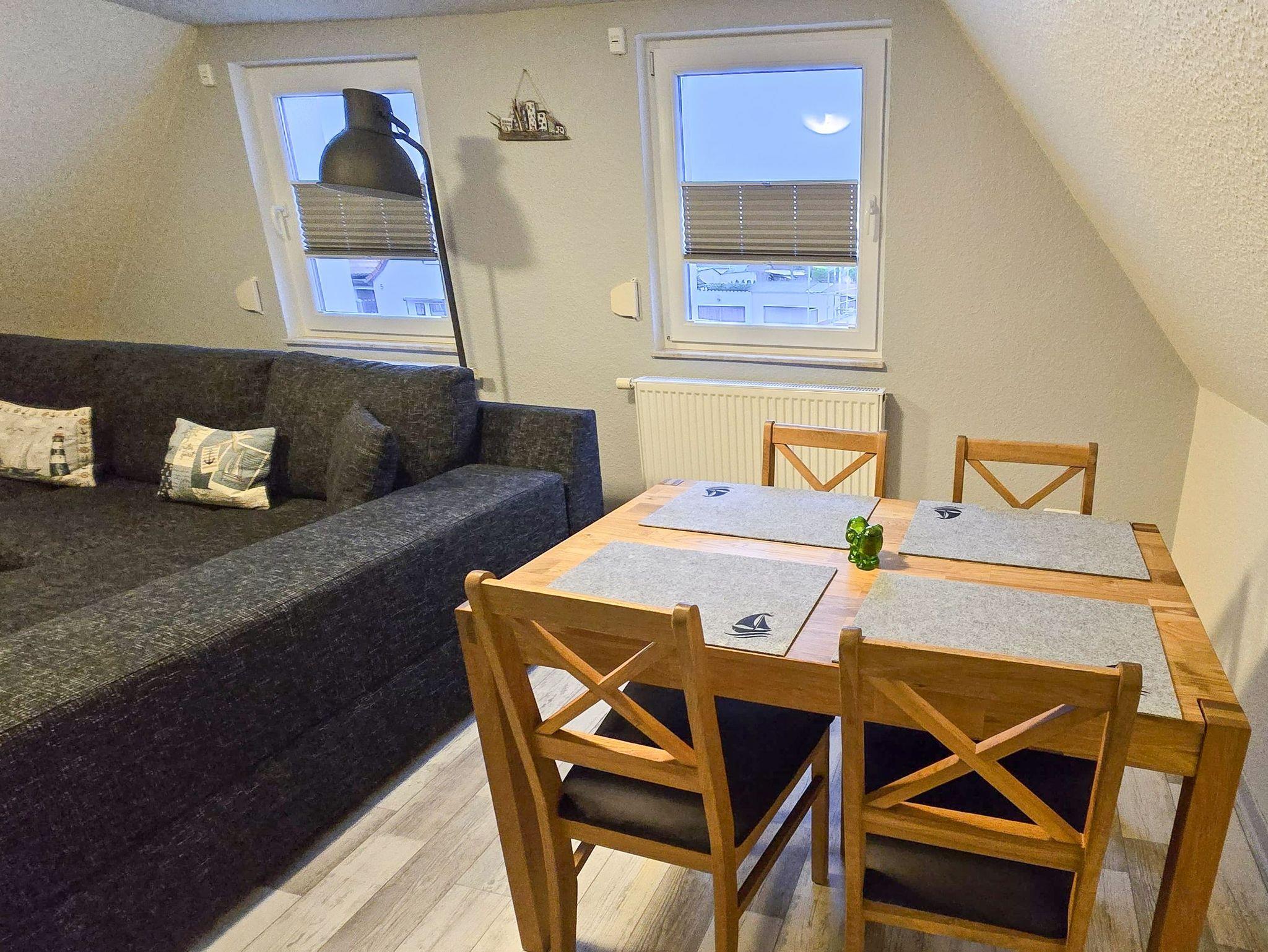 Die 50 m² große Ferienwohnung Ehling bietet einen gemütlichen Aufenthalt für 4 Personen. Sie befindet sich im Dachgeschoss eines Einfamilienhauses und hat einen separaten Eingang, welcher dich zunächst in einen kleinen Flur mit Garderobe führt. Über eine Treppe erreichst du dann die anderen Zimmer der Ferienwohnung. Der Wohnbereich mit offener Küche ist einladend gestaltet und bietet dir ein Schlafsofa (180x220), sowie einen TV für entspannte Abende. Die offene Küche ist praktisch ausgestattet mit zwei Herdplatten, einem Minibackofen für kleine Gerichte wie Brötchen oder Pizza, einem Kühlschrank mit Gefrierfach, einer Kaffeemaschine, einem Wasserkocher und einem Toaster. Am Esstisch kannst du deine Mahlzeiten genießen. Das separate Schlafzimmer verfügt über ein Doppelbett (180x200), einen Kleiderschrank mit ausreichend Stauraum und einen TV, sodass du auch hier deine Lieblingsserie schauen kannst. Das Bad ist mit einer Dusche und einem WC ausgestattet.