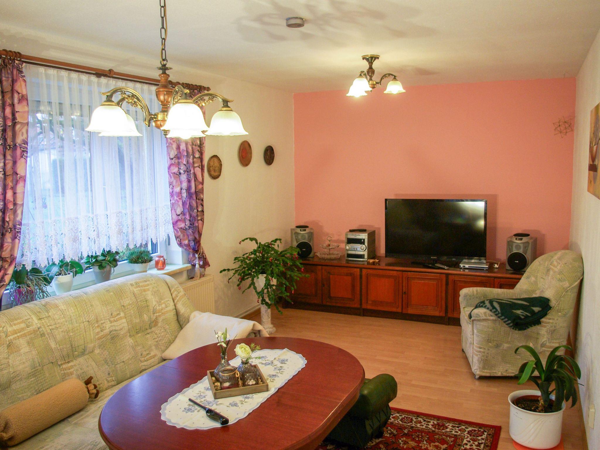 Die Ferienwohnung Joachim ist eine gemütliche Unterkunft für bis zu 2 Erwachsene und ein Kind bis 14 Jahre. Die Wohnung erstreckt sich mit 60 m² über zwei Etagen: Im Erdgeschoss erwartet dich ein gemütliches Wohnzimmer mit Sofa und TV ? der perfekte Ort, um nach einem erlebnisreichen Tag zu entspannen. Die separate Küche ist voll ausgestattet und bietet alles, was du für die Zubereitung deiner Mahlzeiten brauchst: einen Kühlschrank, Backofen, Herd, Spülmaschine, Mikrowelle, Toaster, Wasserkocher, Kaffeemaschine sowie nützliche Küchenhelfer. Das moderne Badezimmer verfügt über eine ebenerdige Dusche und ein WC. Im Obergeschoss befindet sich der Schlafbereich, der über eine Treppe direkt betreten wird und somit nicht separat abgetrennt ist. Hier findest du ein bequemes Doppelbett (180x200), ein Einzelbett (80x180) sowie einen großen Kleiderschrank mit ausreichend Platz für deine Garderobe. Auf der eigenen Terrasse kannst du die frische Luft genießen ? ausgestattet mit einem Grill, einem Sonnenschirm und bequemen Sitzmöbeln.