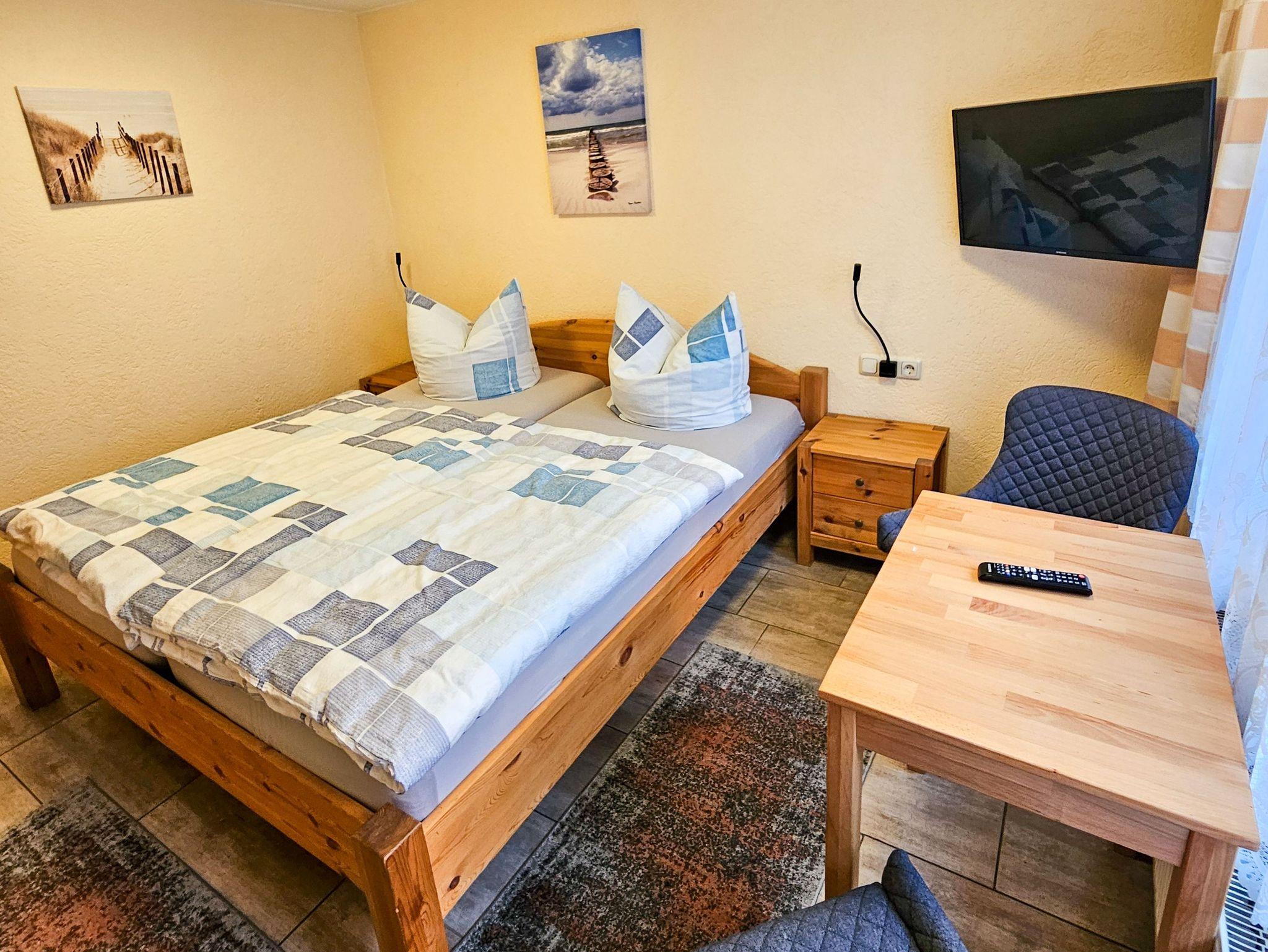 Das 14 m² große Doppelzimmer ist mit Naturholzmöbeln und modernem Komfort, wie Radio und TV ausgestattet. Es verfügt über ein Doppelbett (180 x 200) und Bad mit Dusche und WC. Eine kleine Sitzecke mit Tisch lädt Sie ein, vielleicht eine Karte an die Lieben zu schreiben oder einfach nur ein Buch zu lesen.