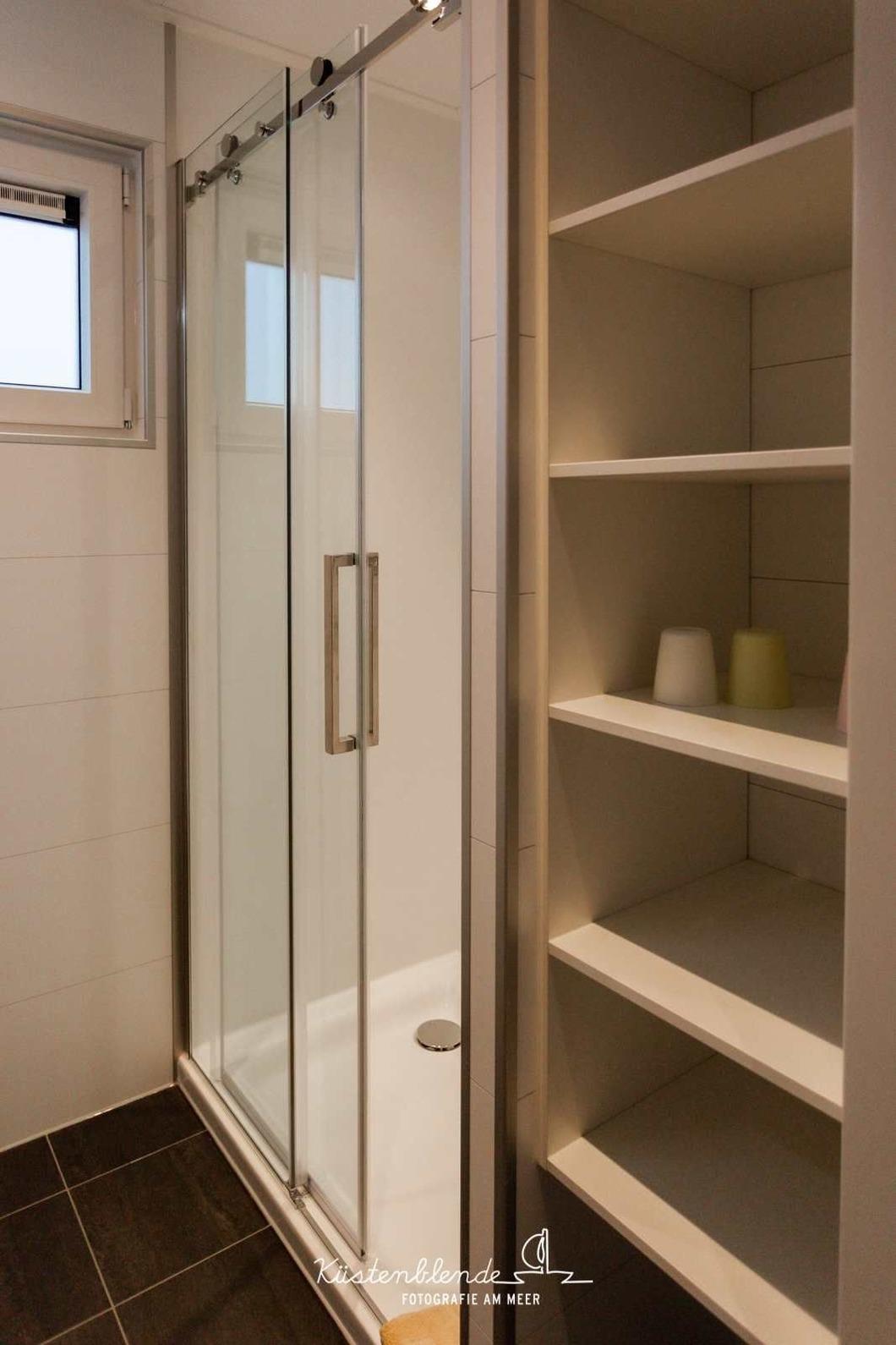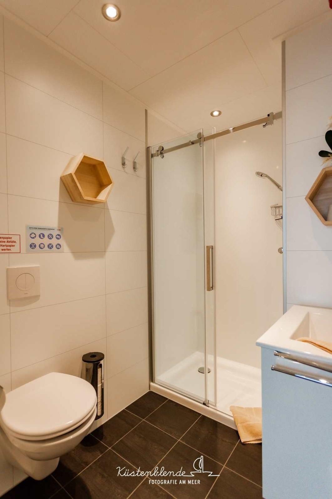 - gefliestes Bad mit Dusche, Waschbecken mit Unterschrank, Fön und LED-Spiegel