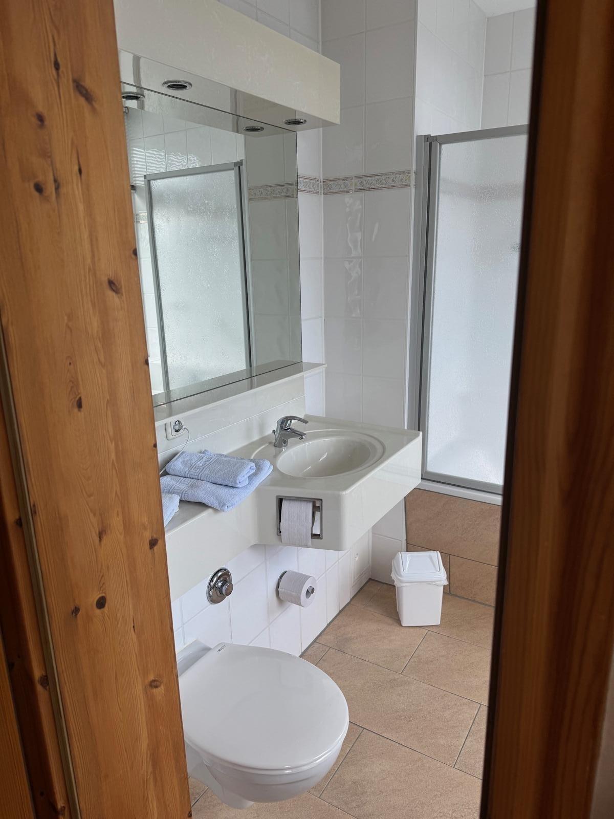 Das ansprechend eingerichtete Badezimmer verfügt über eine Badewanne oder Dusche samt Föhn.