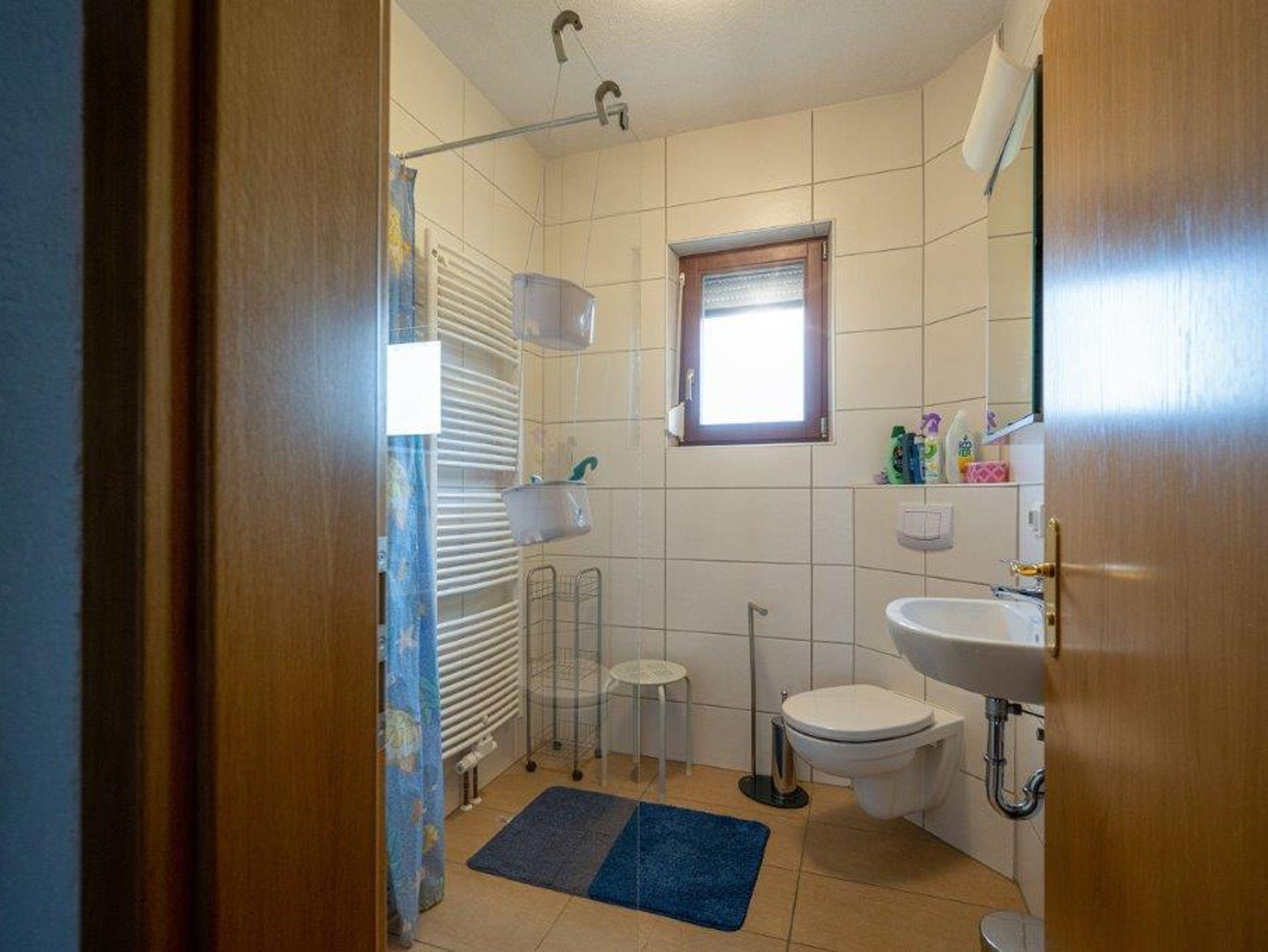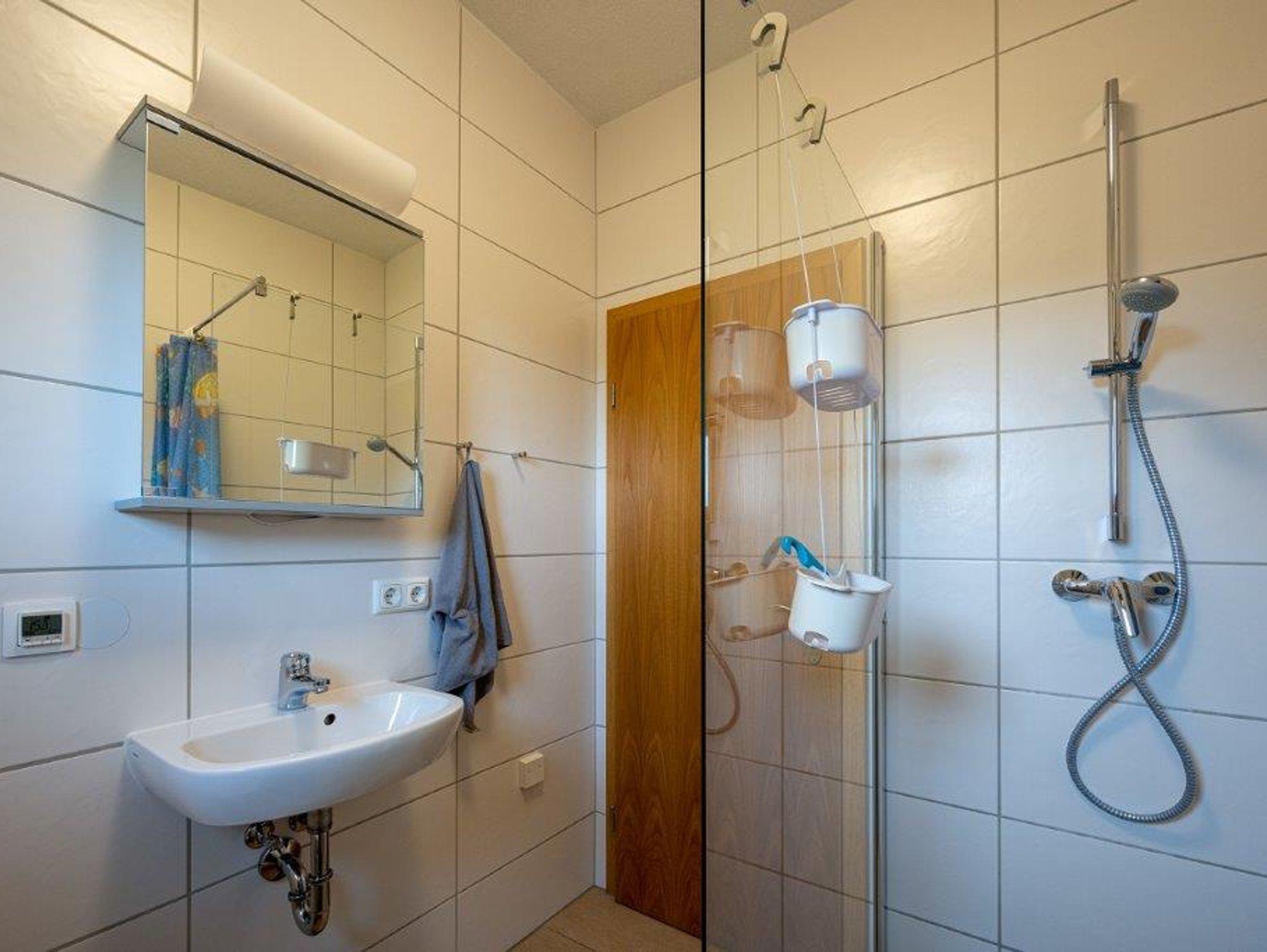 Das Bad hat eine ebenerdige Dusche, Waschbecken und WC.