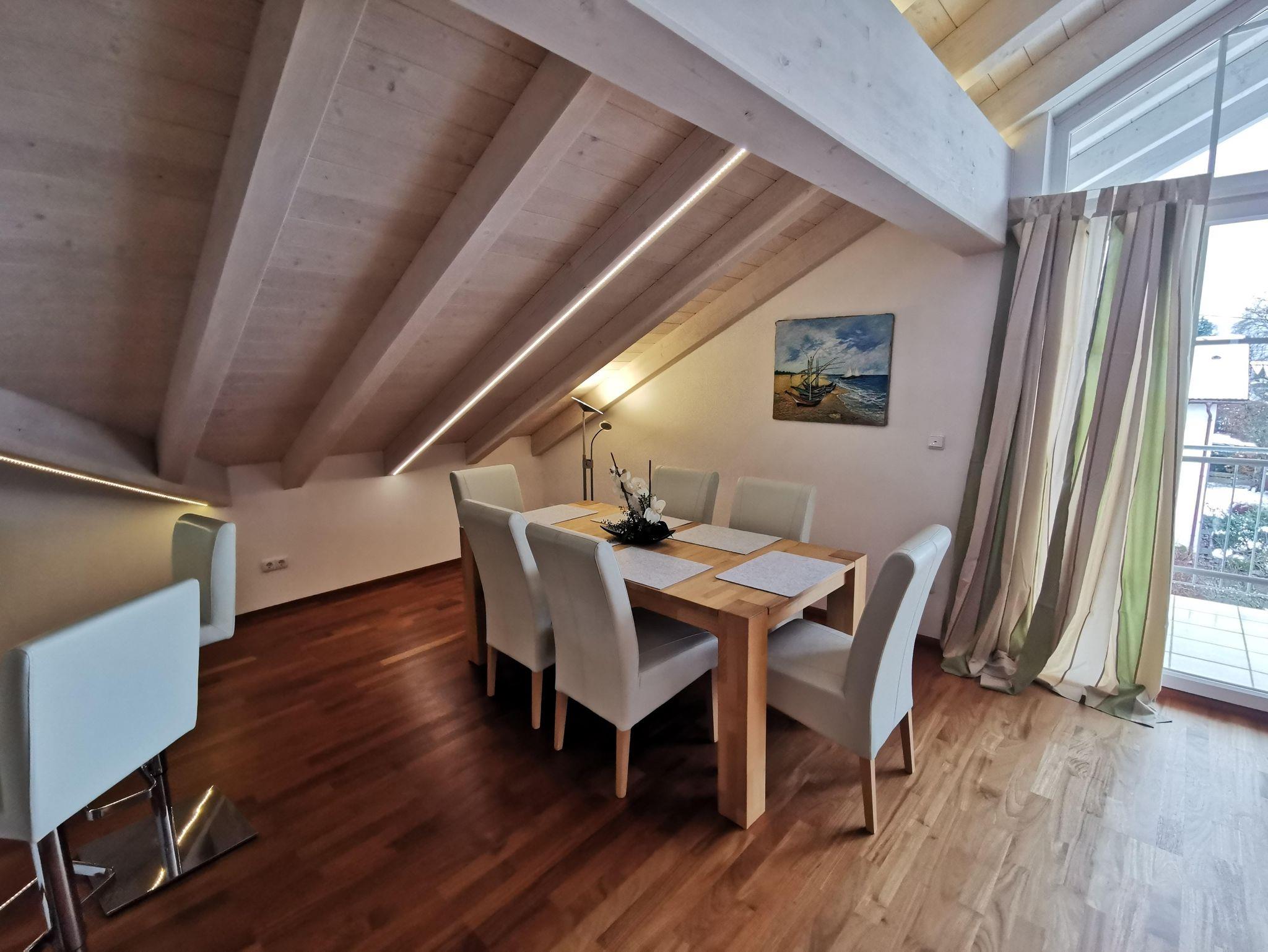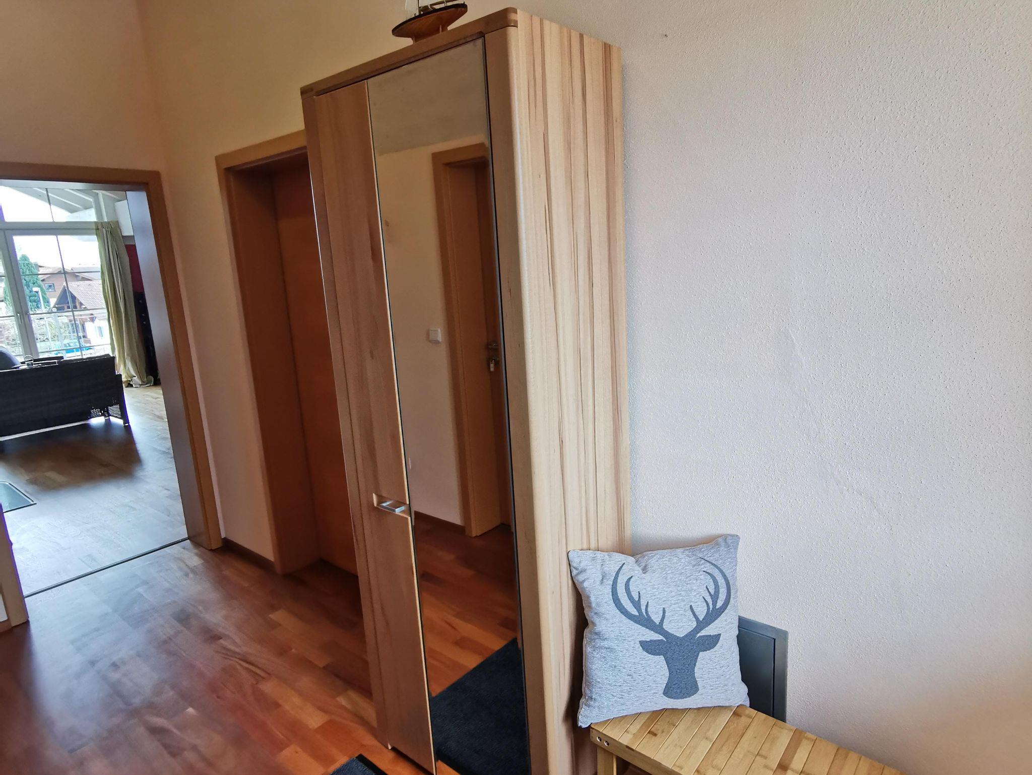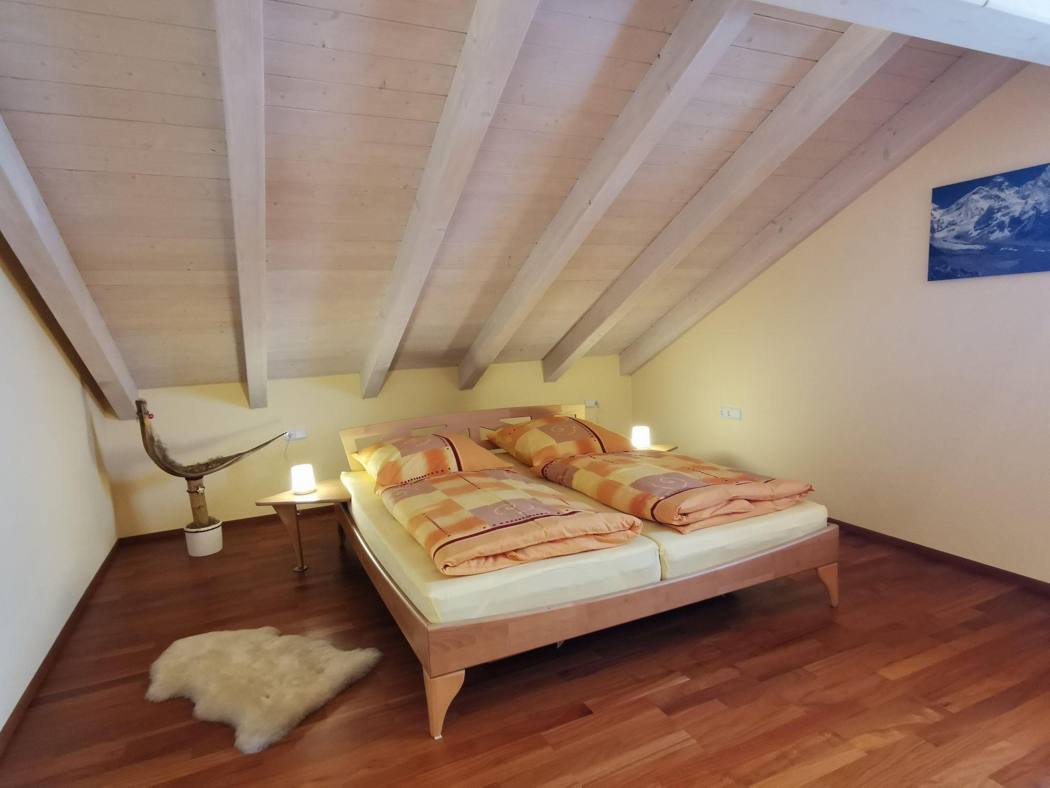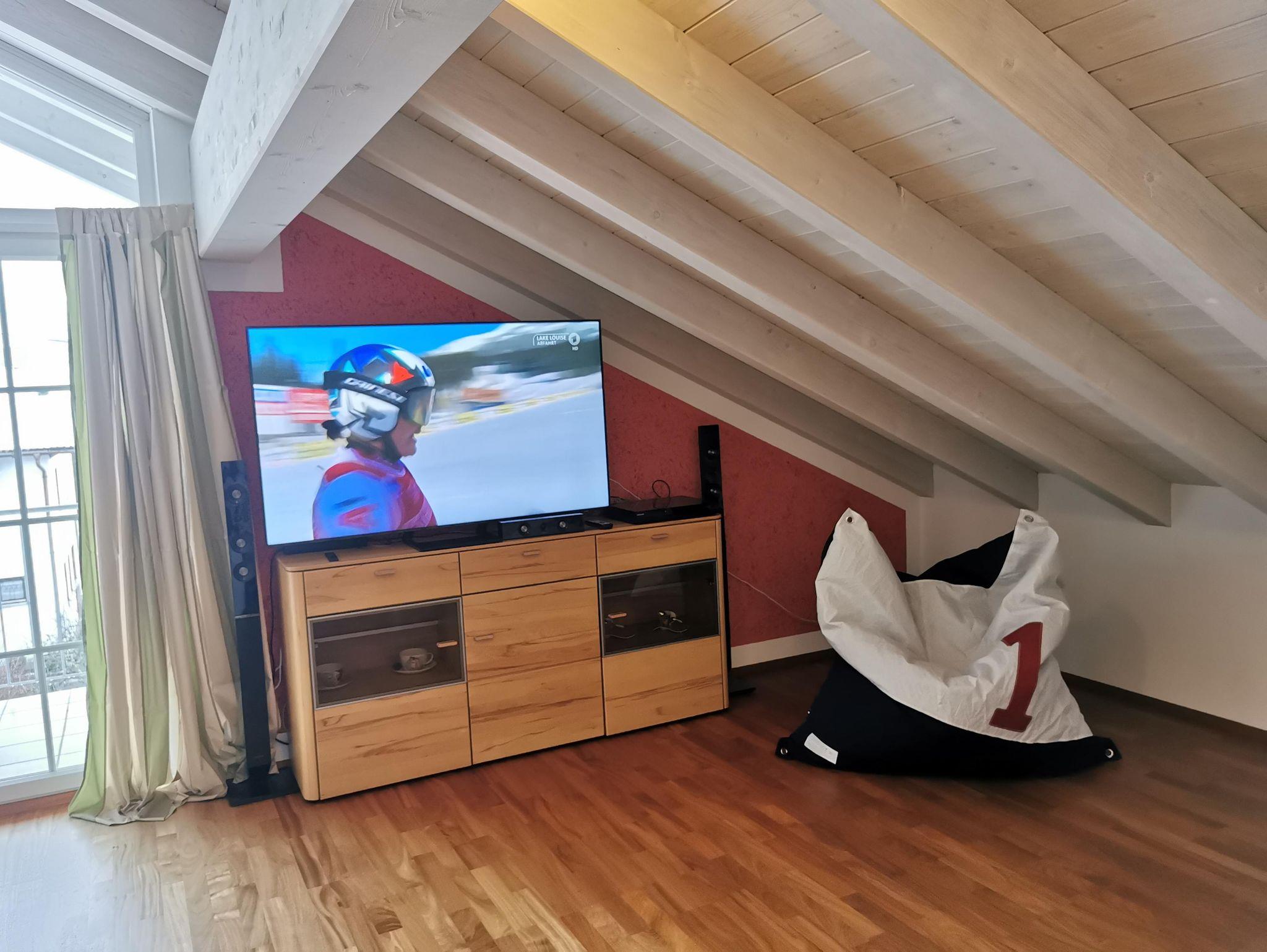 Ruhige Ferienwohnung mit gemütlichem Wohnzimmer. Wohnzimmer mit 65 Zoll LED-Fernseher. Komplett ausgestattete Küche mit Spülmaschine. Ein Schlafzimmer das mit Doppelbett/ komfort-Matratzen und Allergiker-Betten ausgestattet ist. Geölter Parkettboden mit Fußbodenheizung. Bad mit Eckbadewanne und separater Regenwalddusche, WC. Südbalkon mit Bergblick und Sitzgelegenheit. Stellplatz, kostenfreier Internetanschluss 100MBit/s.