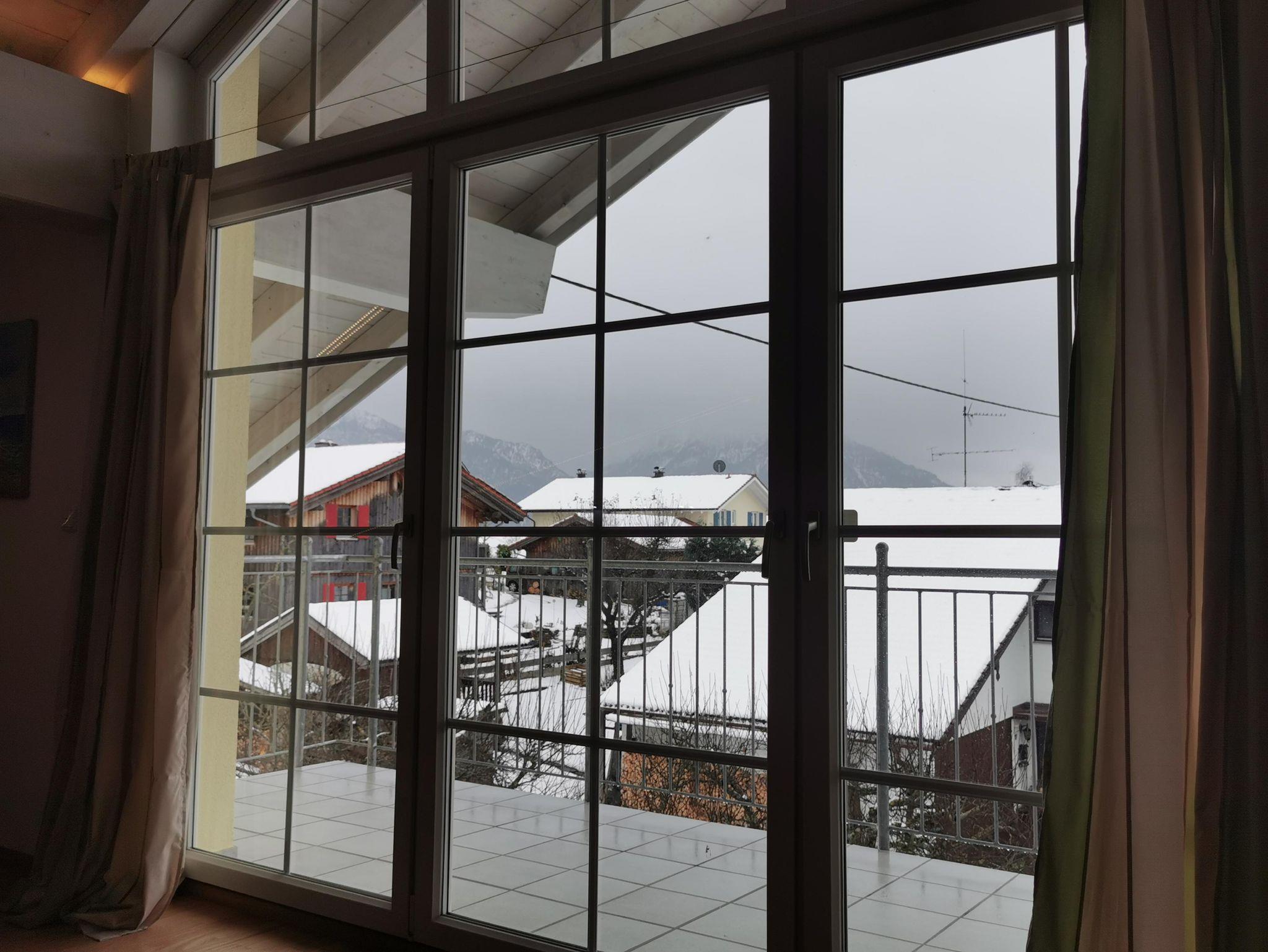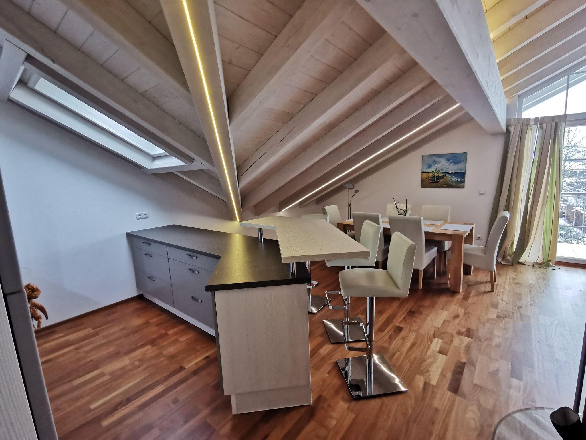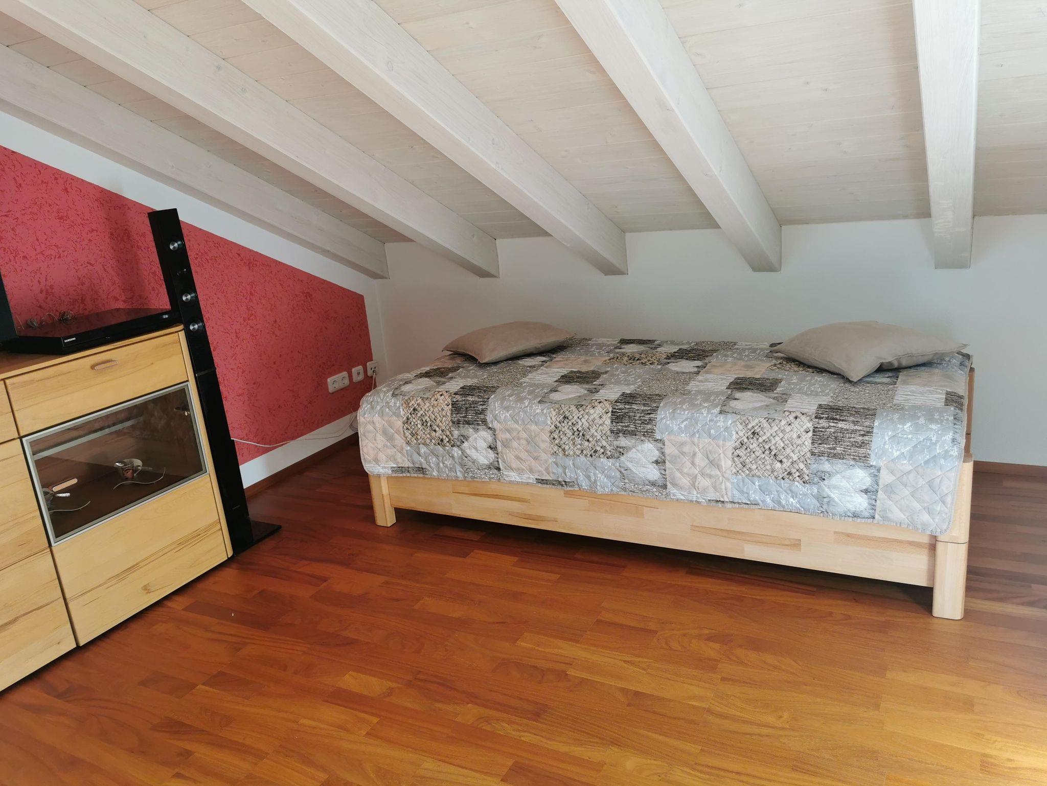 Ruhige Ferienwohnung mit gemütlichem Wohnzimmer. Wohnzimmer mit 65 Zoll LED-Fernseher. Komplett ausgestattete Küche mit Spülmaschine. Ein Schlafzimmer das mit Doppelbett/ komfort-Matratzen und Allergiker-Betten ausgestattet ist. Geölter Parkettboden mit Fußbodenheizung. Bad mit Eckbadewanne und separater Regenwalddusche, WC. Südbalkon mit Bergblick und Sitzgelegenheit. Stellplatz, kostenfreier Internetanschluss 100MBit/s.