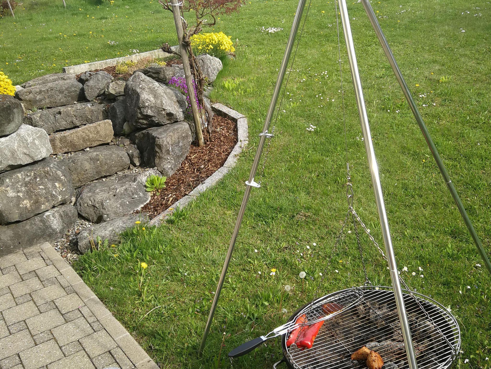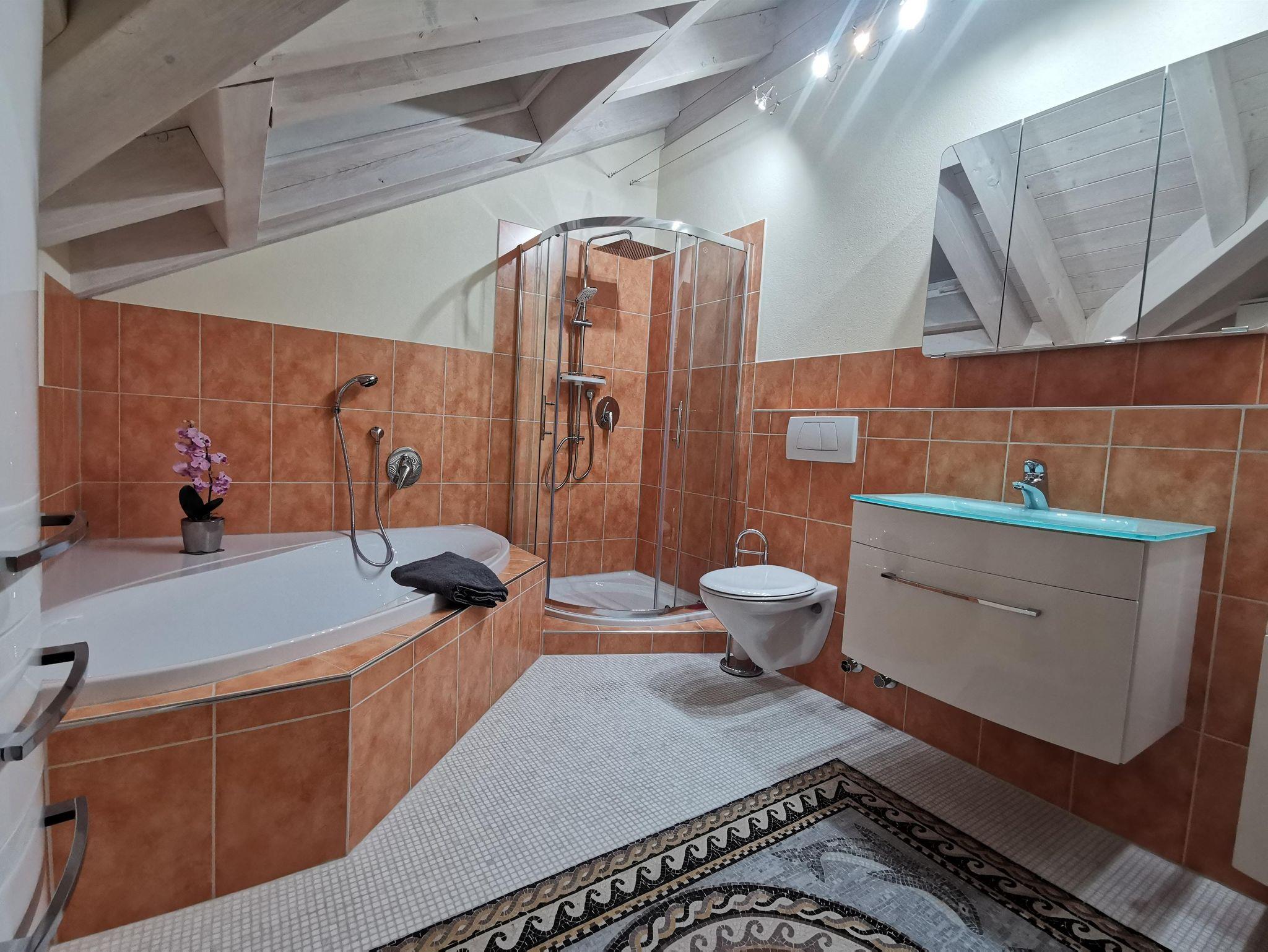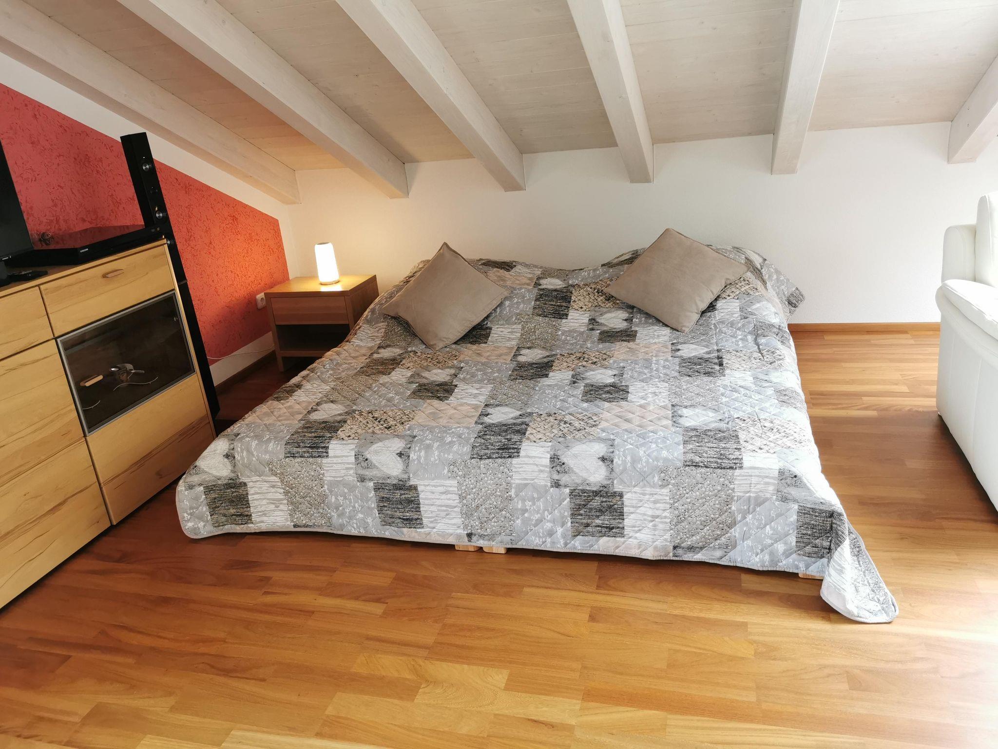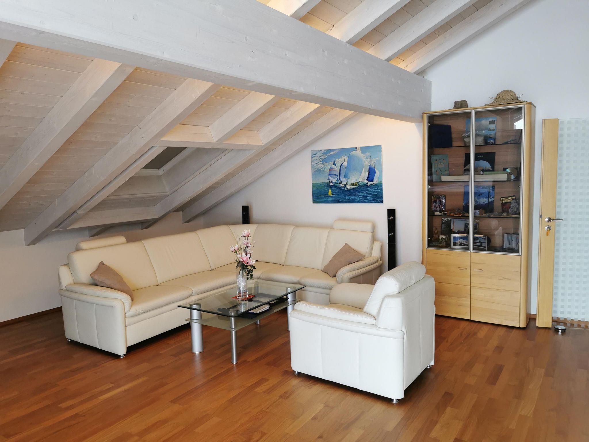 Ruhige Ferienwohnung mit gemütlichem Wohnzimmer. Wohnzimmer mit 65 Zoll LED-Fernseher. Komplett ausgestattete Küche mit Spülmaschine. Ein Schlafzimmer das mit Doppelbett/ komfort-Matratzen und Allergiker-Betten ausgestattet ist. Geölter Parkettboden mit Fußbodenheizung. Bad mit Eckbadewanne und separater Regenwalddusche, WC. Südbalkon mit Bergblick und Sitzgelegenheit. Stellplatz, kostenfreier Internetanschluss 100MBit/s.