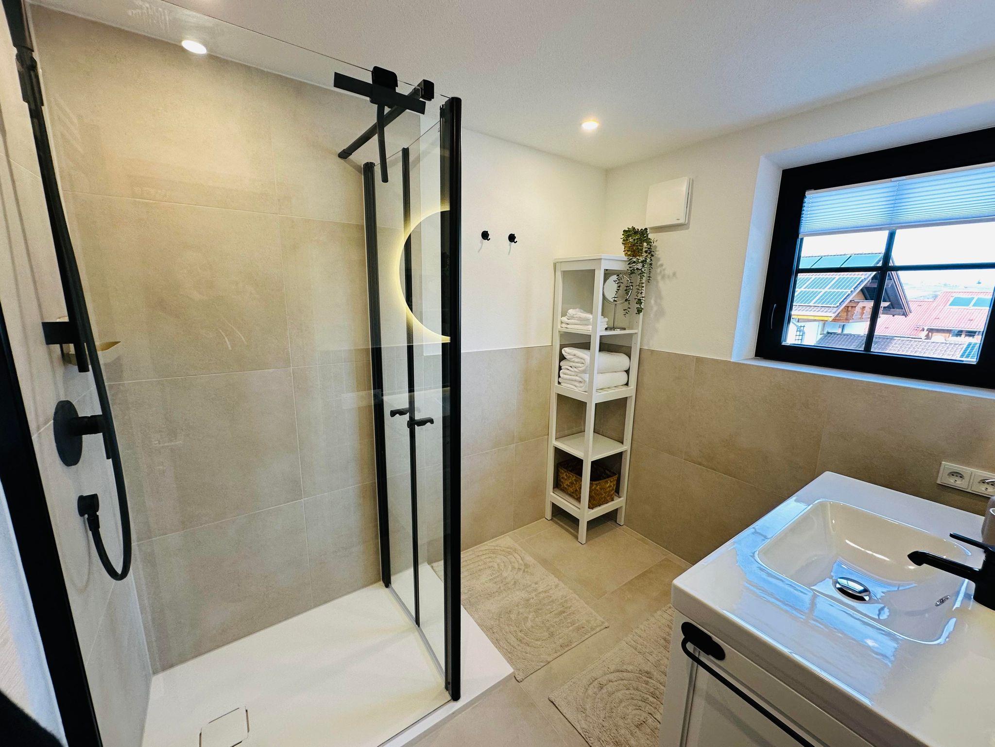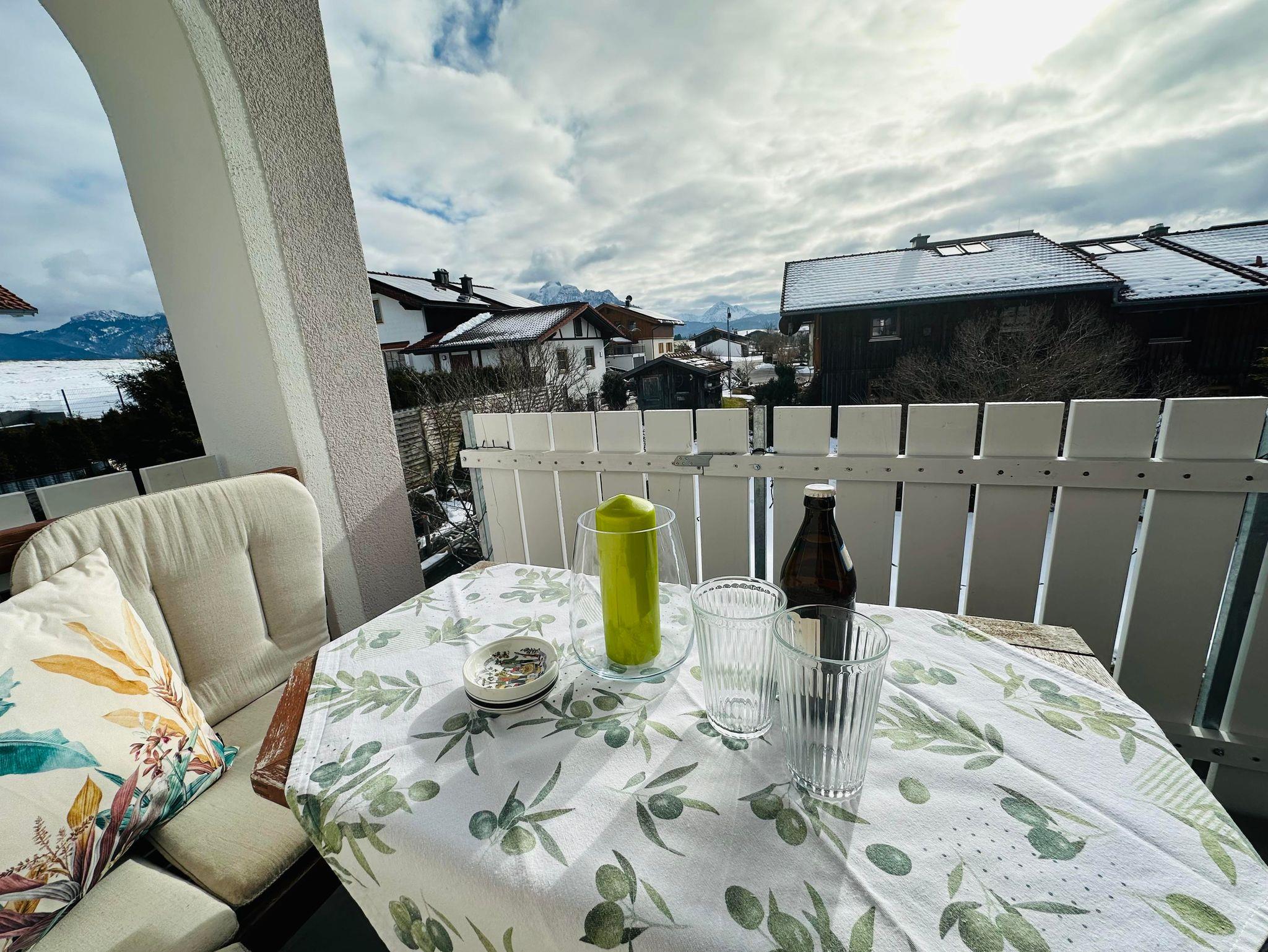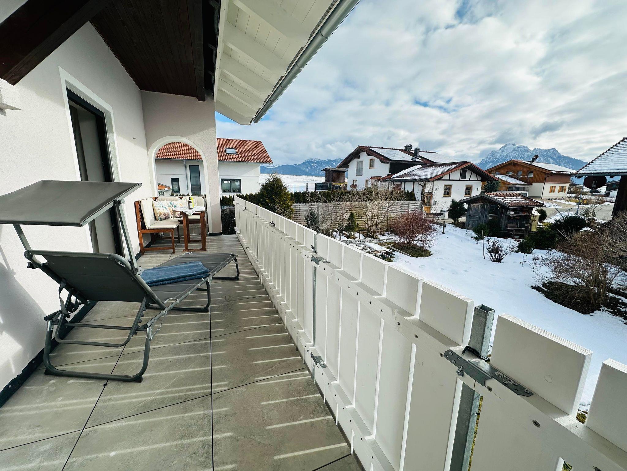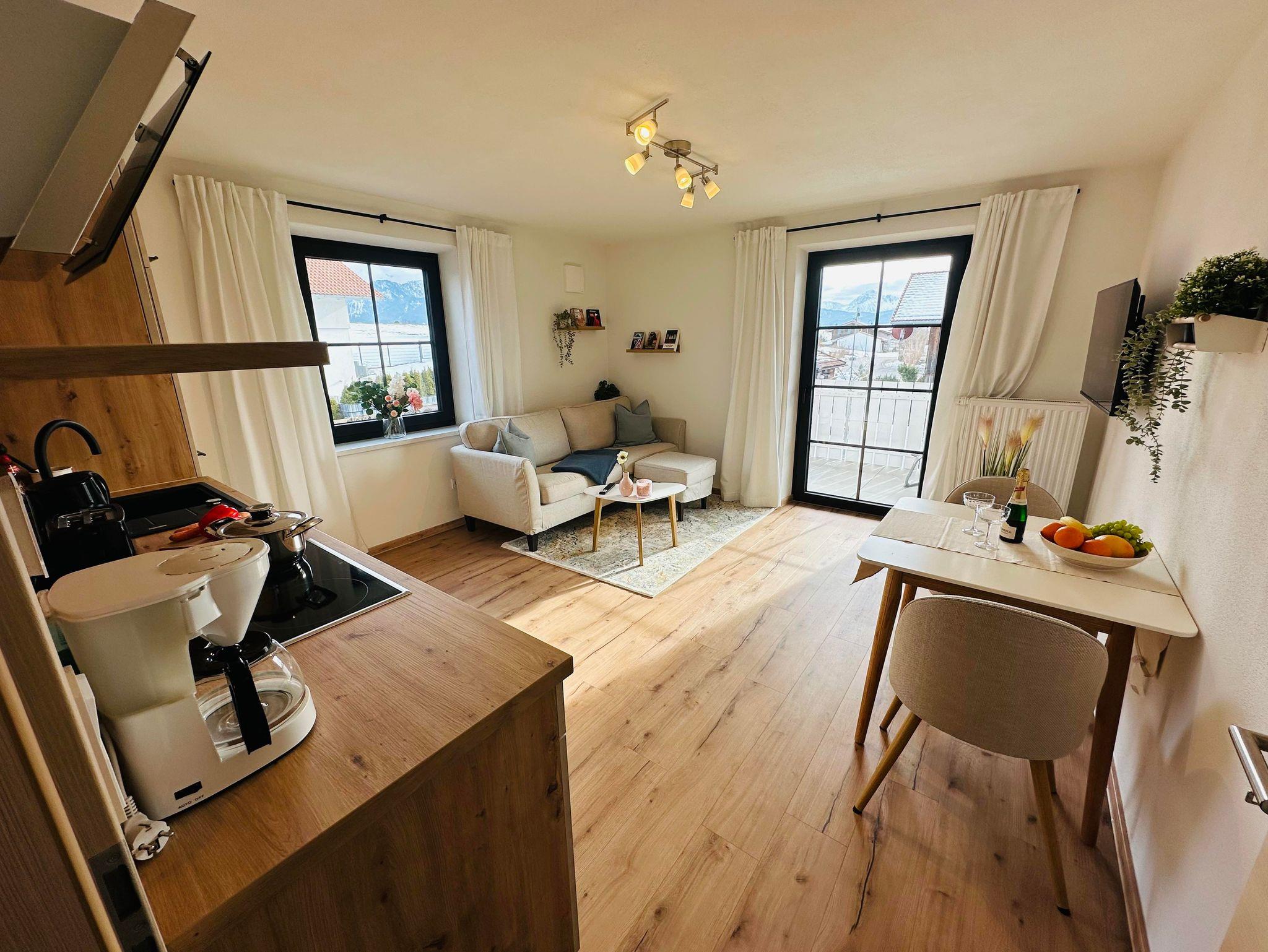 Die neue, moderne Ferienwohnung Alpen Auszeit im 1. Obergeschoss überzeugt durch stilvolle Ausstattung und einen traumhaften Blick auf die Alpen. Der sonnige Südbalkon mit Sitzgelegenheit lädt dazu ein, den Tag bei einem Glas Wein oder einem original bayerischen Bier ausklingen zu lassen, während die Sonne hinter den Bergen versinkt. Die Küche ist voll ausgestattetet (Spülmaschine, Backofen, Kaffeemaschine, Wasserkocher, Eierkocher und Toaster). Der offene Wohn- &Essbereich ist mit einem SmartTV inkl. SAT-Anschluss sowie einer praktischen Medienladestation für Handy, Tablet und Laptop ausgestattet. Im Schlafzimmer sorgt ein großes Doppelbett für erholsamen Schlaf. Auch hier steht Ihnen ein SmartTV mit SAT-Anschluss zur Verfügung. Kostenloses WLAN ist in der gesamten Wohnung verfügbar. Das Badezimmer verfügt über eine Dusche, das WC ist separat. Ein Stellplatz direkt am Haus sowie ein absperrbarer, überdachter Fahrradstellplatz mit Lademöglichkeit für E-Bikes runden das Angebot ab.