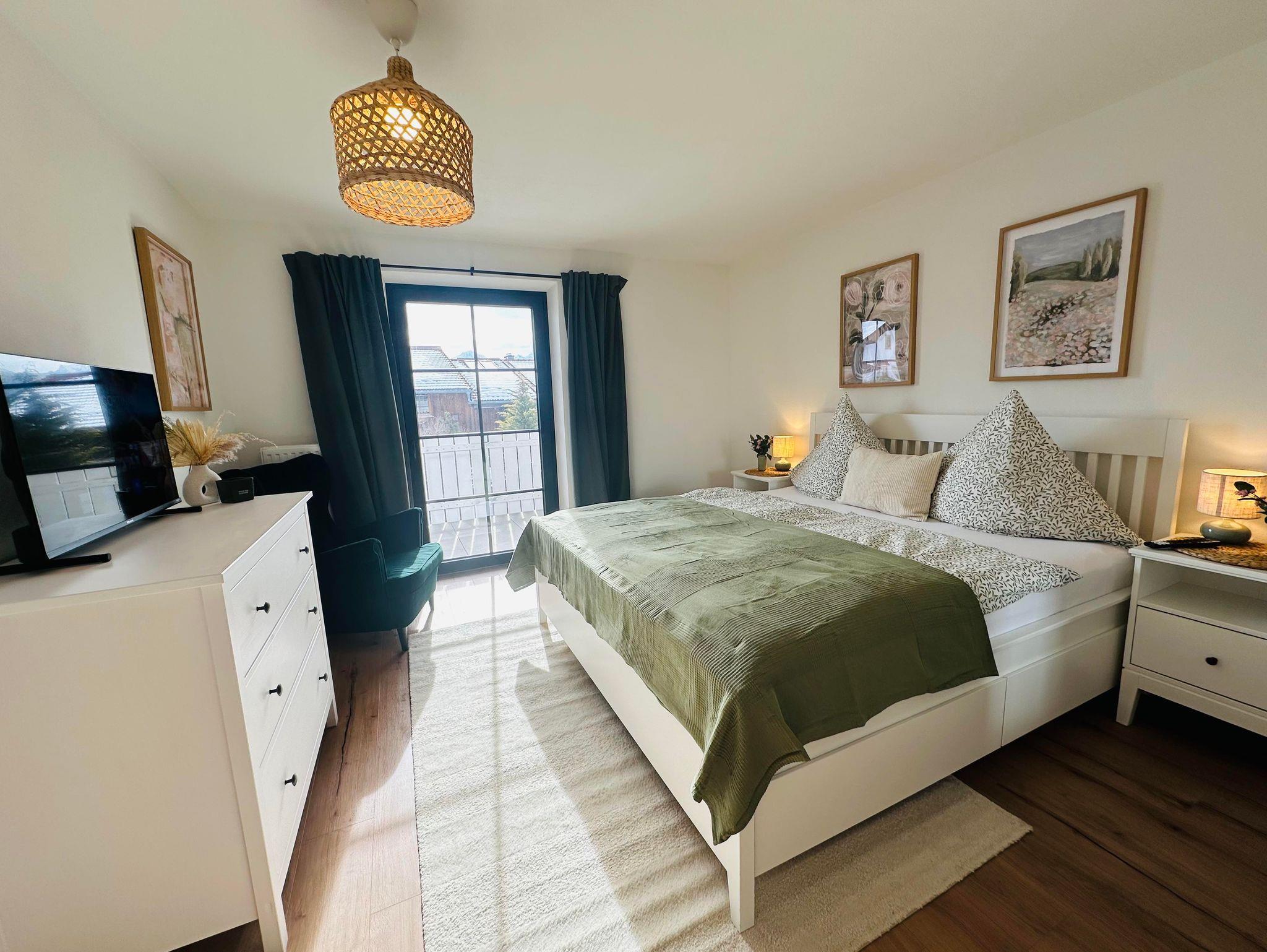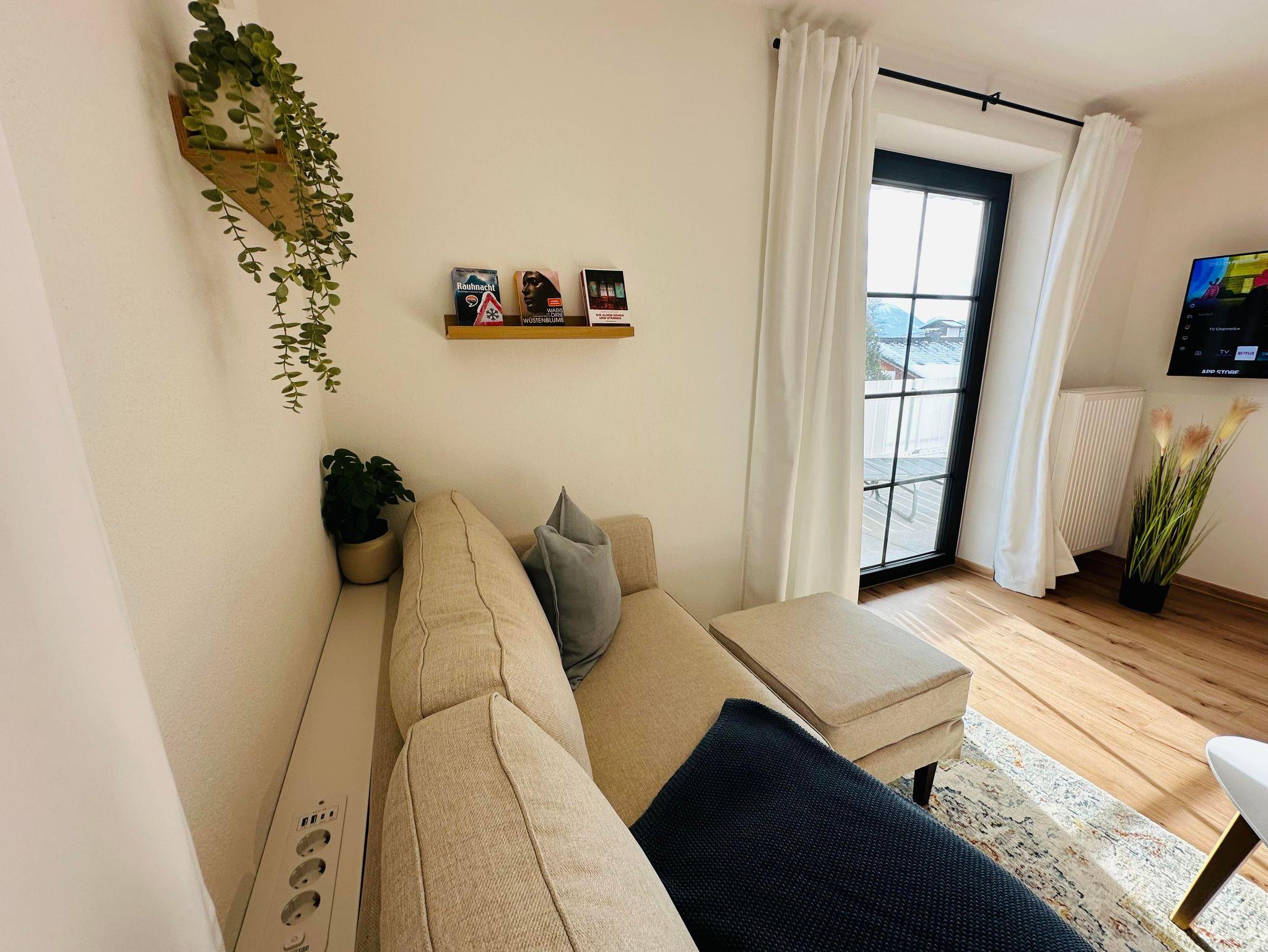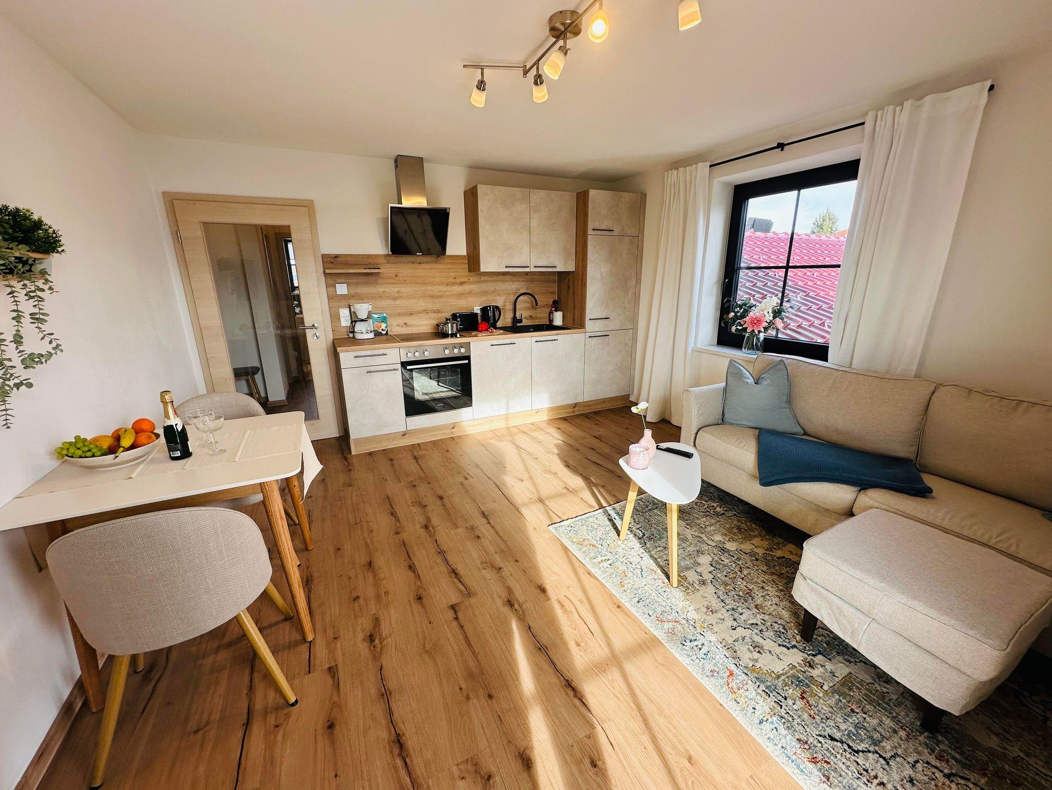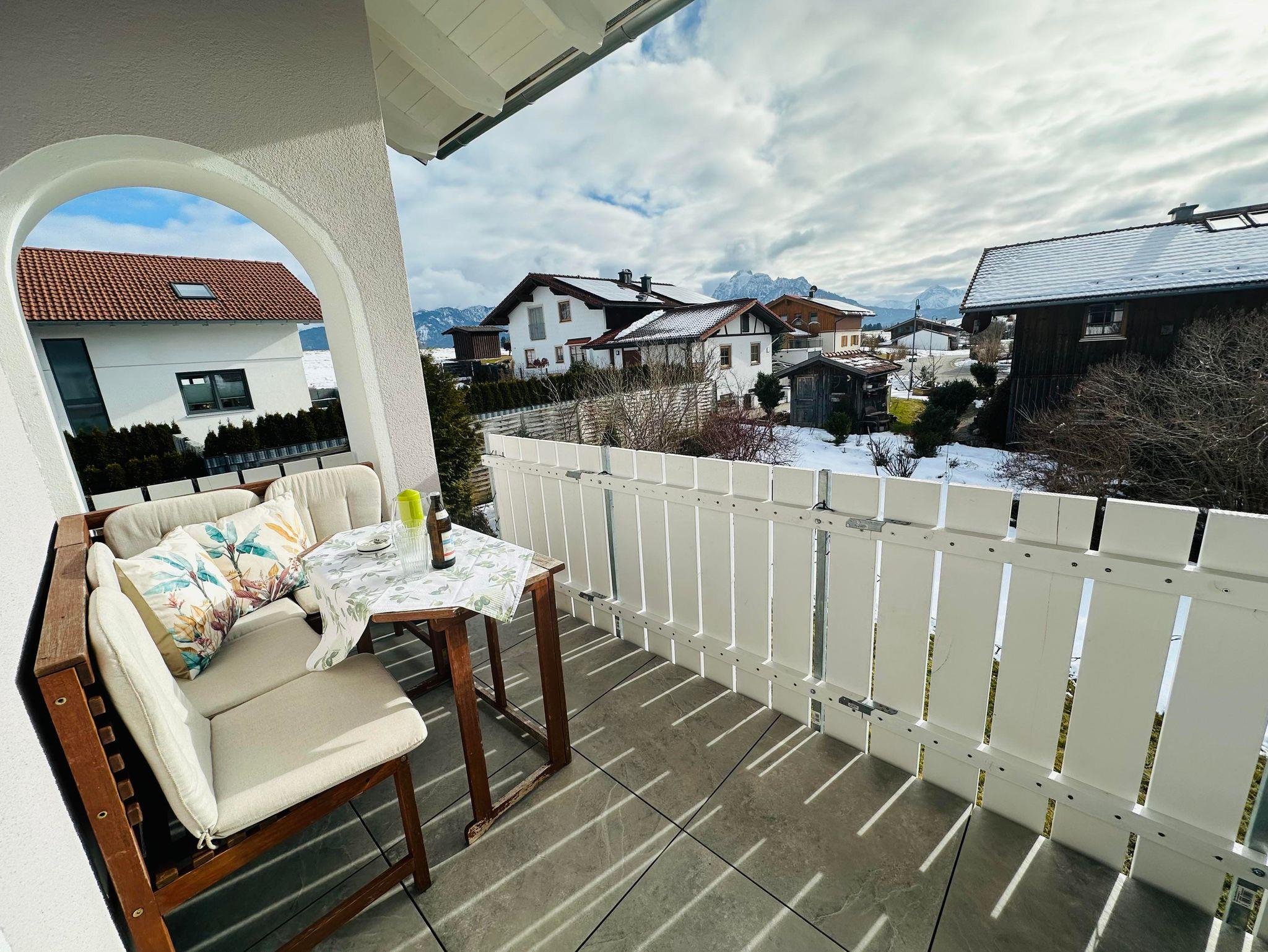 Die neue, moderne Ferienwohnung Alpen Auszeit im 1. Obergeschoss überzeugt durch stilvolle Ausstattung und einen traumhaften Blick auf die Alpen. Der sonnige Südbalkon mit Sitzgelegenheit lädt dazu ein, den Tag bei einem Glas Wein oder einem original bayerischen Bier ausklingen zu lassen, während die Sonne hinter den Bergen versinkt. Die Küche ist voll ausgestattetet (Spülmaschine, Backofen, Kaffeemaschine, Wasserkocher, Eierkocher und Toaster). Der offene Wohn- &Essbereich ist mit einem SmartTV inkl. SAT-Anschluss sowie einer praktischen Medienladestation für Handy, Tablet und Laptop ausgestattet. Im Schlafzimmer sorgt ein großes Doppelbett für erholsamen Schlaf. Auch hier steht Ihnen ein SmartTV mit SAT-Anschluss zur Verfügung. Kostenloses WLAN ist in der gesamten Wohnung verfügbar. Das Badezimmer verfügt über eine Dusche, das WC ist separat. Ein Stellplatz direkt am Haus sowie ein absperrbarer, überdachter Fahrradstellplatz mit Lademöglichkeit für E-Bikes runden das Angebot ab.