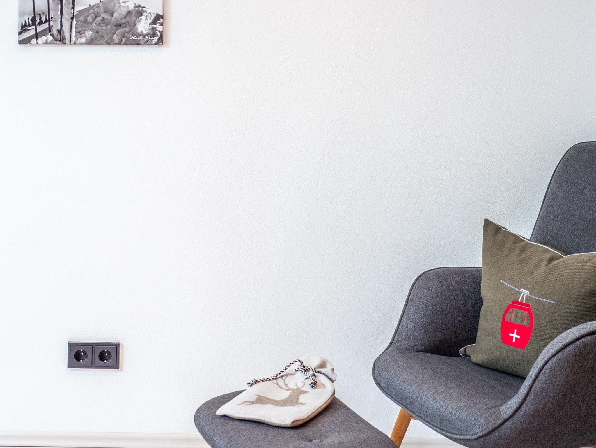 Die neu ausgebaute Ferienatelierwohnung im Dachgeschoss überzeugt mit seinem freien Blick auf die Alpen.