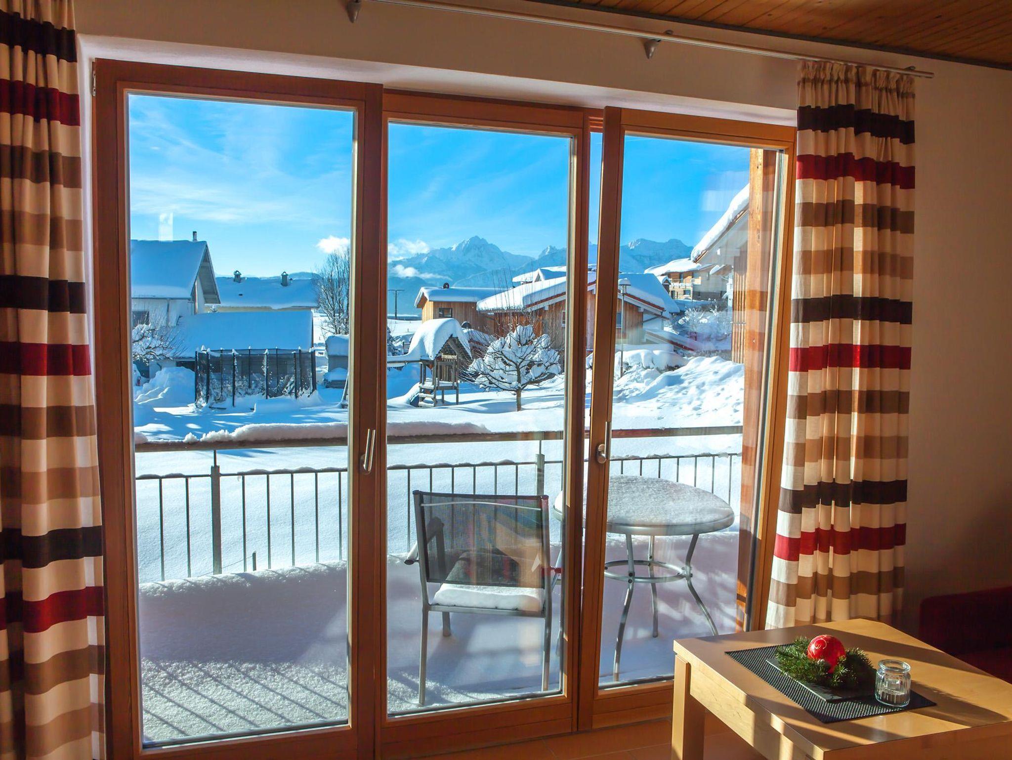 Ferienwohnung mit Balkon, Bergblick, voll ausgestattete Küche mit Spülmaschine, Backofen und Mikrowelle, Wohnbereich mit TV, Telefon und W-Lan, Schlafzimmer mit Doppelbett und Safe, Bad mit Doppelwaschbecken, Dusche, Fön und Kosmetikspiegel.