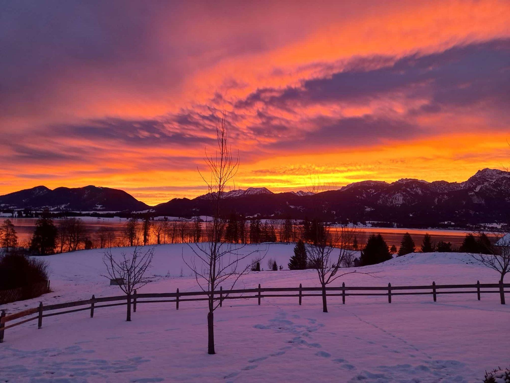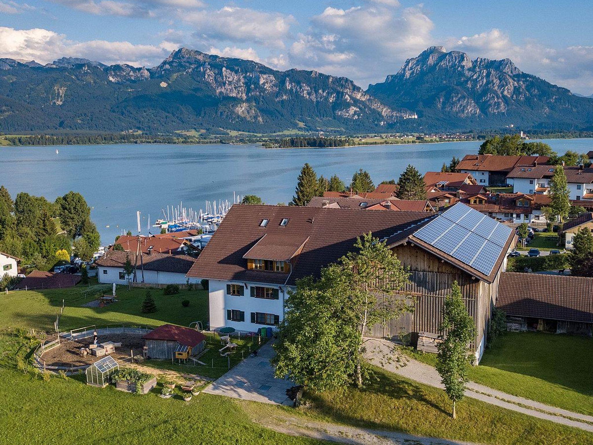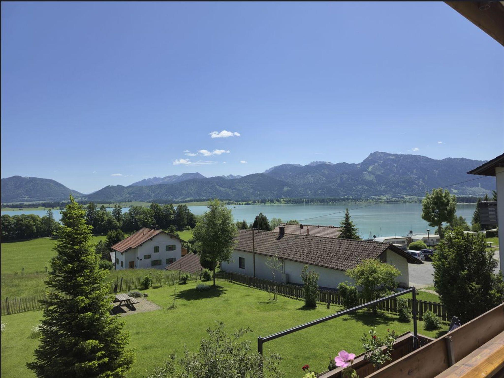 Sie befindet sich in der ersten Etage und bietet mit ihrem Ostbalkon einen traumhaften Blick auf den Forggensee und die Berge.
