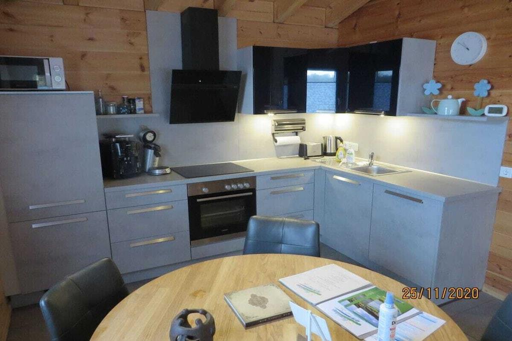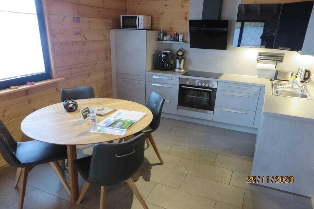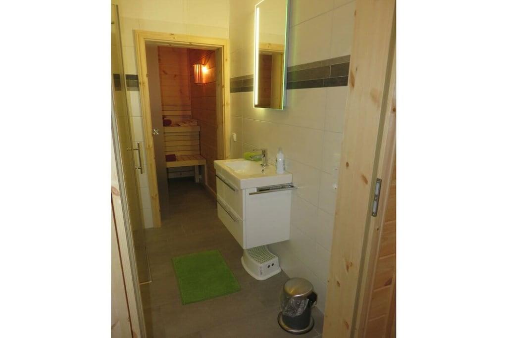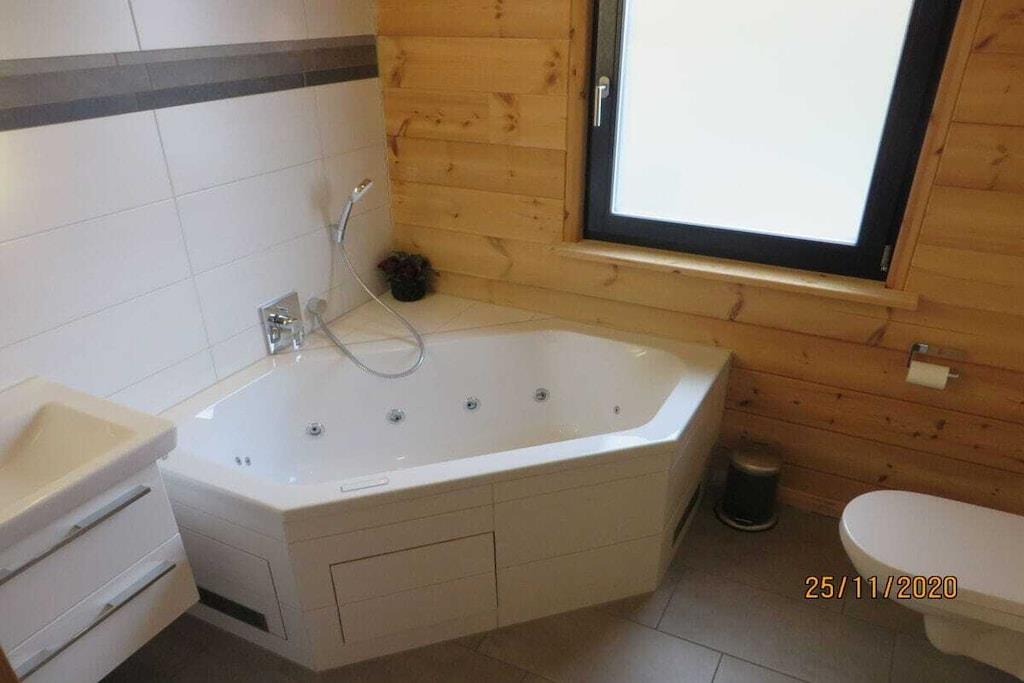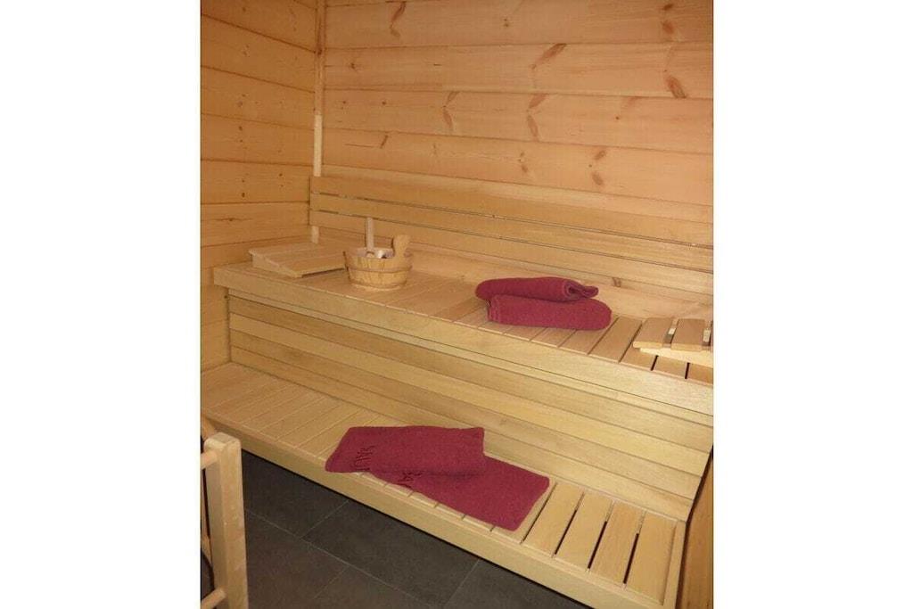 Velkommen til bjælkehytten "Merlin", beliggende i en førsteklasses, rolig beliggenhed i udkanten af skoven, med følgende faciliteter: - 1 soveværelse med en 180x200 cm dobbeltseng, garderobe og gulvvarme - 1 soveværelse med en 160x200 cm dobbeltseng, kommode og gulvvarme - 1 badeværelse med håndvask, spabad, toilet og gulvvarme - 1 badeværelse med håndvask, bruseniche, toilet, sauna og gulvvarme - 1 stue/spisestue med moderne køkken, spisebord, sofa, fladskærms-tv, gulvvarme og pejs - 1 indhegnet afslapningsterrasse med havemøbler, liggestole og grill - 1 bryggers med vaskemaskine og tørretumbler