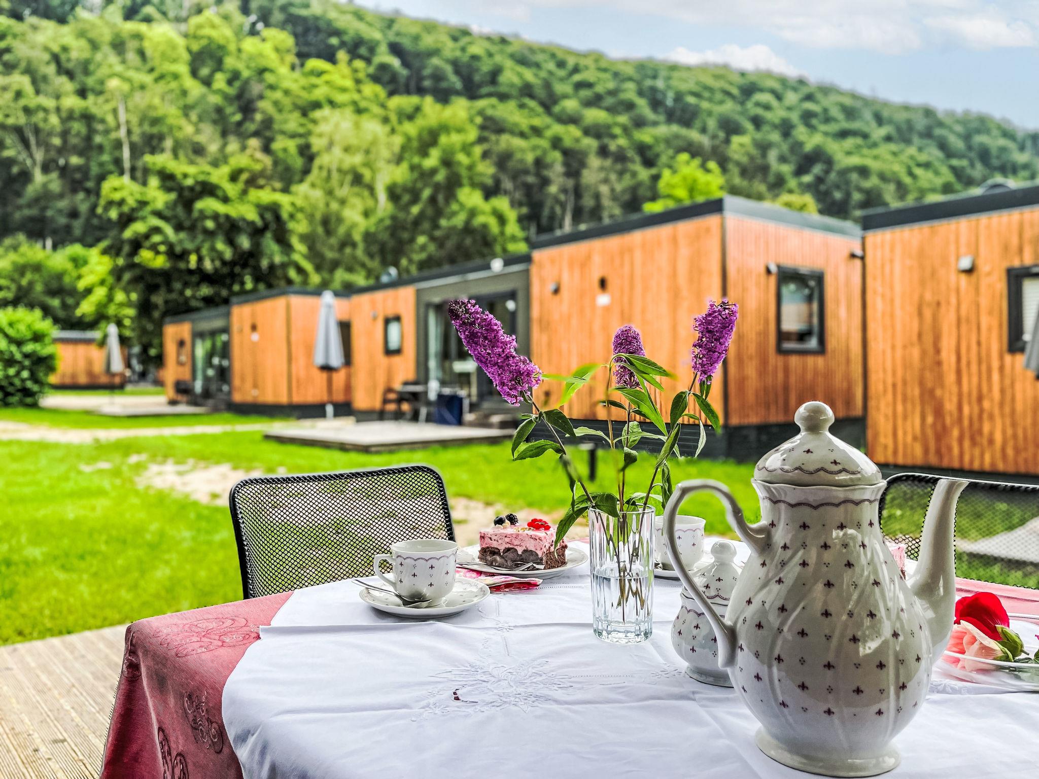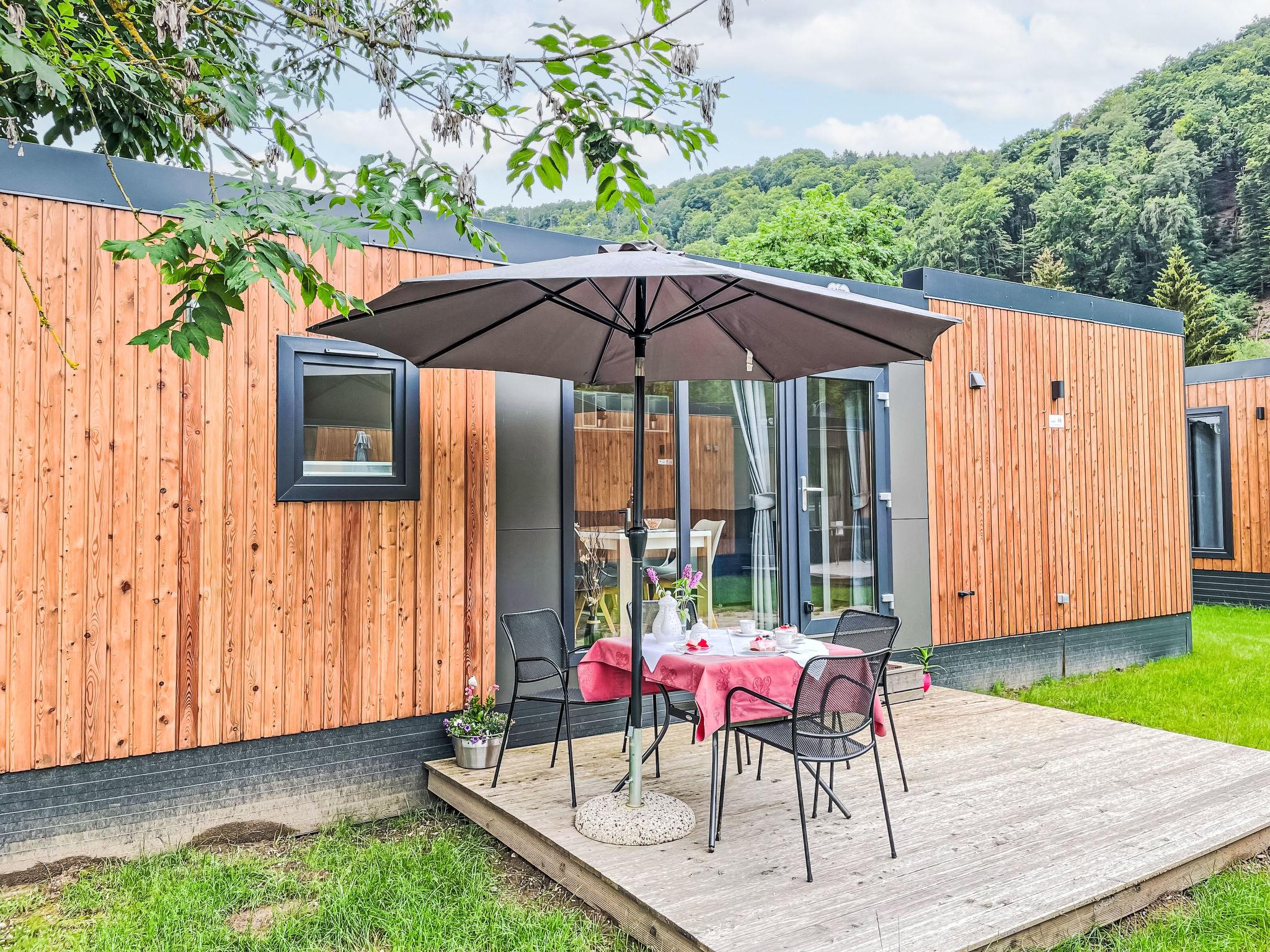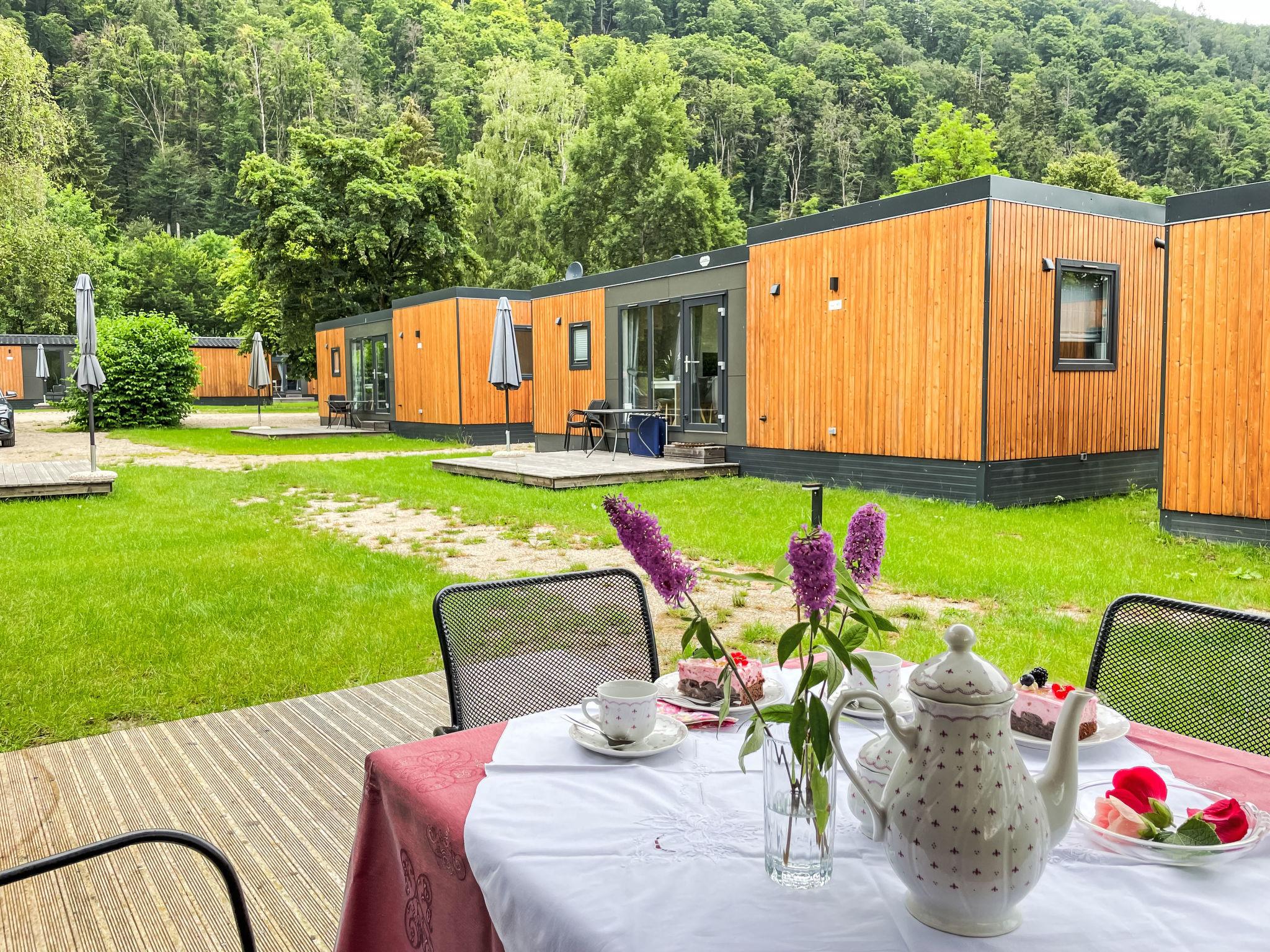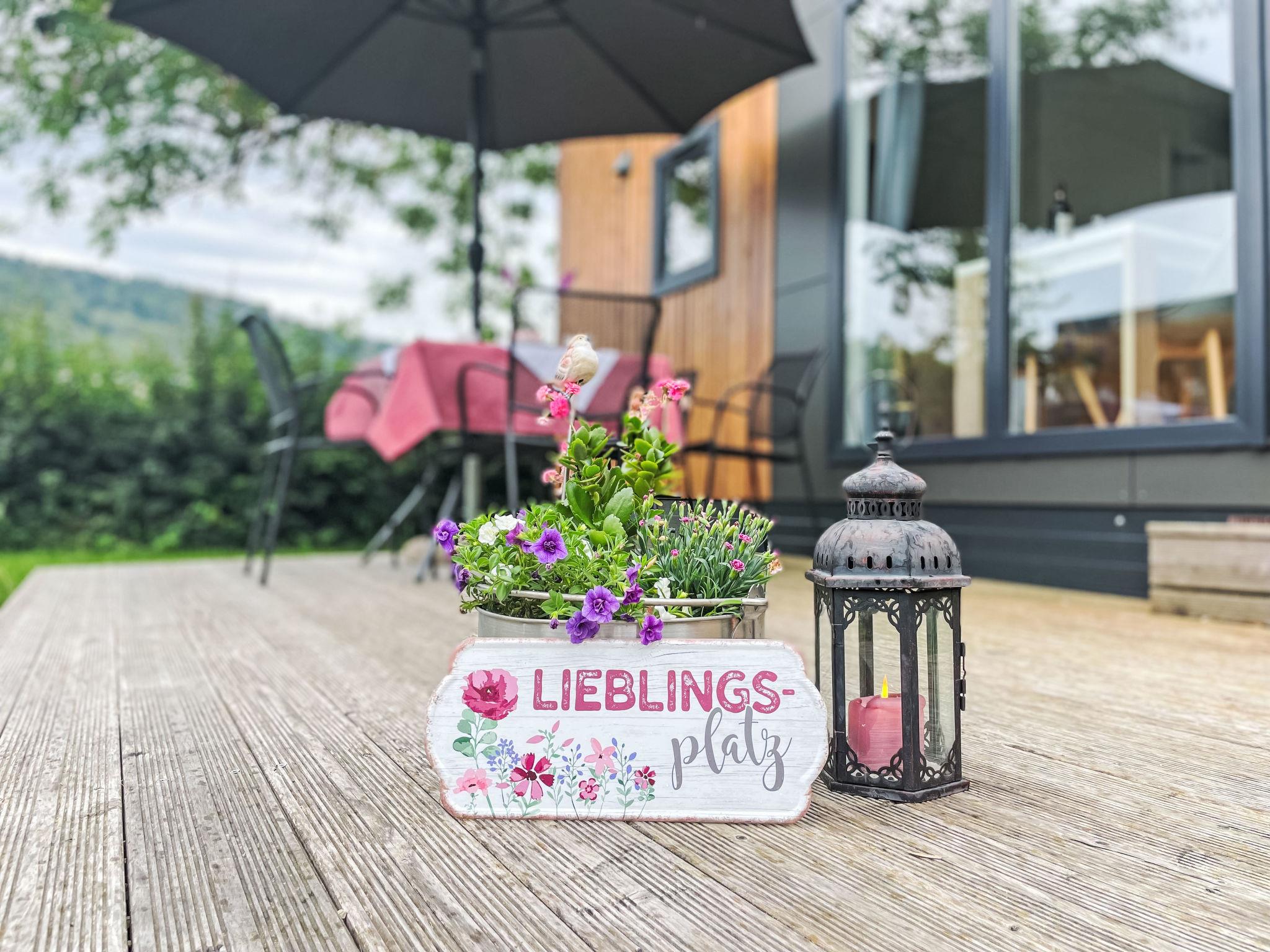 "Tiny Haus Panorama", 3-room mobile home 32 m2. Cosy furnishings: living/sleeping room with (120 cm, length 170 cm), satellite TV. Exit to the terrace. 1 room with 1 french bed (140 cm, length 190 cm). 1 room with 2 beds (70 cm, length 190 cm). Open kitchen (4 induction hot plates, kettle, freezer, electric coffee machine). Shower, sep. WC. Electric heating. Small terrace. Terrace furniture. Facilities: hair dryer. Parking at 50 m. Please note: non-smoking house.