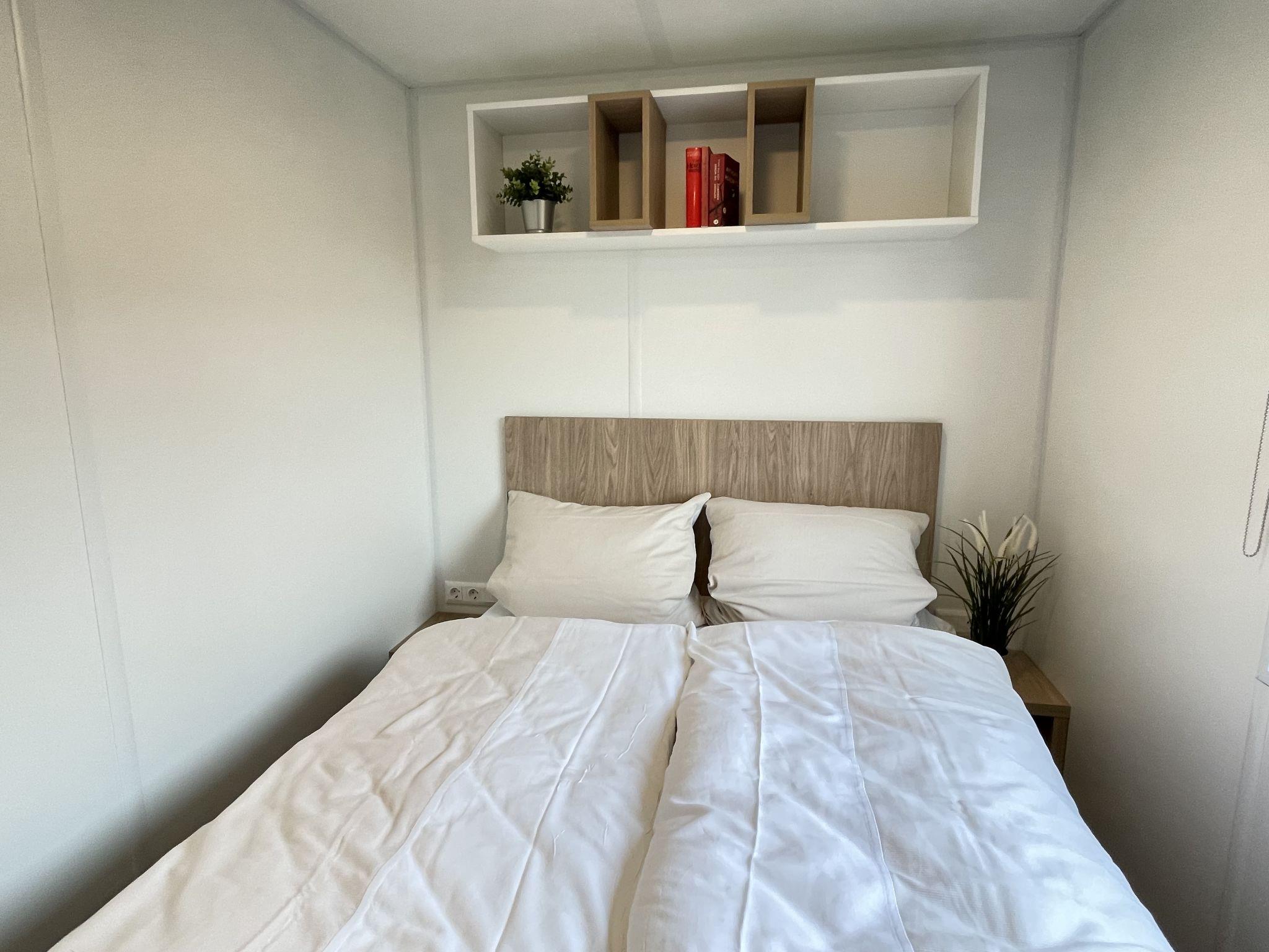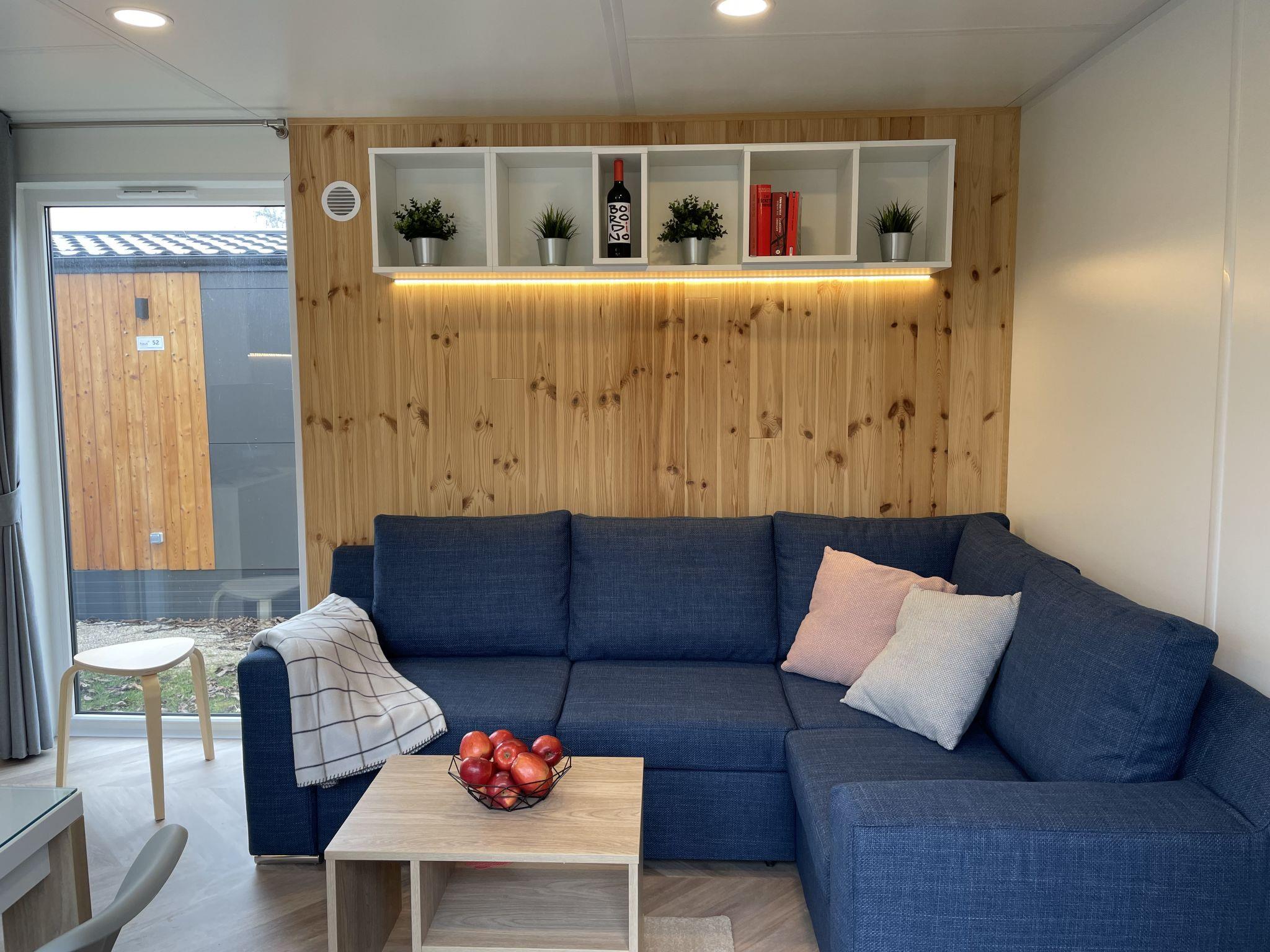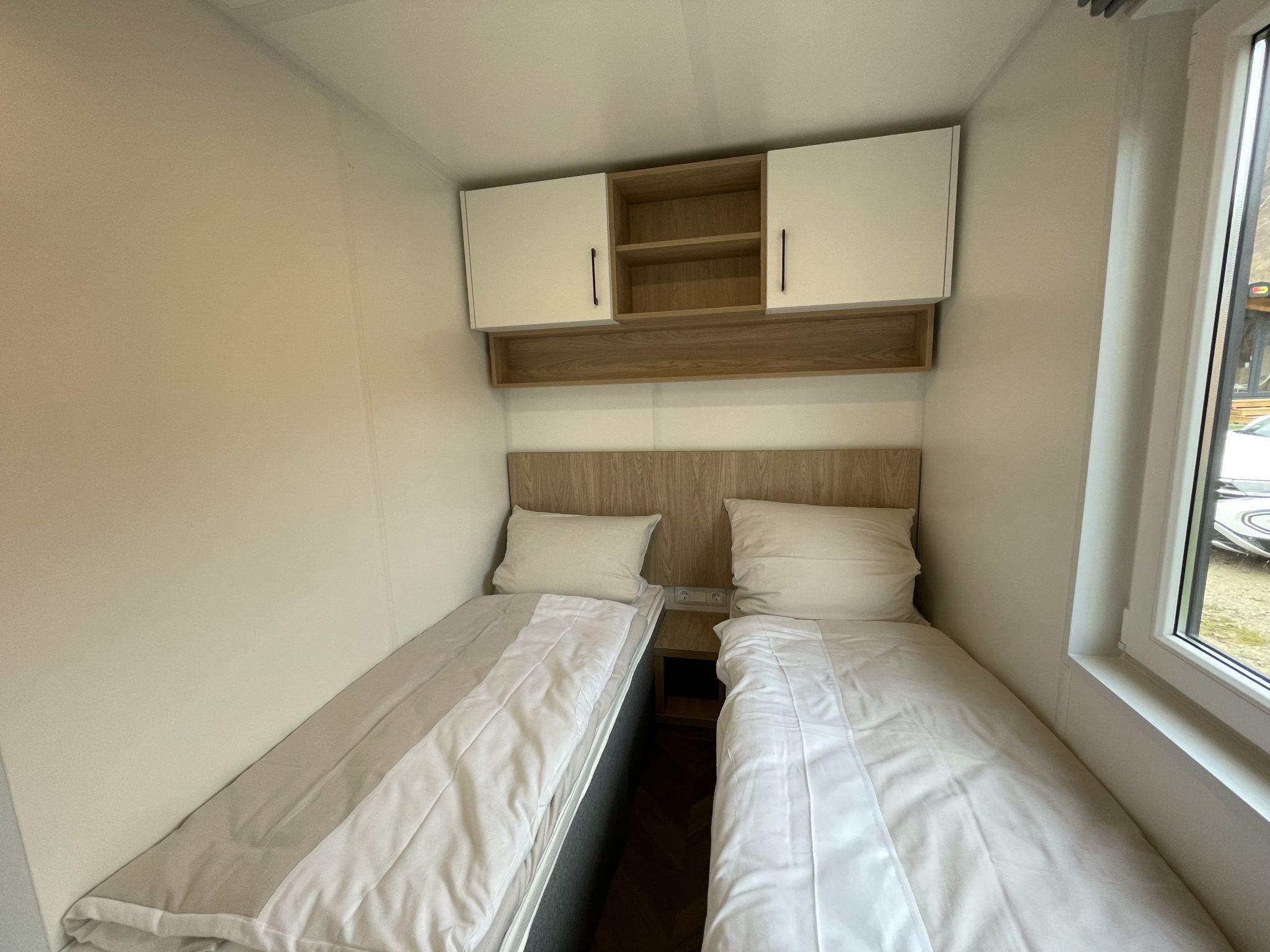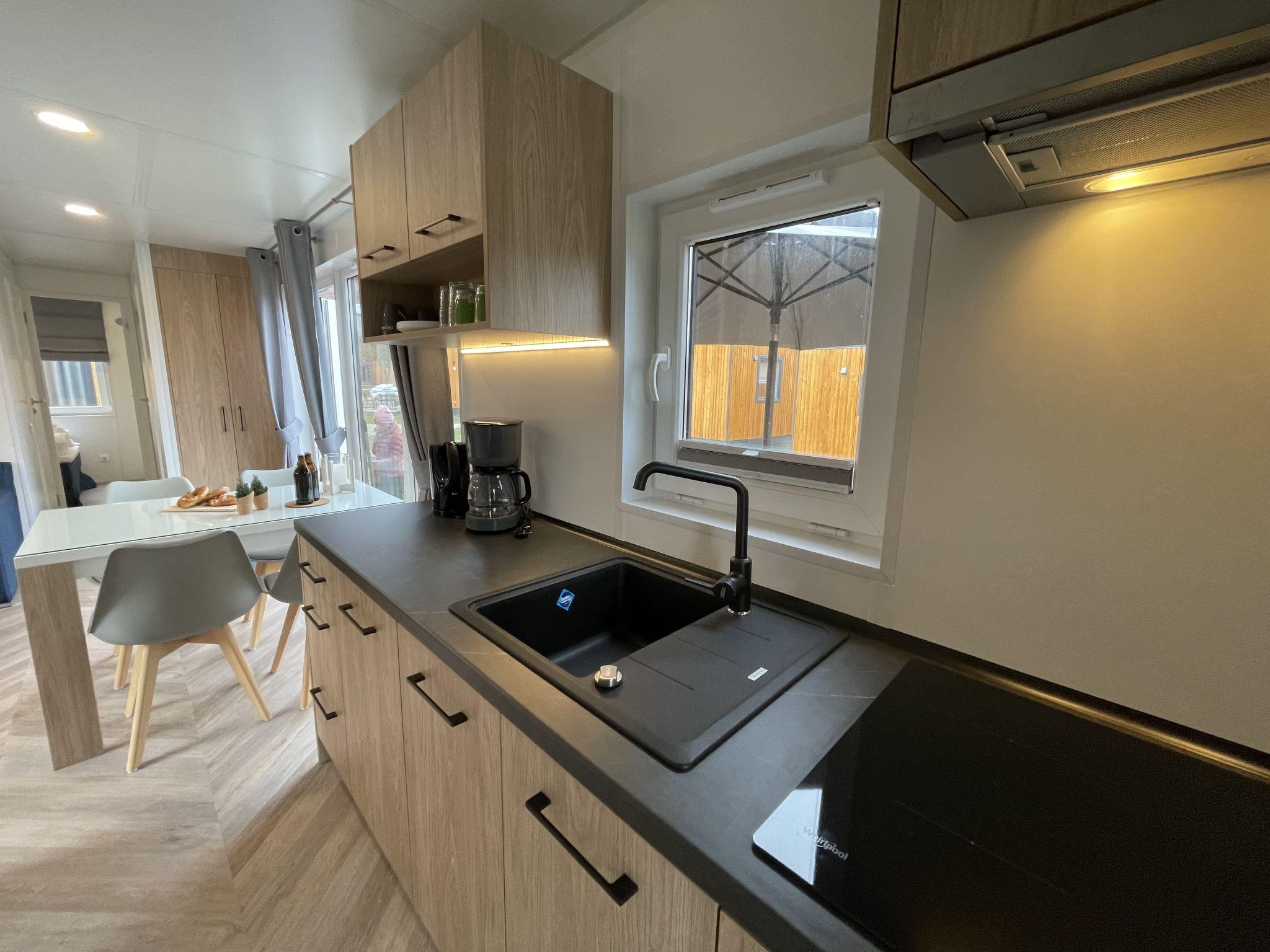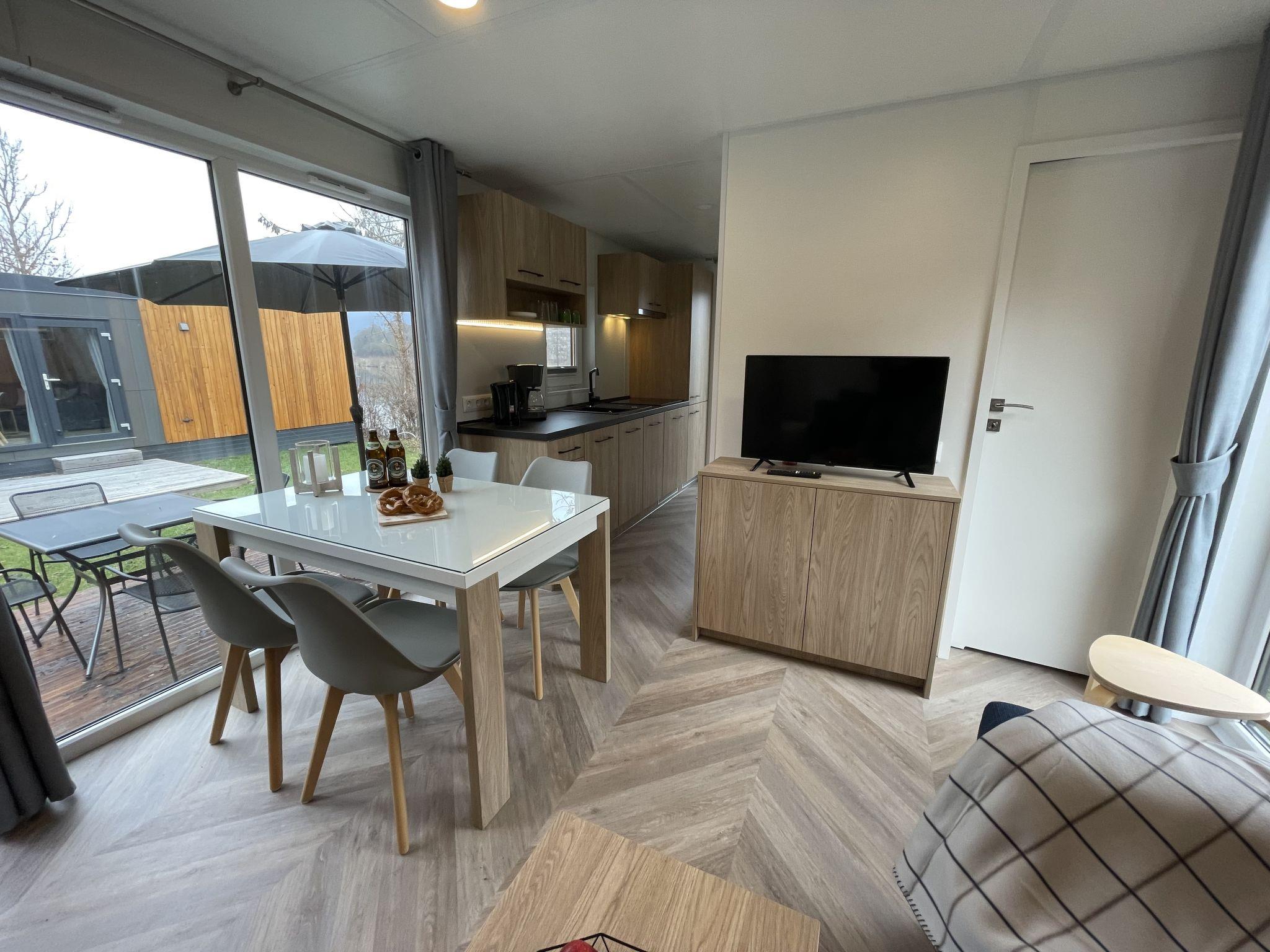 "Tiny Haus Panorama", 3-room mobile home 32 m2. Cosy furnishings: living/sleeping room with (120 cm, length 170 cm), satellite TV. Exit to the terrace. 1 room with 1 french bed (140 cm, length 190 cm). 1 room with 2 beds (70 cm, length 190 cm). Open kitchen (4 induction hot plates, kettle, freezer, electric coffee machine). Shower, sep. WC. Electric heating. Small terrace. Terrace furniture. Facilities: hair dryer. Parking at 50 m. Please note: non-smoking house.