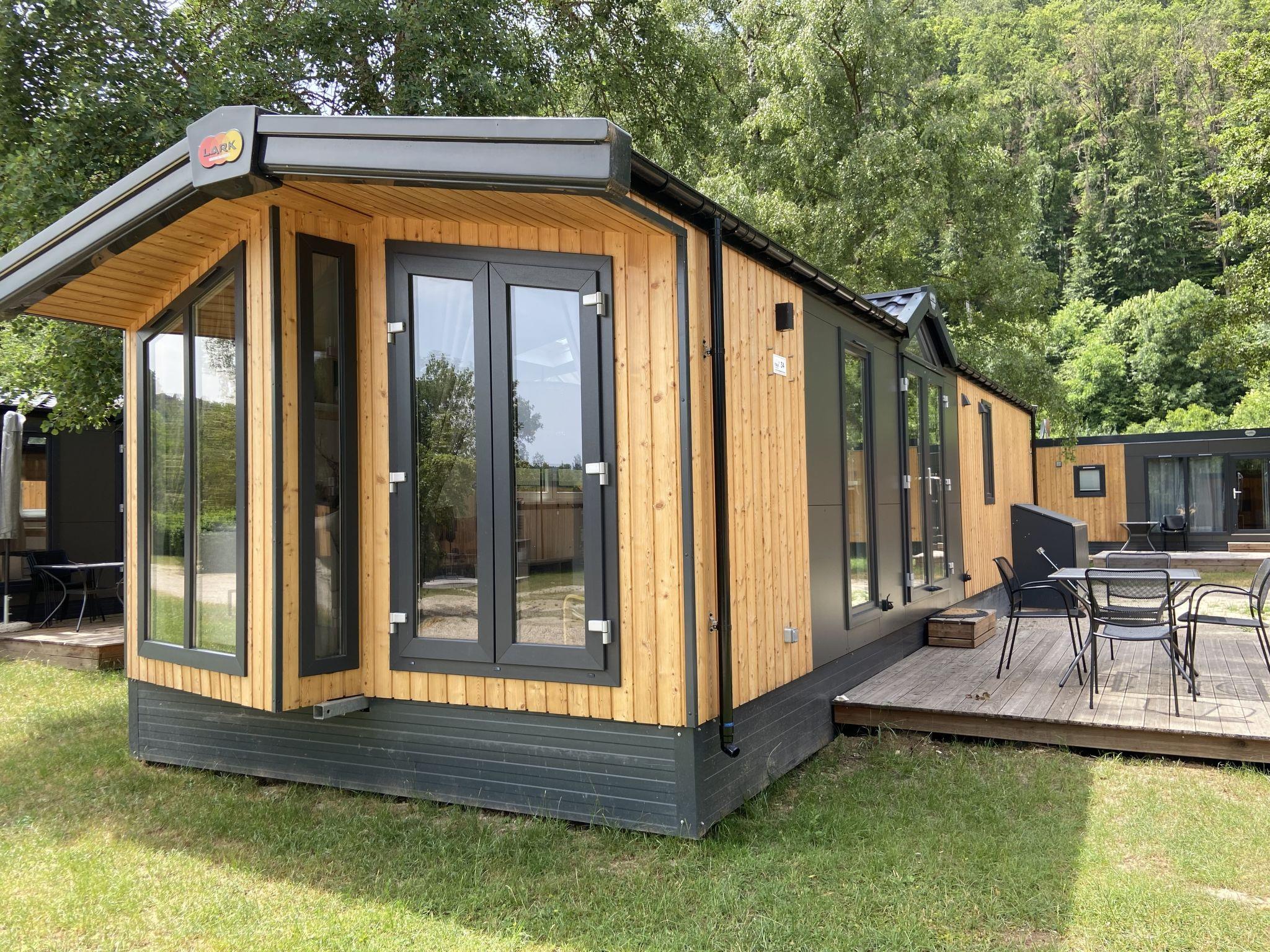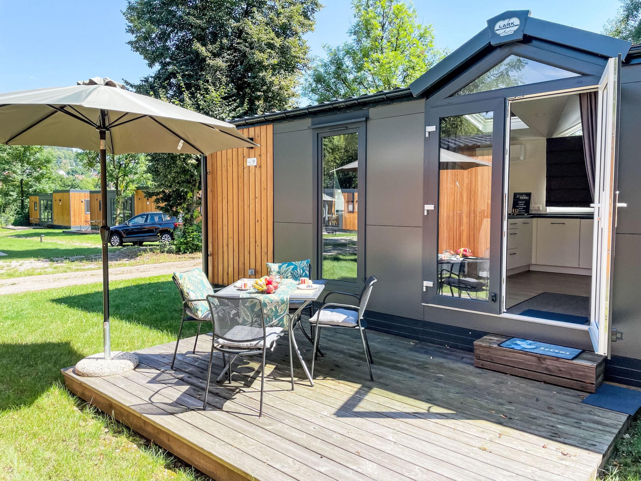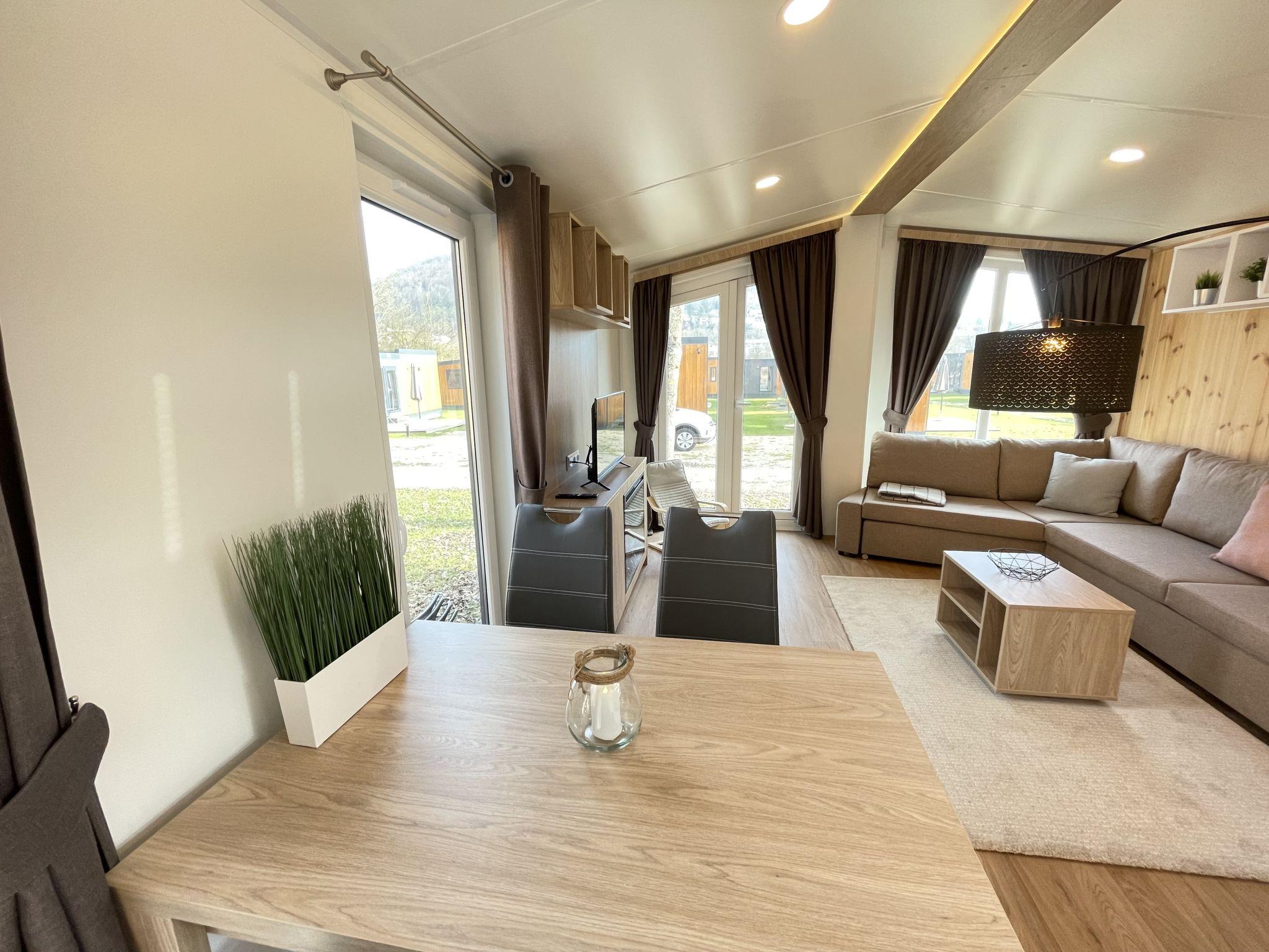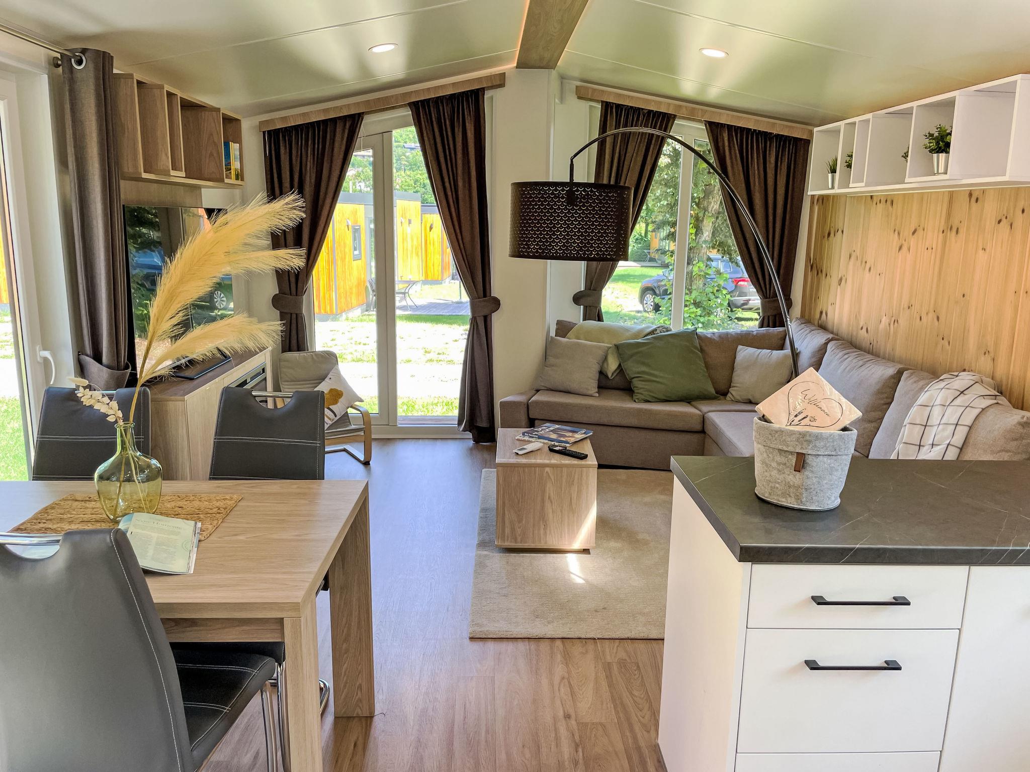 "Tiny Haus ChrisTine", 3-room mobile home 48 m2. Object suitable for 2 adults + 4 children. Comfortable furnishings: living/sleeping room with 1 double sofabed (160 cm, length 200 cm), Scandinavian wood stove (only for decoration), satellite TV and air conditioning. Exit to the terrace. 1 room with 1 french bed (160 cm, length 200 cm). 1 room with 2 beds (80 cm, length 200 cm). Open kitchen (oven, dishwasher, 4 ceramic glass hob hotplates, kettle, freezer, electric coffee machine). Shower, sep. WC. Small terrace. Terrace furniture. Facilities: washing machine. Parking at the house. Please note: non-smokers only.