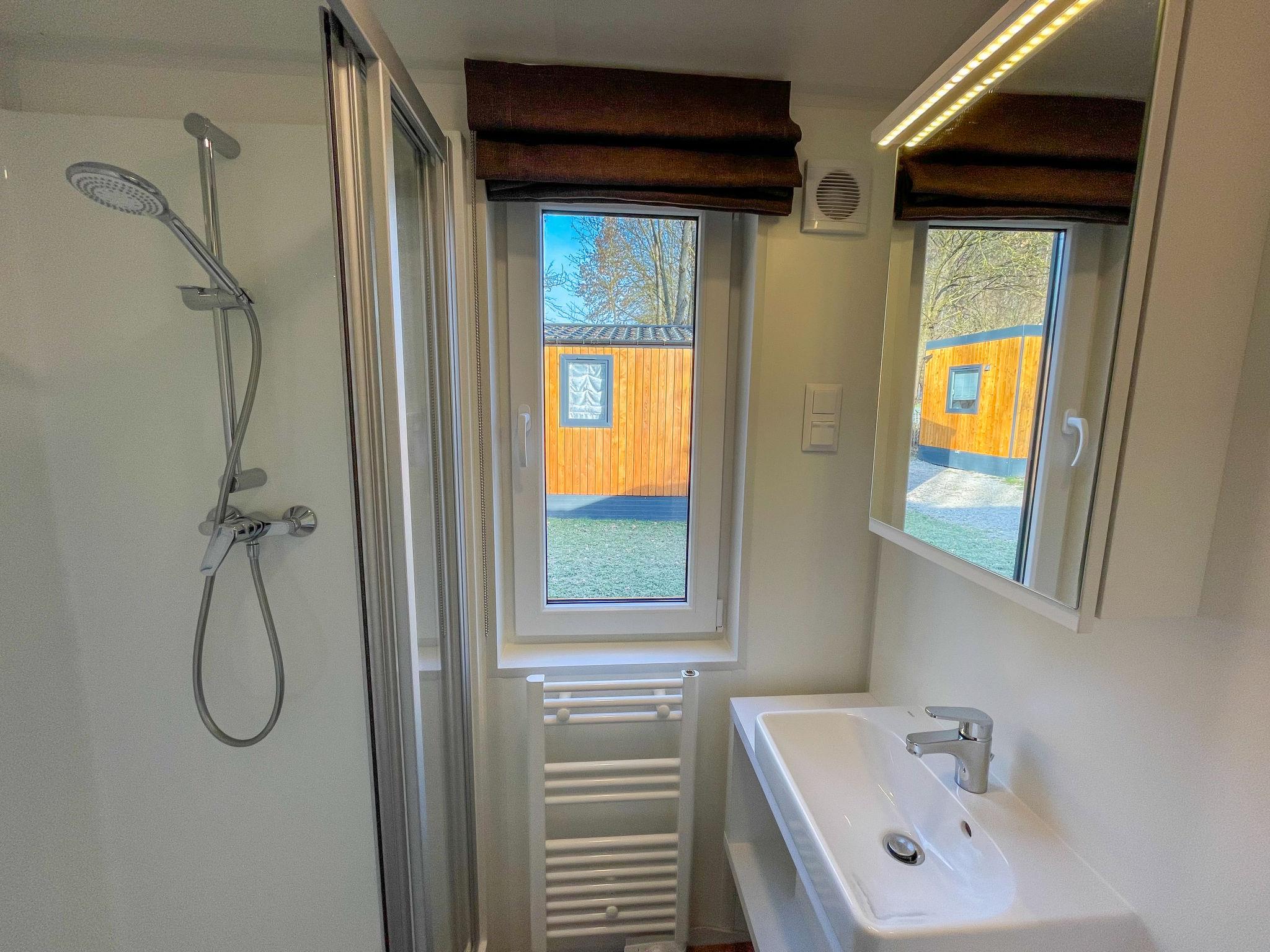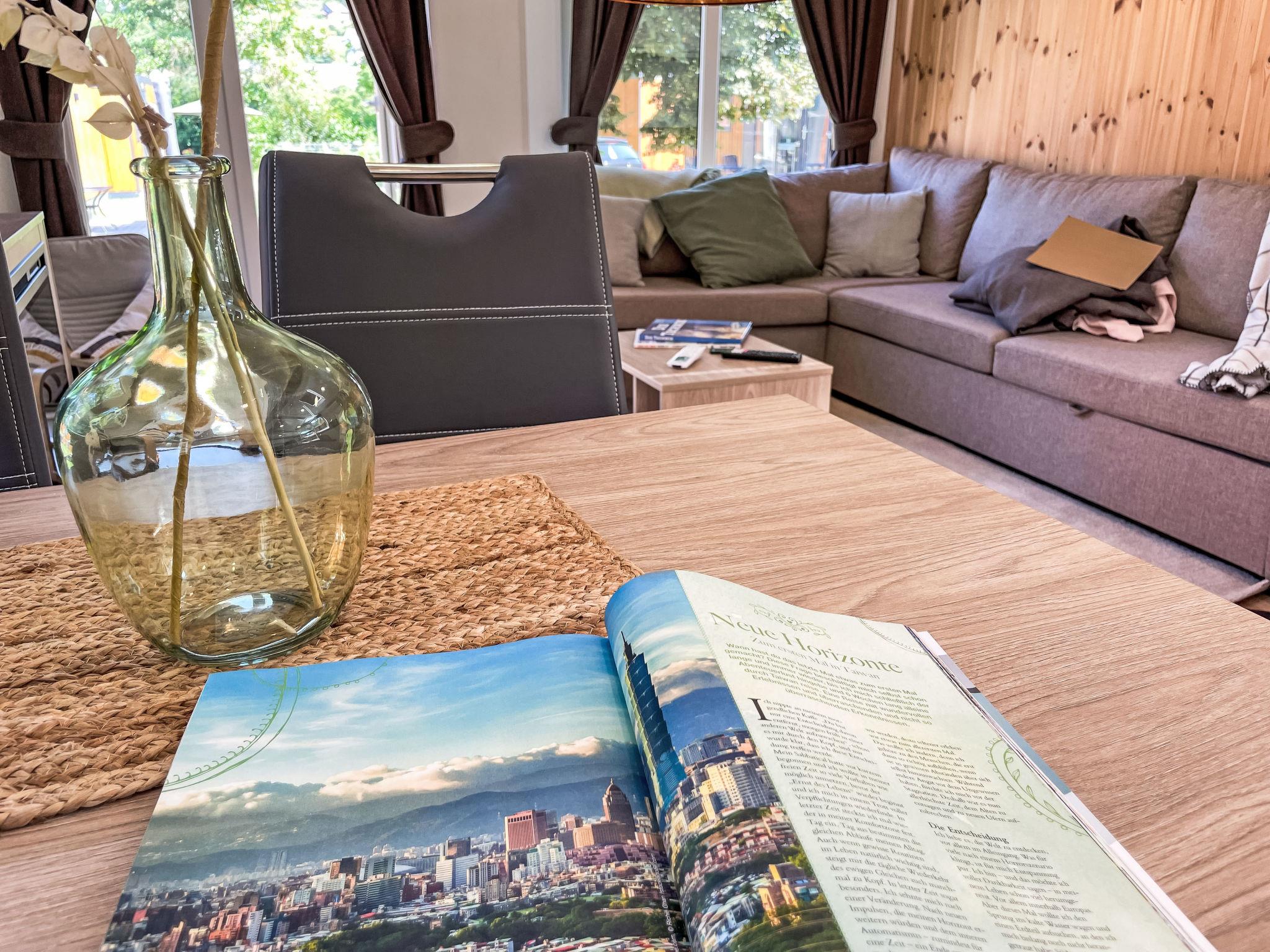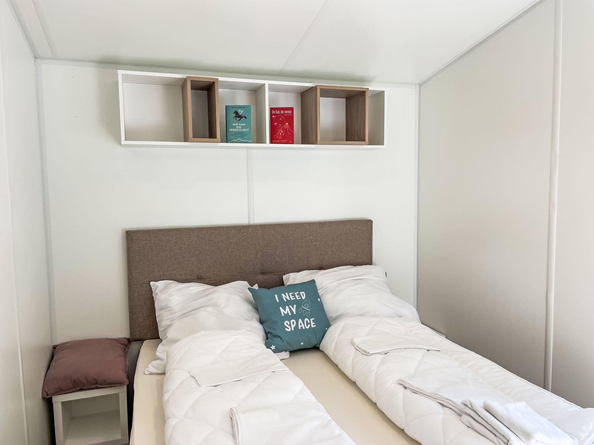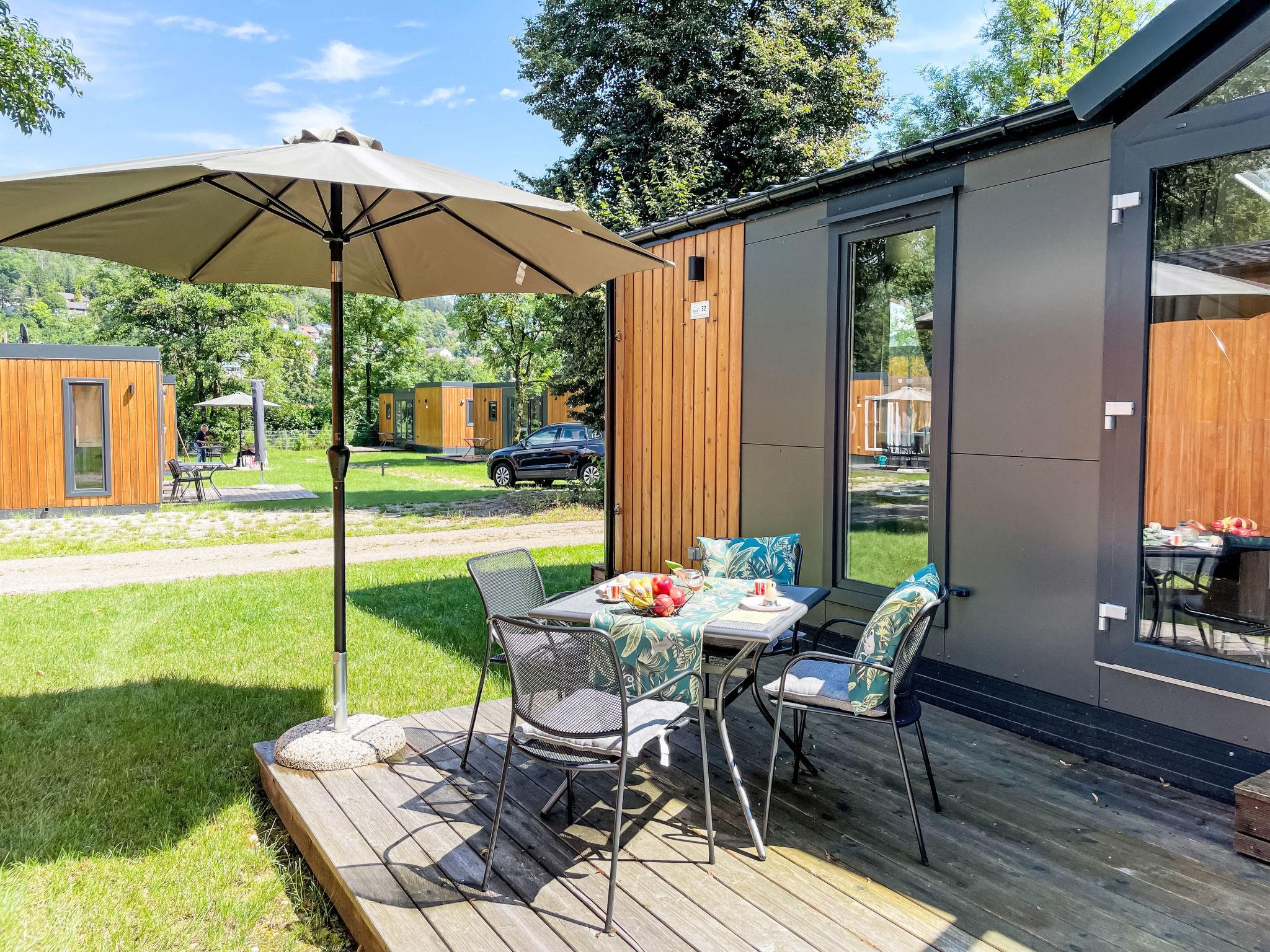 "Tiny Haus ChrisTine", 3-room mobile home 48 m2. Object suitable for 2 adults + 4 children. Comfortable furnishings: living/sleeping room with 1 double sofabed (160 cm, length 200 cm), Scandinavian wood stove (only for decoration), satellite TV and air conditioning. Exit to the terrace. 1 room with 1 french bed (160 cm, length 200 cm). 1 room with 2 beds (80 cm, length 200 cm). Open kitchen (oven, dishwasher, 4 ceramic glass hob hotplates, kettle, freezer, electric coffee machine). Shower, sep. WC. Small terrace. Terrace furniture. Facilities: washing machine. Parking at the house. Please note: non-smokers only.