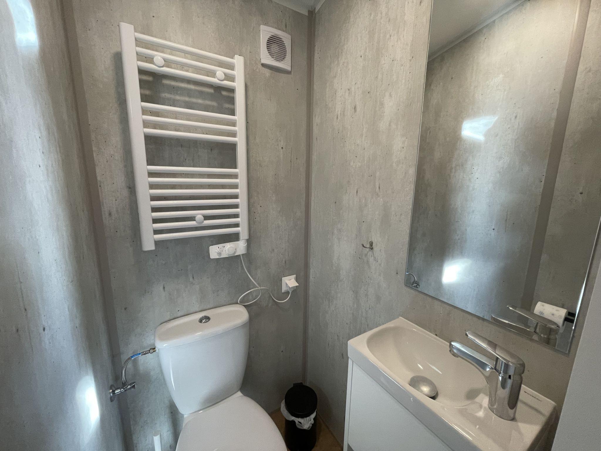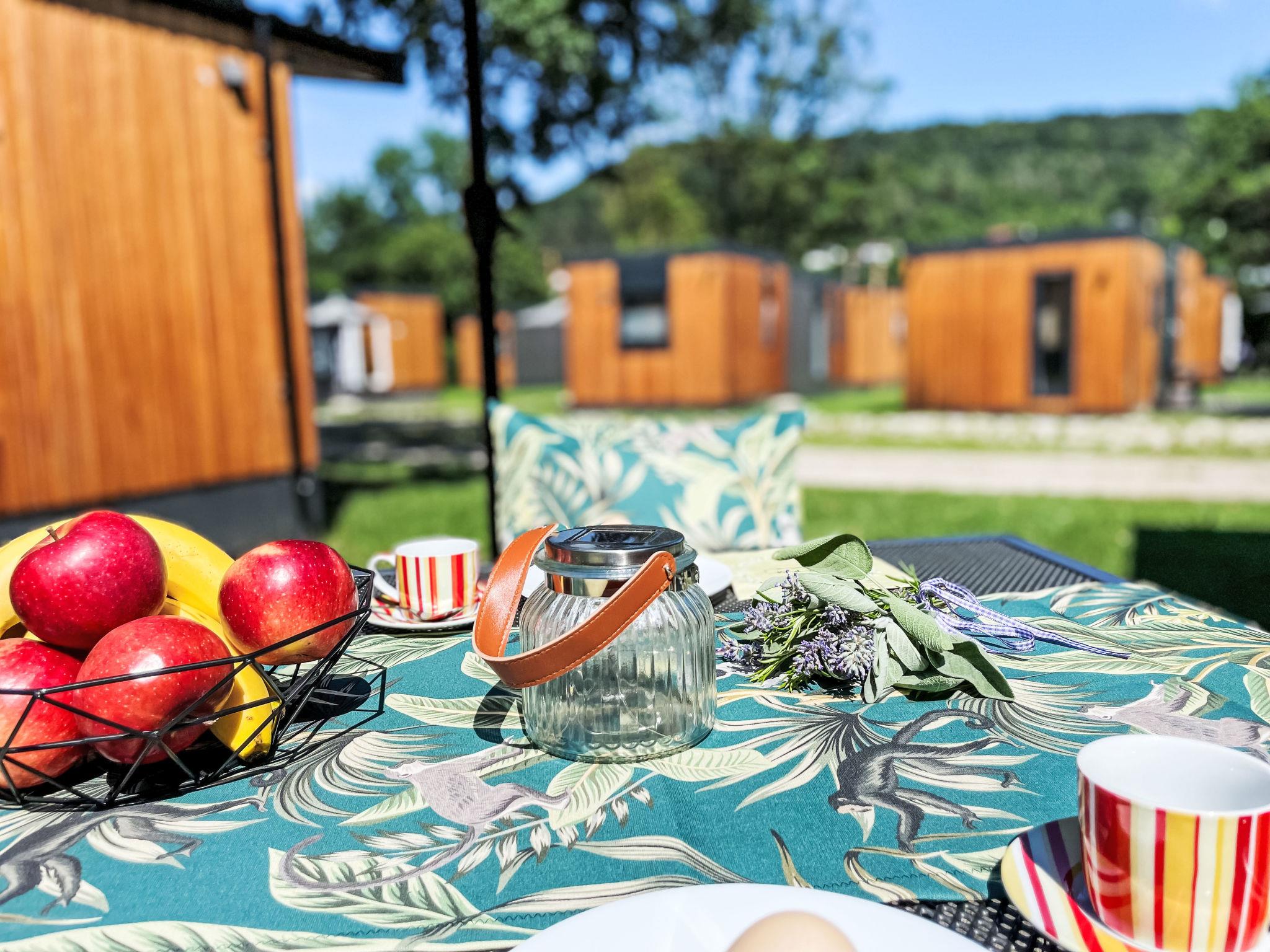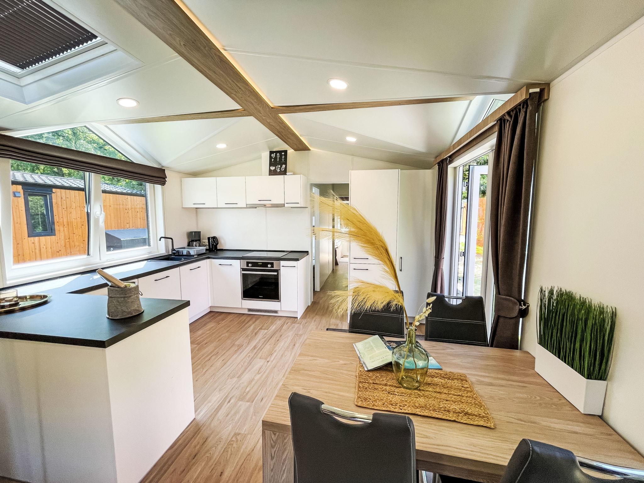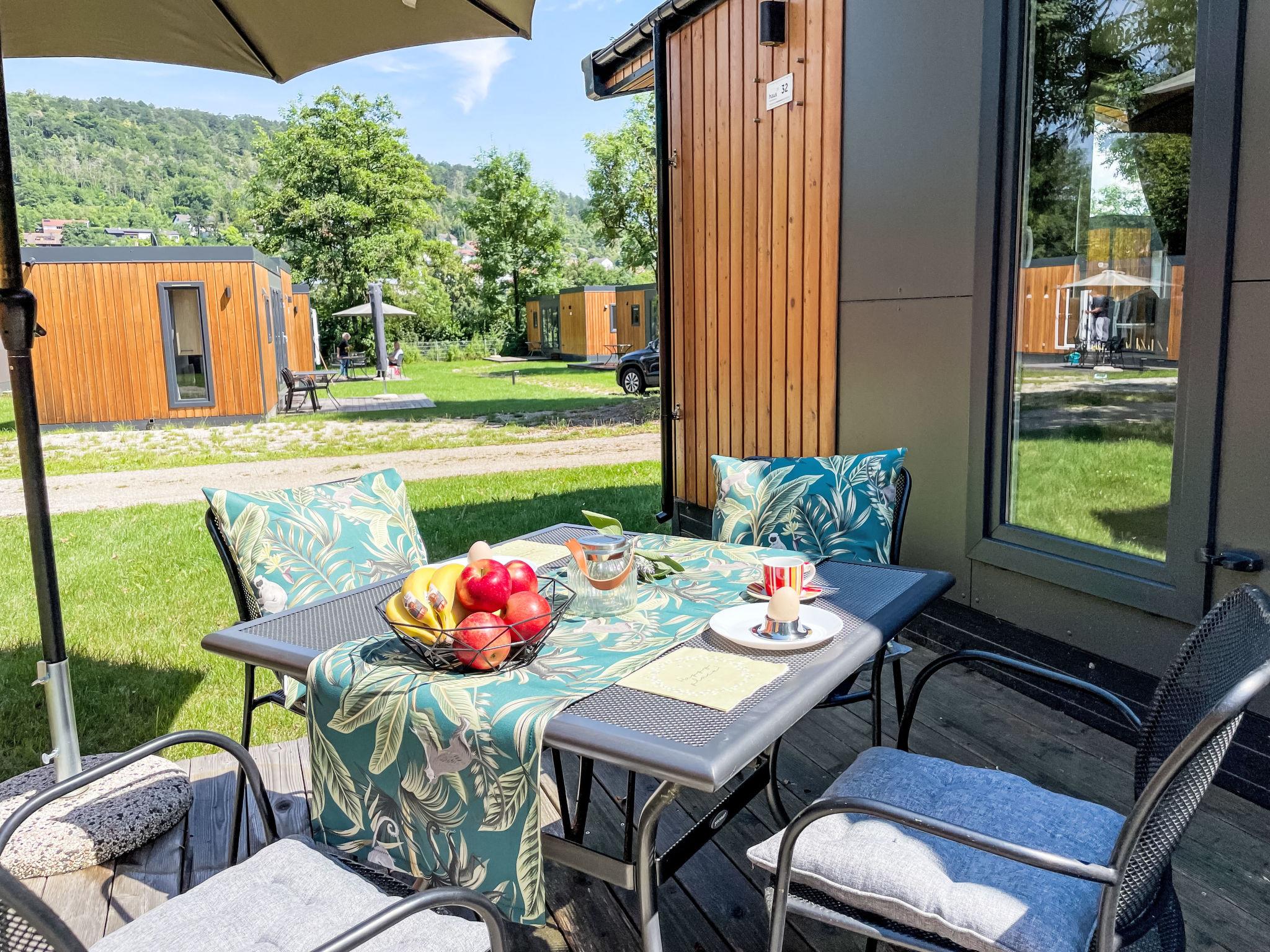 "Tiny Haus ChrisTine", 3-room mobile home 48 m2. Object suitable for 2 adults + 4 children. Comfortable furnishings: living/sleeping room with 1 double sofabed (160 cm, length 200 cm), Scandinavian wood stove (only for decoration), satellite TV and air conditioning. Exit to the terrace. 1 room with 1 french bed (160 cm, length 200 cm). 1 room with 2 beds (80 cm, length 200 cm). Open kitchen (oven, dishwasher, 4 ceramic glass hob hotplates, kettle, freezer, electric coffee machine). Shower, sep. WC. Small terrace. Terrace furniture. Facilities: washing machine. Parking at the house. Please note: non-smokers only.